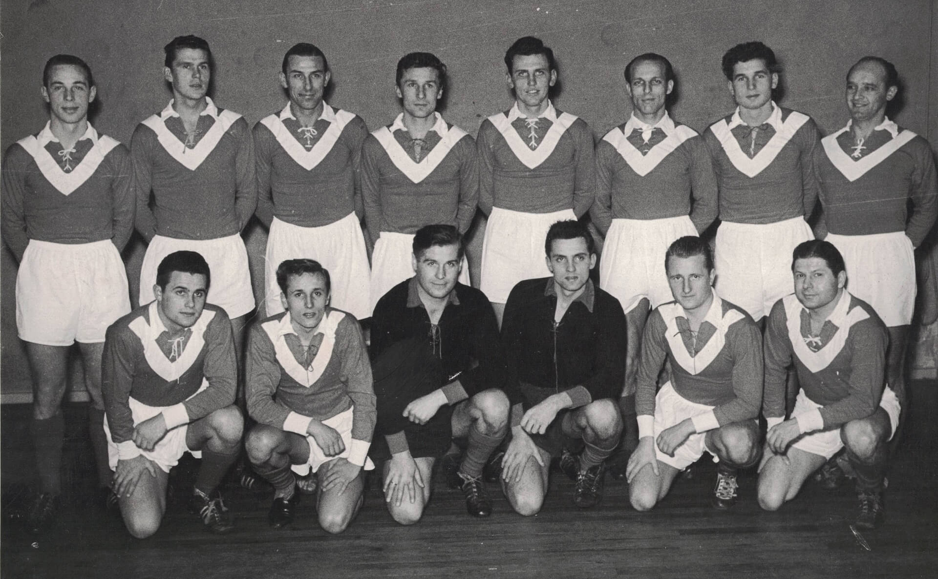 Stehend: unbekannt, Klaus Fetting, Heinz Wewers, unbekannt, Helmut Jahnke , Michael Pfeiffer, Willi Bodemeier, Willi Köchling – Knieend: Walter Zastrau, Heinz Hornig, Fritz Herkenrath, Werner Morawski, Willi Vordenbäumen, Franz Islacker
