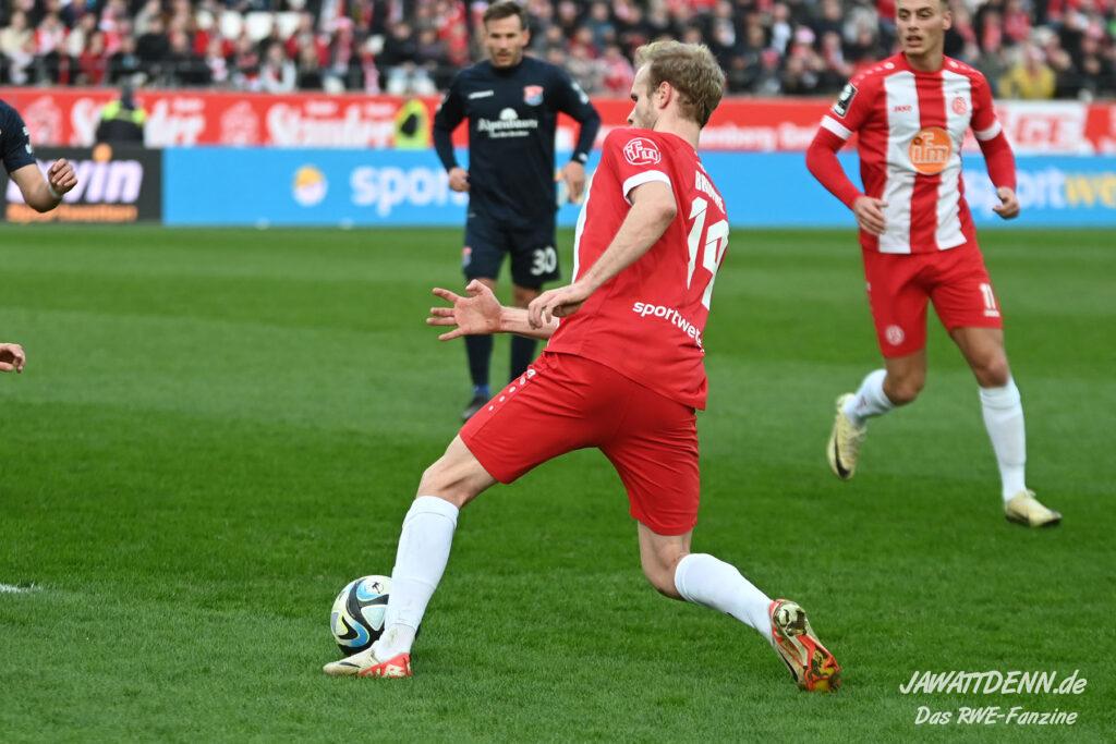 RWE siegt nach großem Kampf mit 2:0 in Mannheim. Glück muss man sich bekanntlich erarbeiten und genau das tat eine leidenschaftlich kämpfende rot-weisse Mannschaft, die sich trotz großer Personalsorgen mit drei Punkten in einem mitreißenden Drittligaspiel bei starken Mannheimern belohnen konnte.
