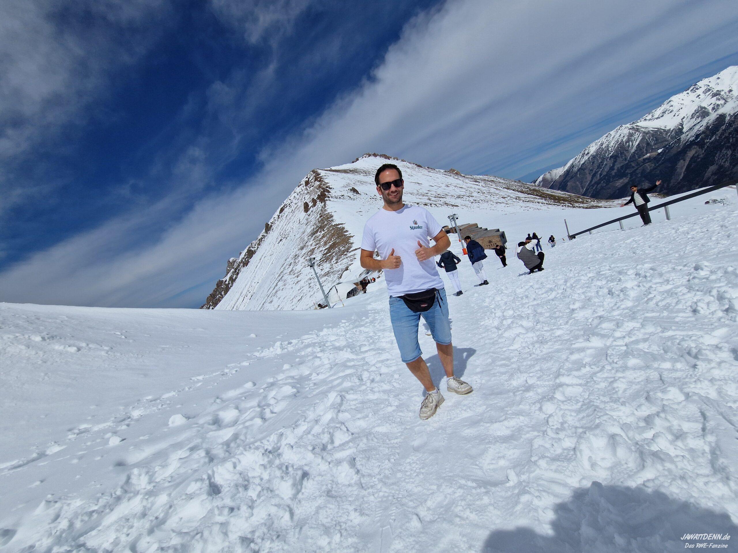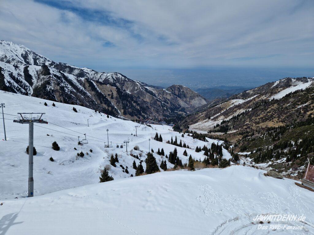 Nach zwei Umstiegen und drei Gondelfahrten erreichten wir auf 3156 Metern endlich die höchste Ebene und stapften mit kurzer Hose und T-Shirt durch den Schnee. Die Sonne ermöglichte uns eine prächtige Aussicht auf die vielen Berggipfel des Skigebiets und hinab auf die größte Stadt Kasachstans.