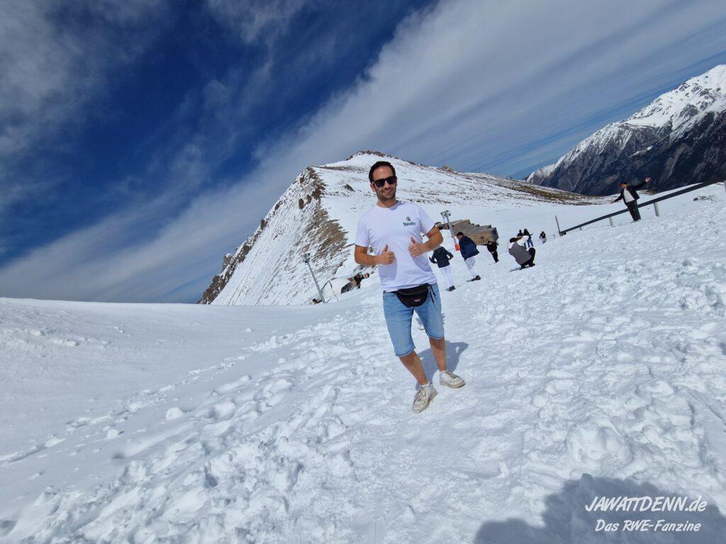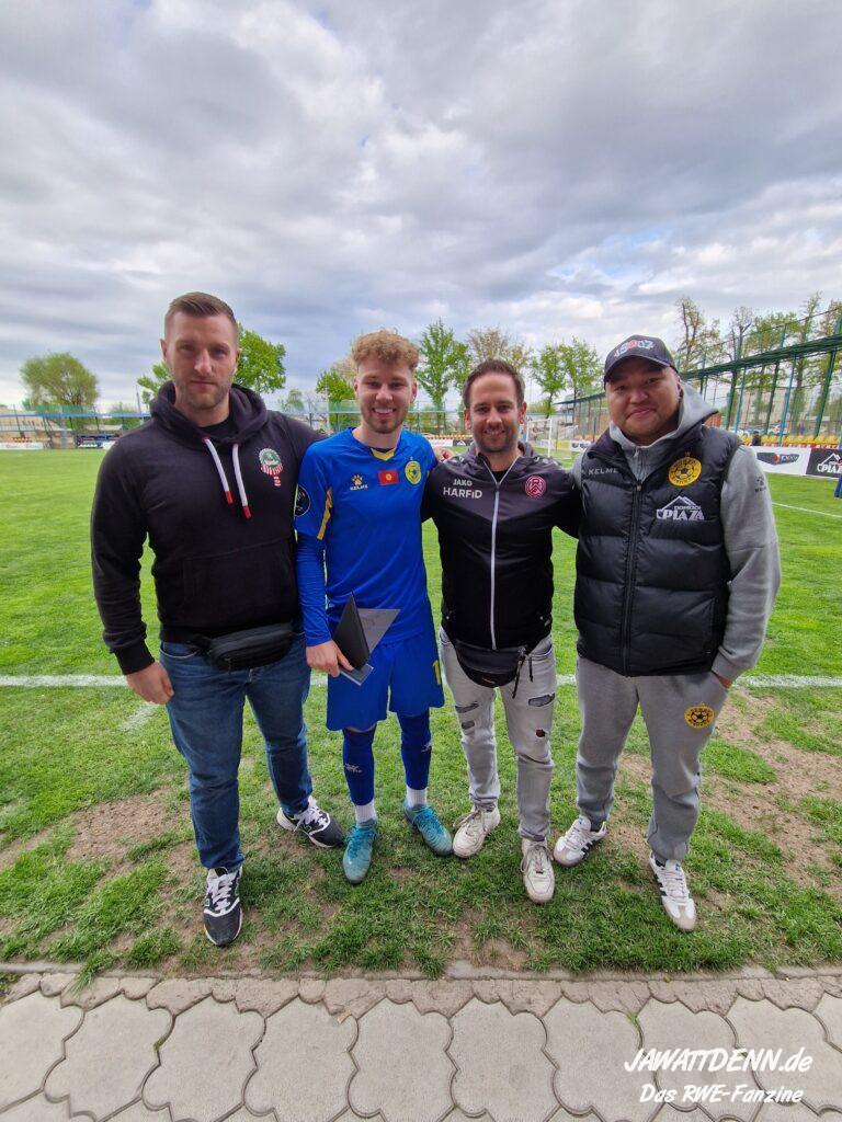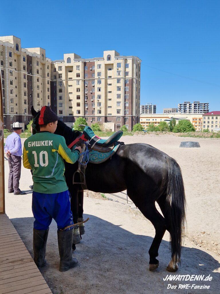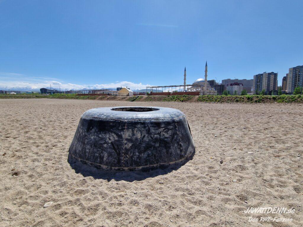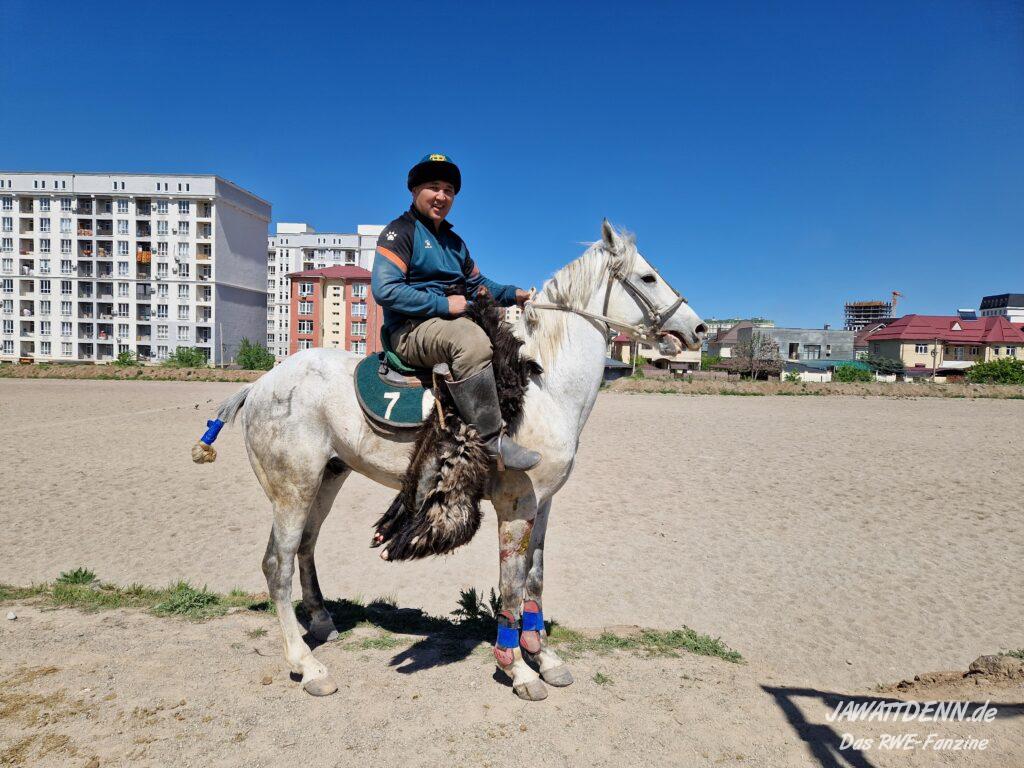 Im Vorfeld der Reise gab es regen Austausch mit dem deutschsprachigen Ruslan, der uns als hauptberuflicher Teammanager von Dordoi aus einem Podcast bekannt war. Ruslan hat drei Jahre in Deutschland gelebt, wo er soziale Arbeit für behinderte Menschen geleistet hat. Die Bundesliga, allem voran Borussia Dortmund, verfolgt er heute noch. Nach herzlicher Begrüßung am Spielfeldrand überreichten wir unsere Gastgeschenke: Einen BVB-Wimpel und eine RWE-Cappy, die allerdings ganz offensichtlich nicht für die landestypischen Kopfformen ausgelegt war.