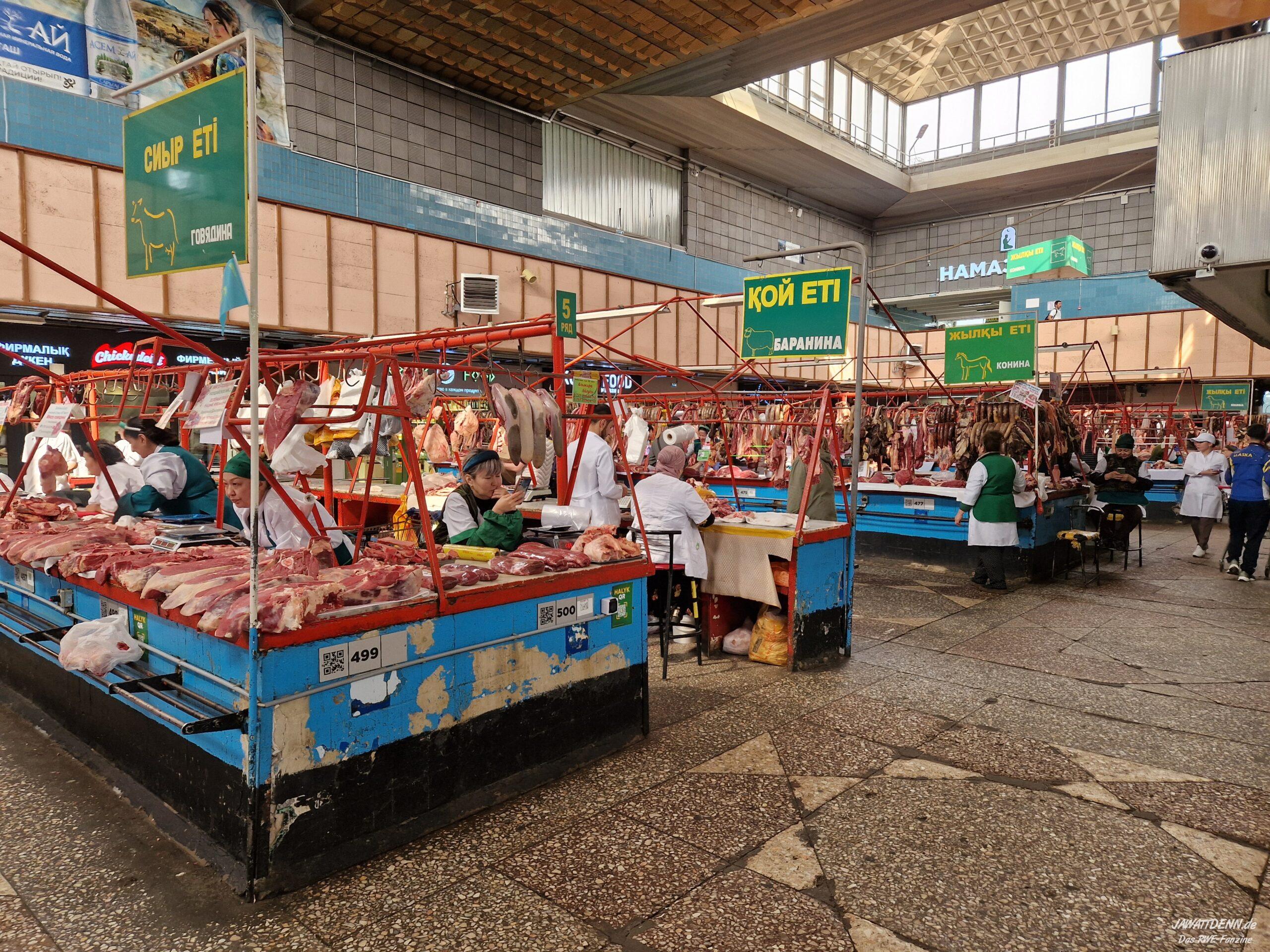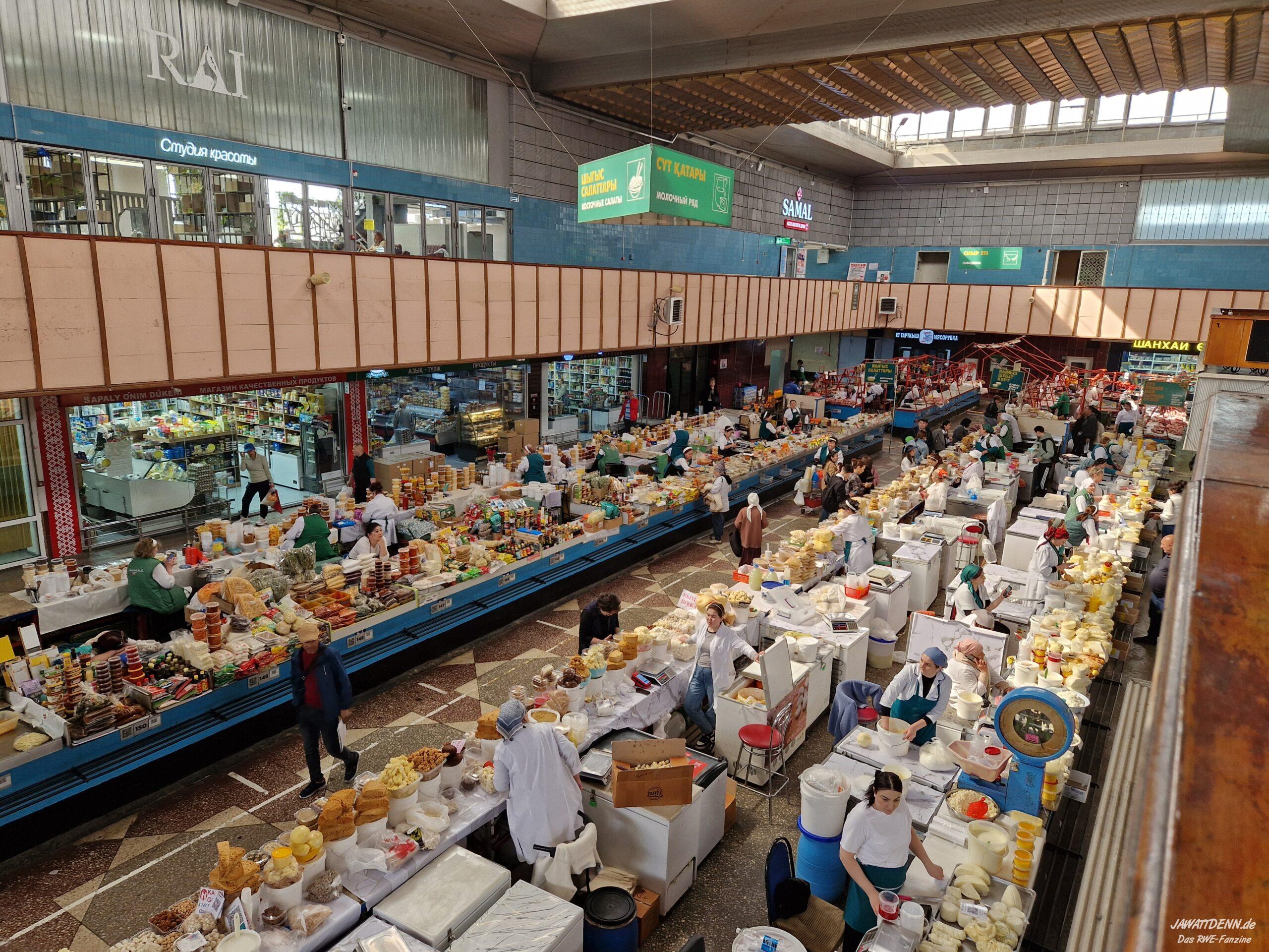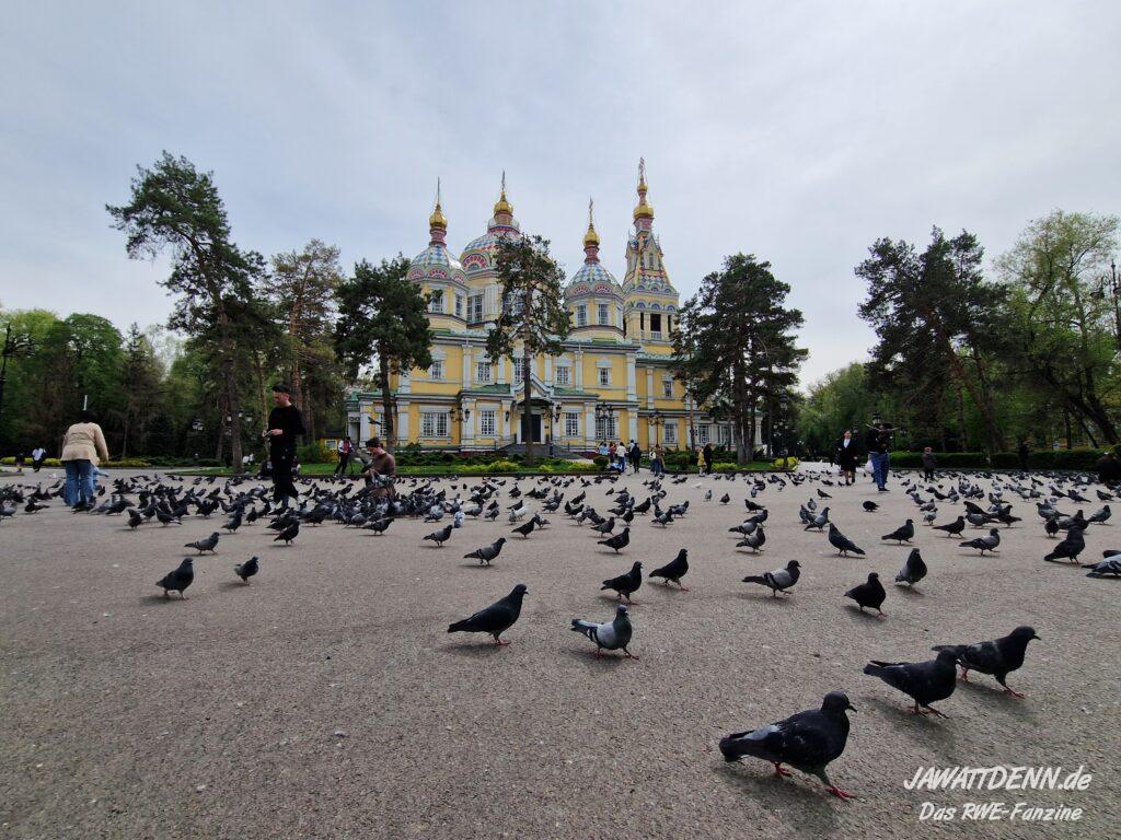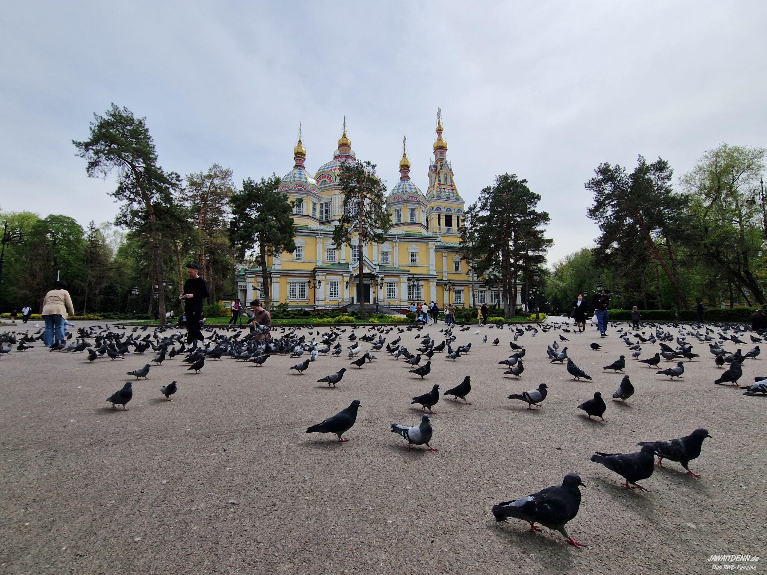 Almaty selbst ist nicht unbedingt reich an großen Sehenswürdigkeiten. Die Christi-Himmelfahrt-Kathedrale ist ganz nett anzuschauen, genauso wie das Treiben auf dem mit Tauben übersäten Vorplatz. Wer neue Klamotten, allerlei Gewürze, Trockenfrüchte, einen Kringel Pferdewurst oder einen abgetrennten Schweinekopf kaufen möchte, ist auf dem Kök Bazaar, dem Grünen Basar, an der richtigen Adresse. Hier lässt es sich auch gut und günstig speisen: Für zwei Teller Pilaw, einem Reisgericht mit Fleisch, sowie zwei Getränken, wurden insgesamt nur 8 € fällig. Liebhabern des architektonischen Brutalismus empfiehlt es sich, einfach durch die Straßen der ehemaligen Hauptstadt Kasachstans zu streifen, um auf seine Kosten zu kommen.