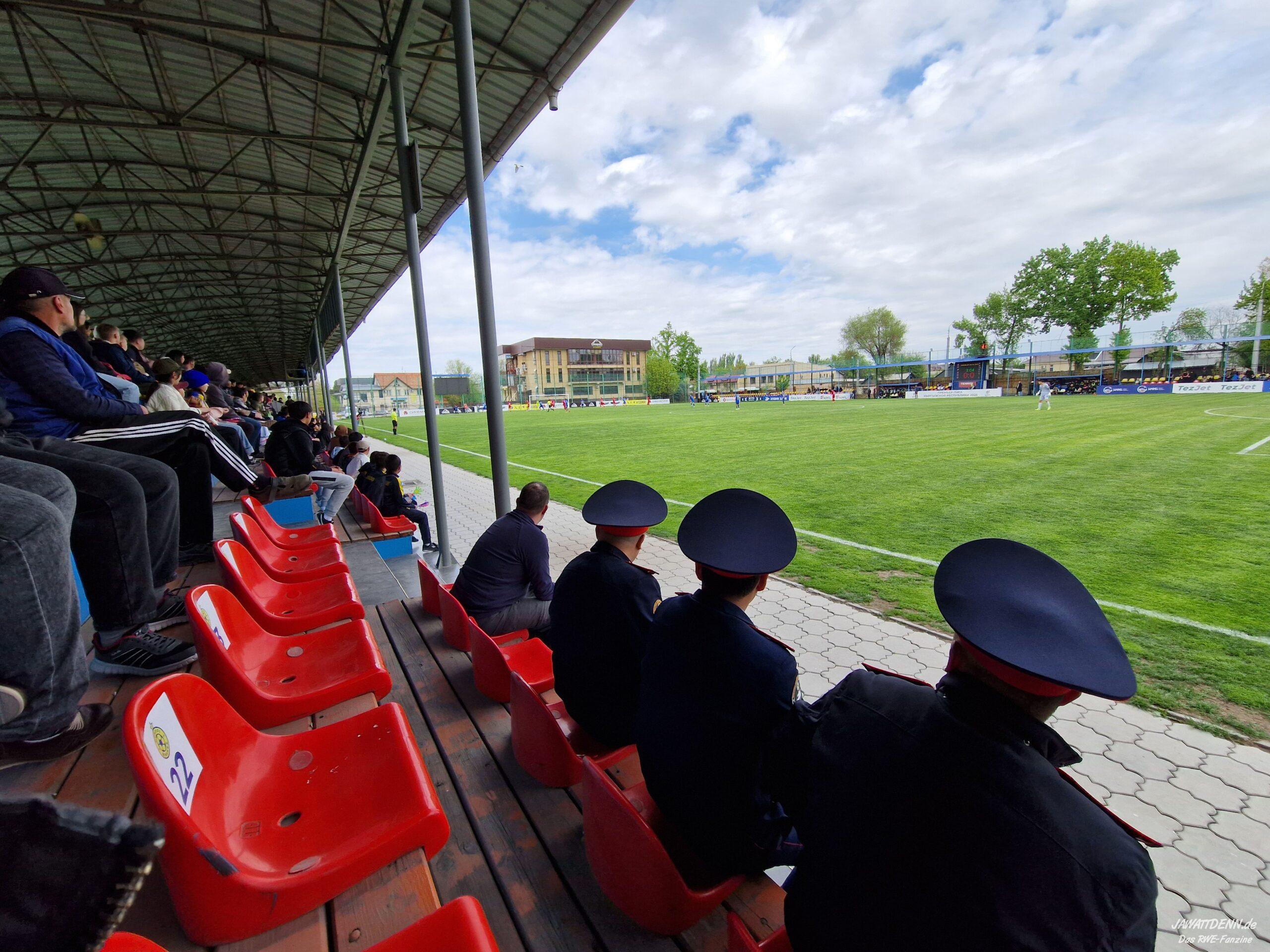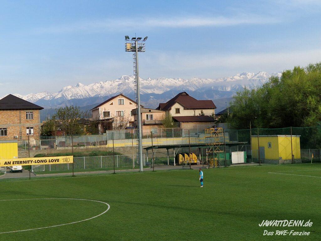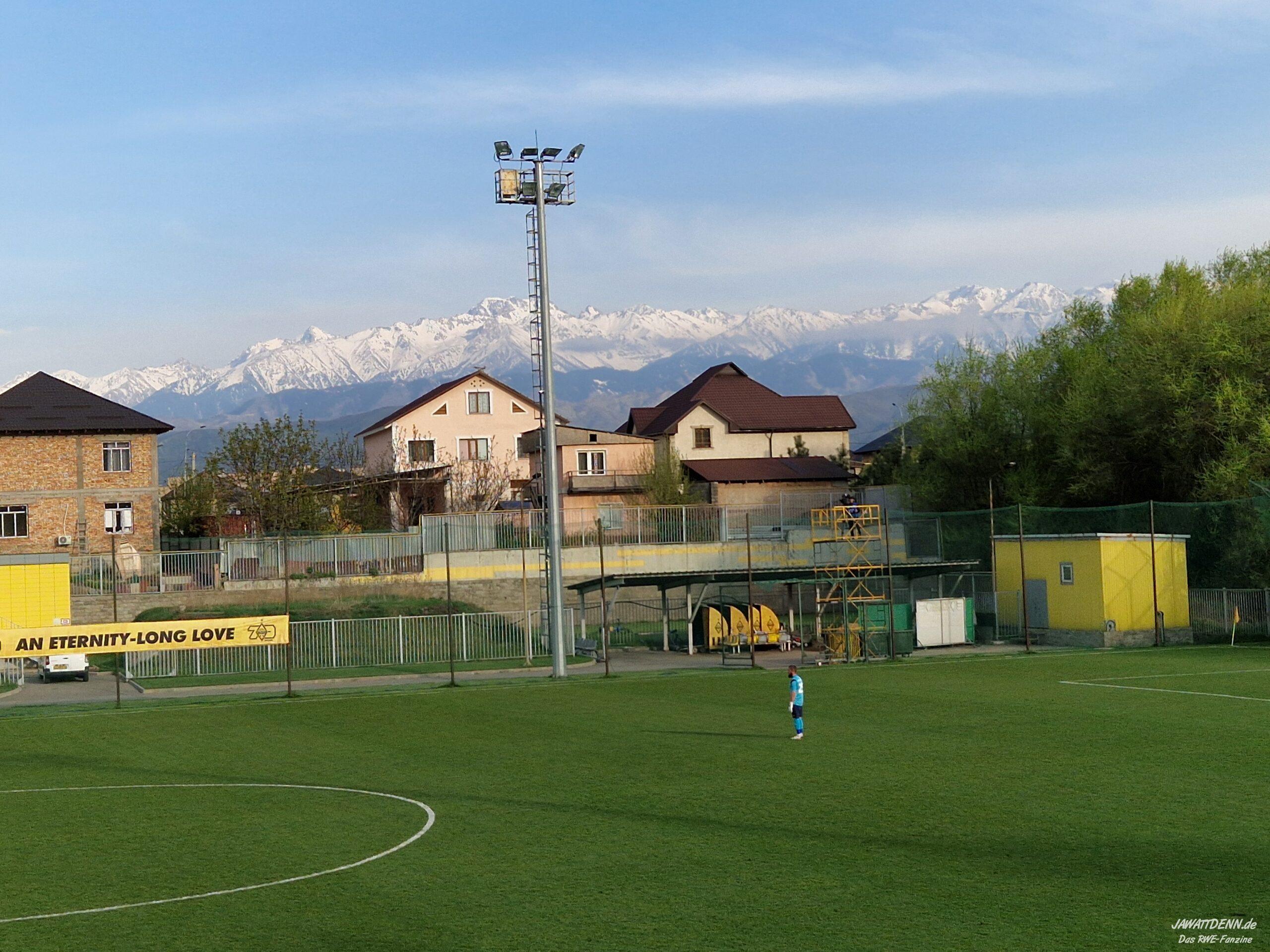 Bei freiem Eintritt fanden sich 300 Zuschauer zum „Derby“ gegen FC Khan Tengri ein. Das Stadïon Akademïï T.S. Segïzbaeva konnte mit einer kleinen, aber feinen Tribüne und einem traumhaften Bergpanorama punkten. Vor dieser Kulisse versuchten sechs Knaben mit Zaunfahne, Trommel und Gesang etwas Leben in die Hütte zu kriegen. Für mehr Erheiterung sorgte jedoch ein aufgebrezeltes Mädel auf der Tribüne, das frühzeitig als Spielerfrau ausgemacht wurde. Der Verdacht erhärtete sich, als der Kairat-Torwart nach einem Zusammenprall behandelt werden musste. Sicherlich kein Akt aus der Mitch-Kniat-Schauspielschule, aber gute Überlebenschancen hatten wir aus der Entfernung eingeräumt. Die besagte Dame war derweil auf der Tribüne völlig in Tränen aus- und fast zusammengebrochen. Nur ihre Stöckelschuhe verhinderten es, schnell genug auf den Platz zu kommen, bevor der Göttergatte wieder auf den Beinen war und den 2:1-Sieg sogar noch auf dem Feld miterleben konnte.