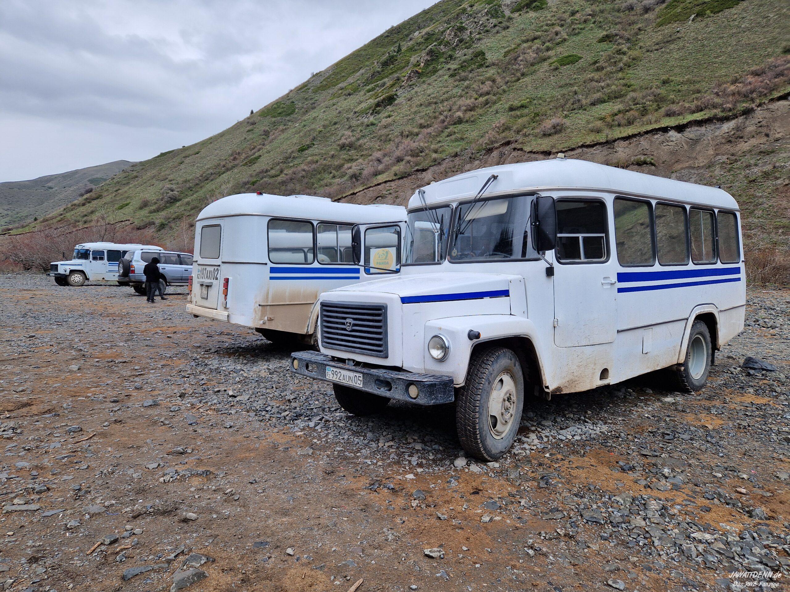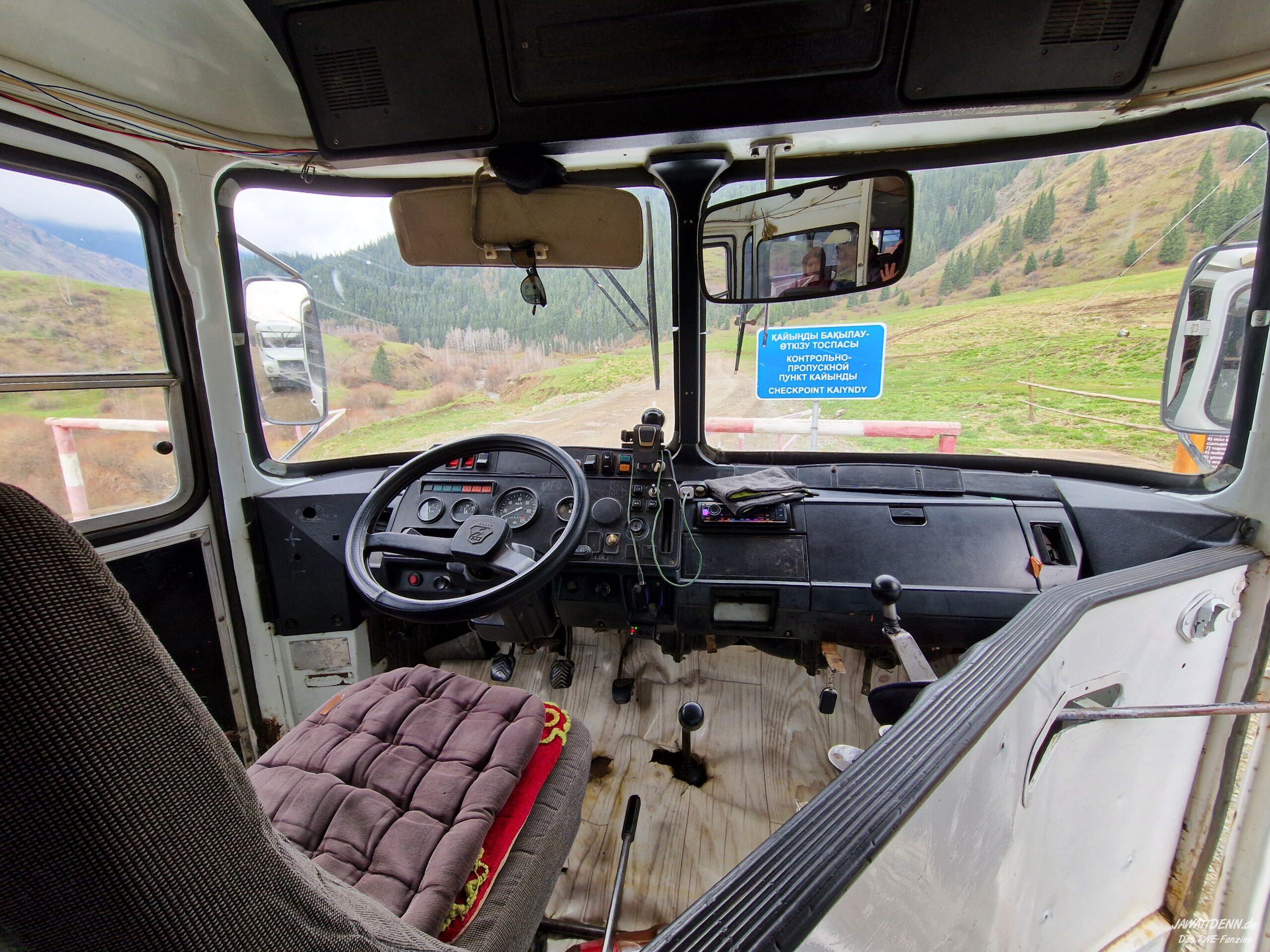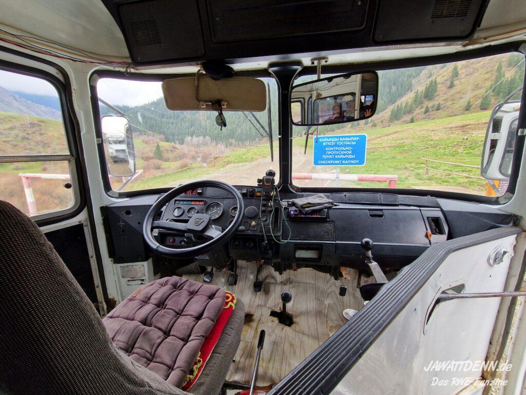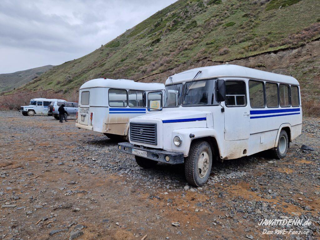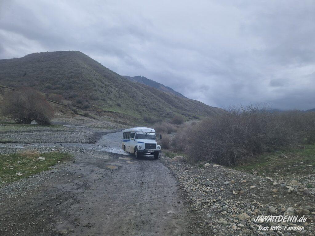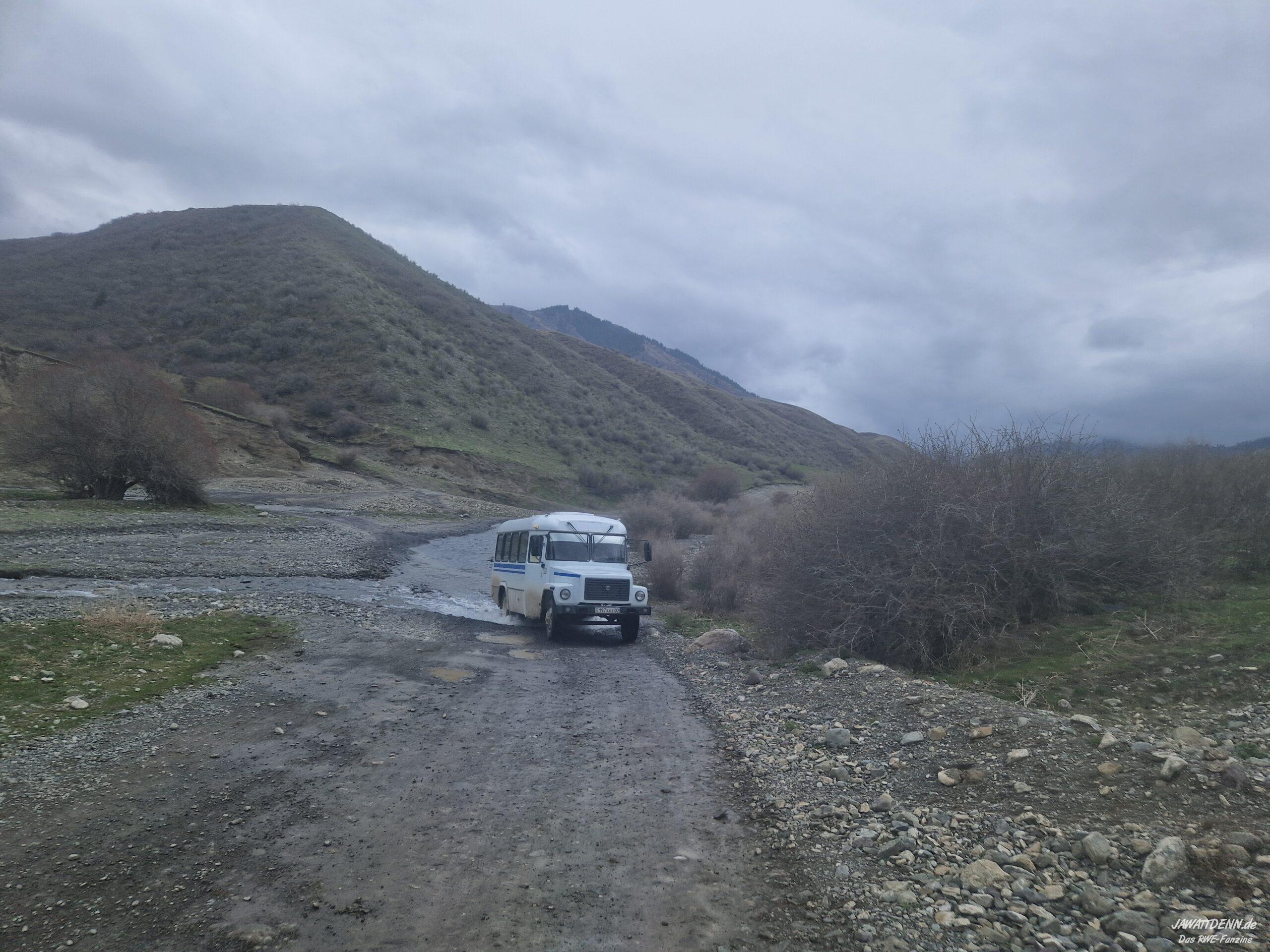 Im Nachhinein muss diese Etappe allerdings als Kindergeburtstag eingestuft werden. Denn nach der drei stündigen Fahrt an den Rand des Kungej-Alatau-Gebirges, waren wir noch nicht am Ziel. Da die letzten 30 Minuten durch sehr unwegsames Gelände führten, musste die ganze Besatzung nun in einen KAvZ-Bus aus Sowjetzeiten umsteigen. Ein traumhaft-trauriger Trümmerhaufen auf Rädern. Von Straßen, über die unser Weg führte, konnte keine Rede mehr sein. Der Bus fuhr nicht über Stock und Stein, sondern über Geröll. Wir kreuzten Bachläufe und gerieten an den Abhängen immer wieder in bedenkliche Schieflagen. Alles wackelte, wie in einem Flugsimulator. Und es machte mindestens genauso viel Spaß. Ein 30-minütiger von Schreckmomenten durchzogener Lachkrampf. Es lässt sich wirklich kaum beschreiben, wie sehr man auf dieser Fahrt durchgeschüttelt und im Bus herumgeschleudert wurde. Anschnallgurte hatte die Karre vermutlich nicht mal ab Werk.