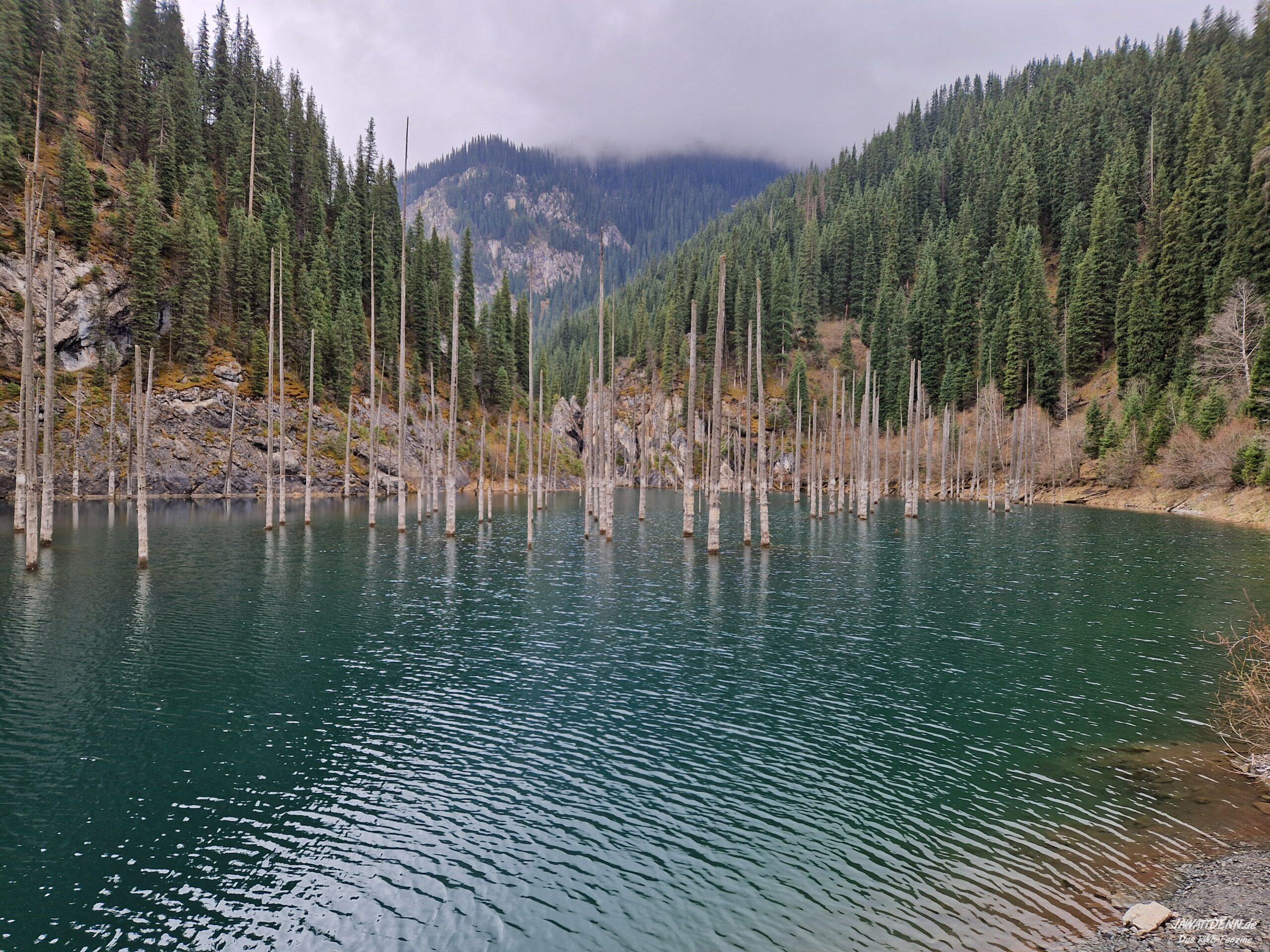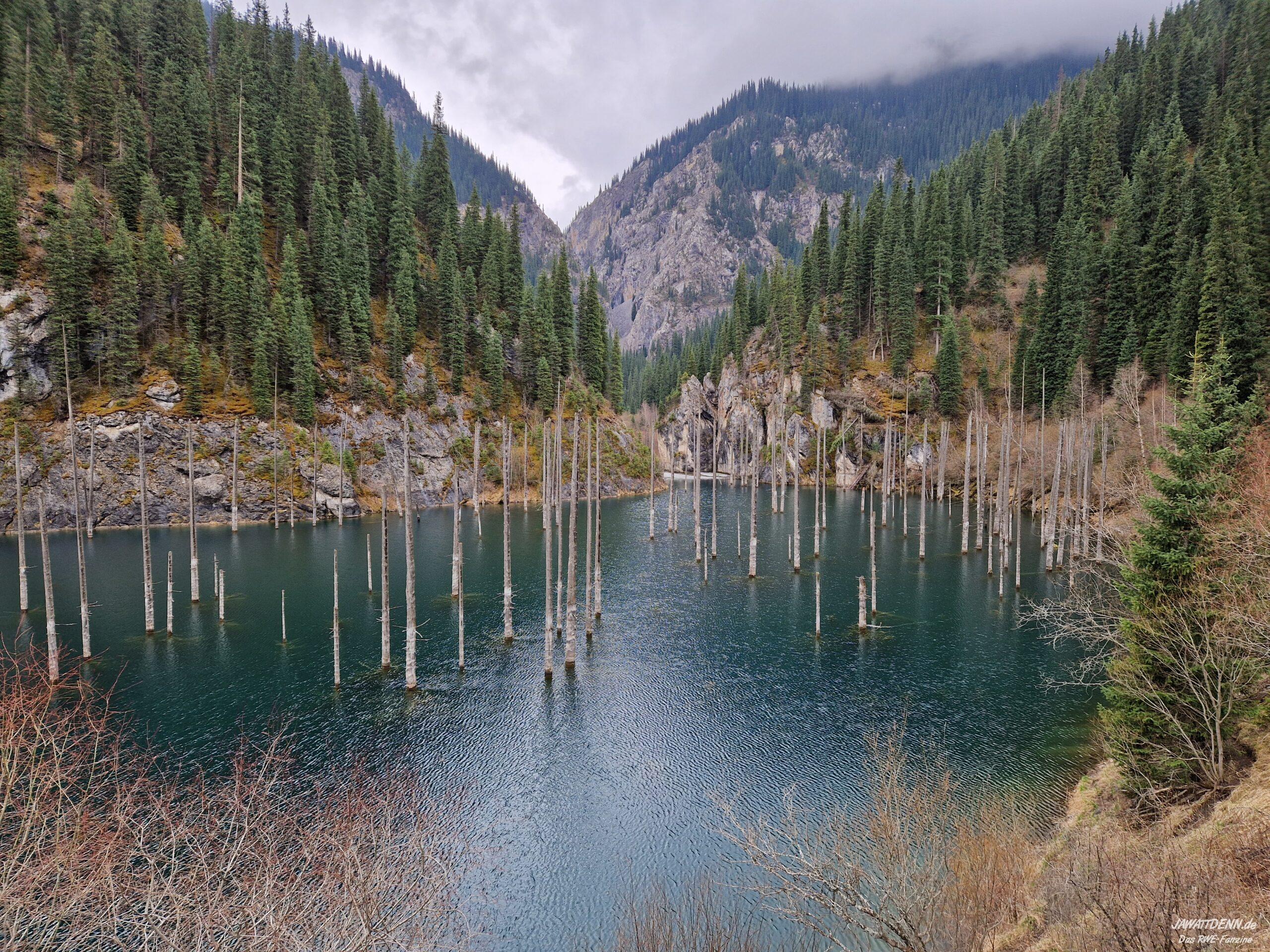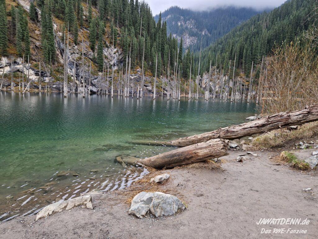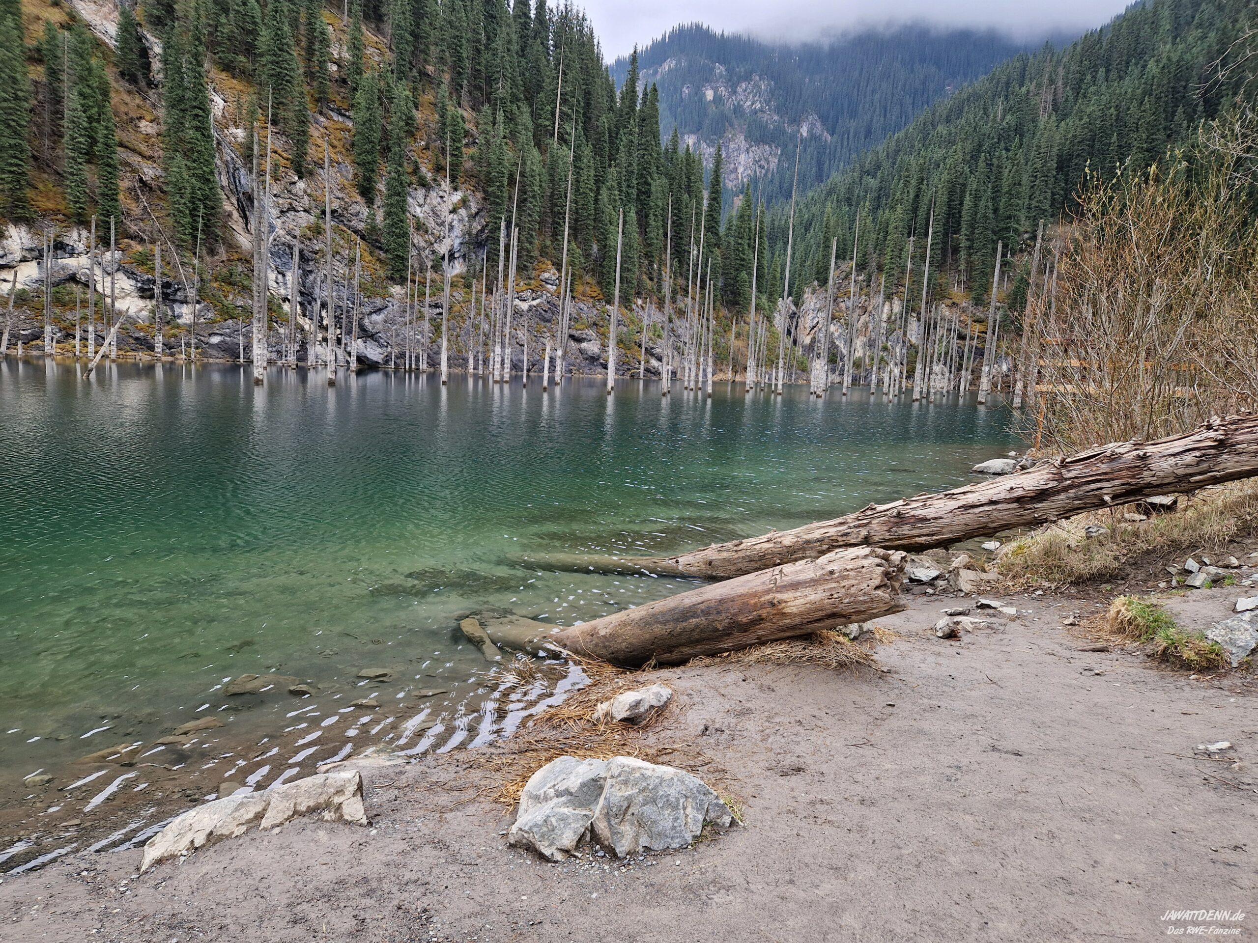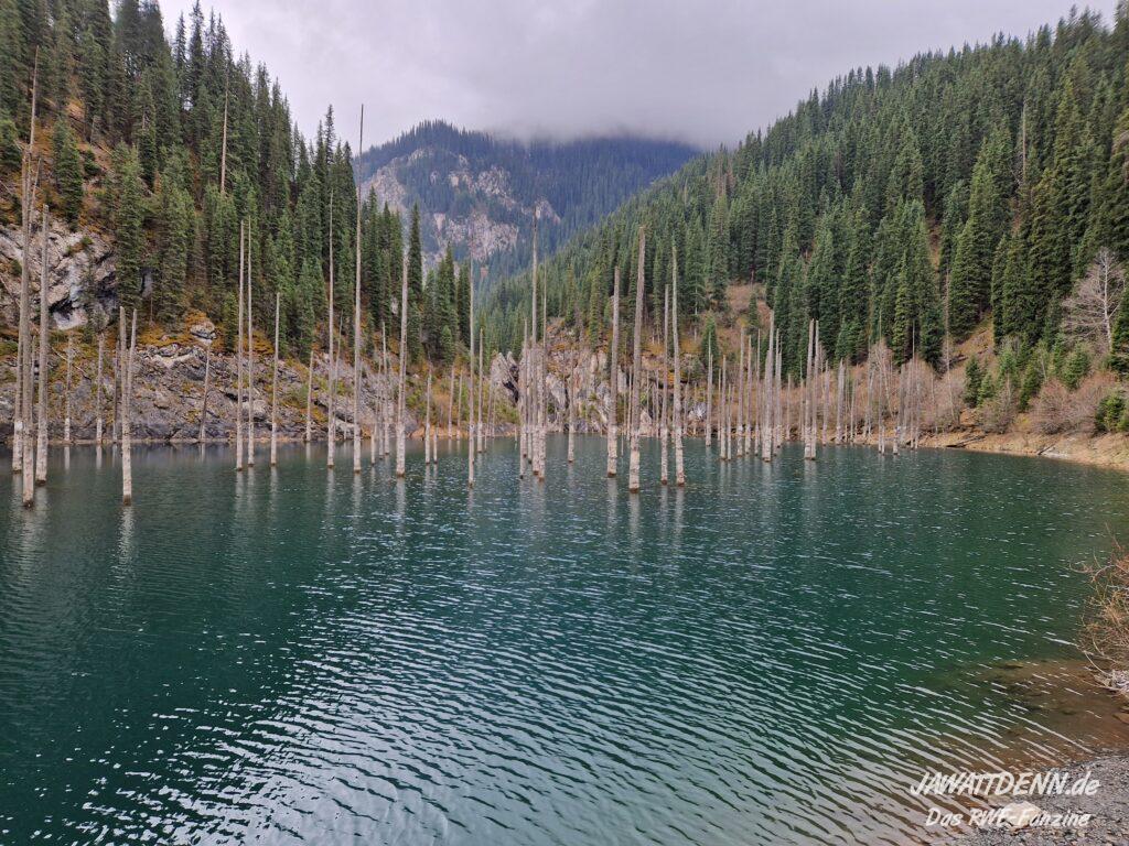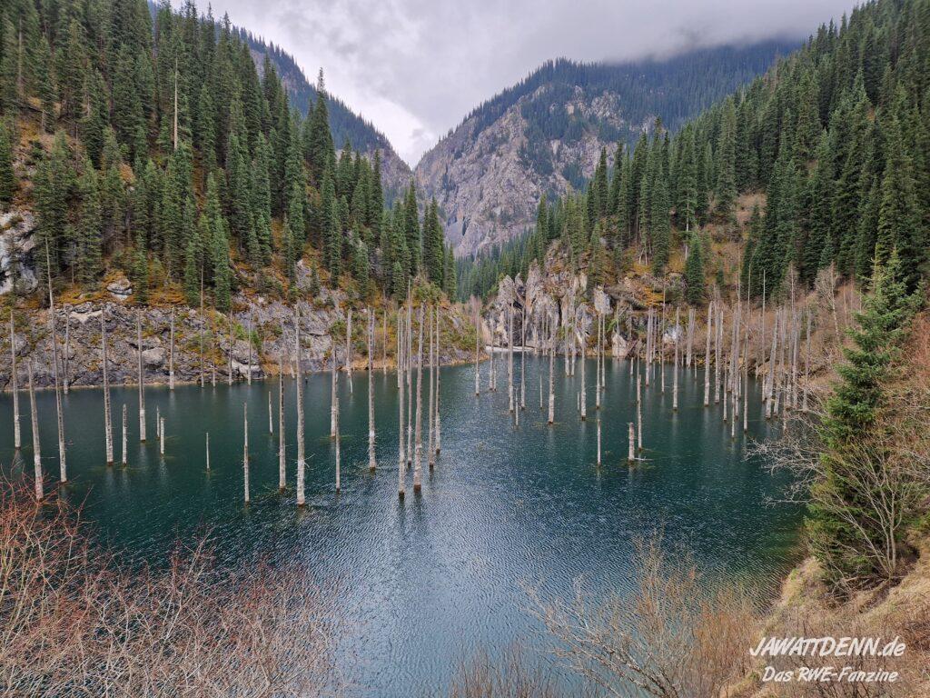 Nach überstandener Fahrt waren nur noch 30 Minuten zu Fuß durchs Gebirge zu wandern, um den mystischen Kaindy-See zu erreichen. Eine unberührte Farbenpracht mit der Besonderheit, dass abgestorbene Baumstämme aus dem klaren Wasser emporragen. Das Schauspiel ist ein Resultat der Entstehung des Sees, der sich 1911 durch ein Erdbeben aufgestaut hat.