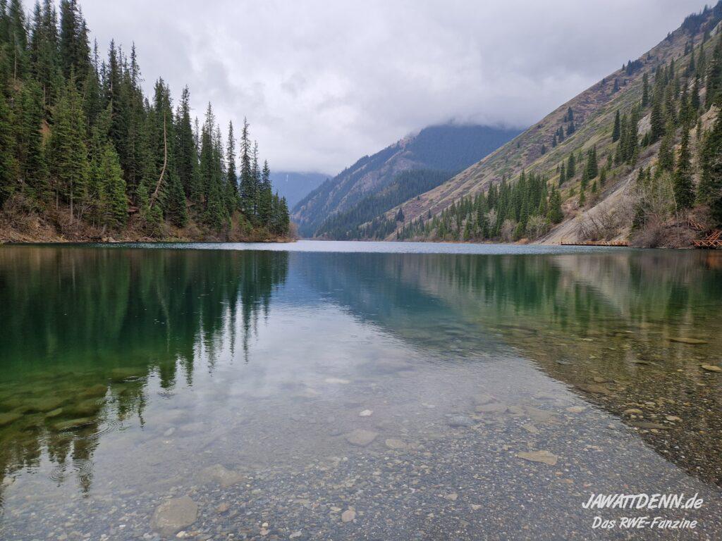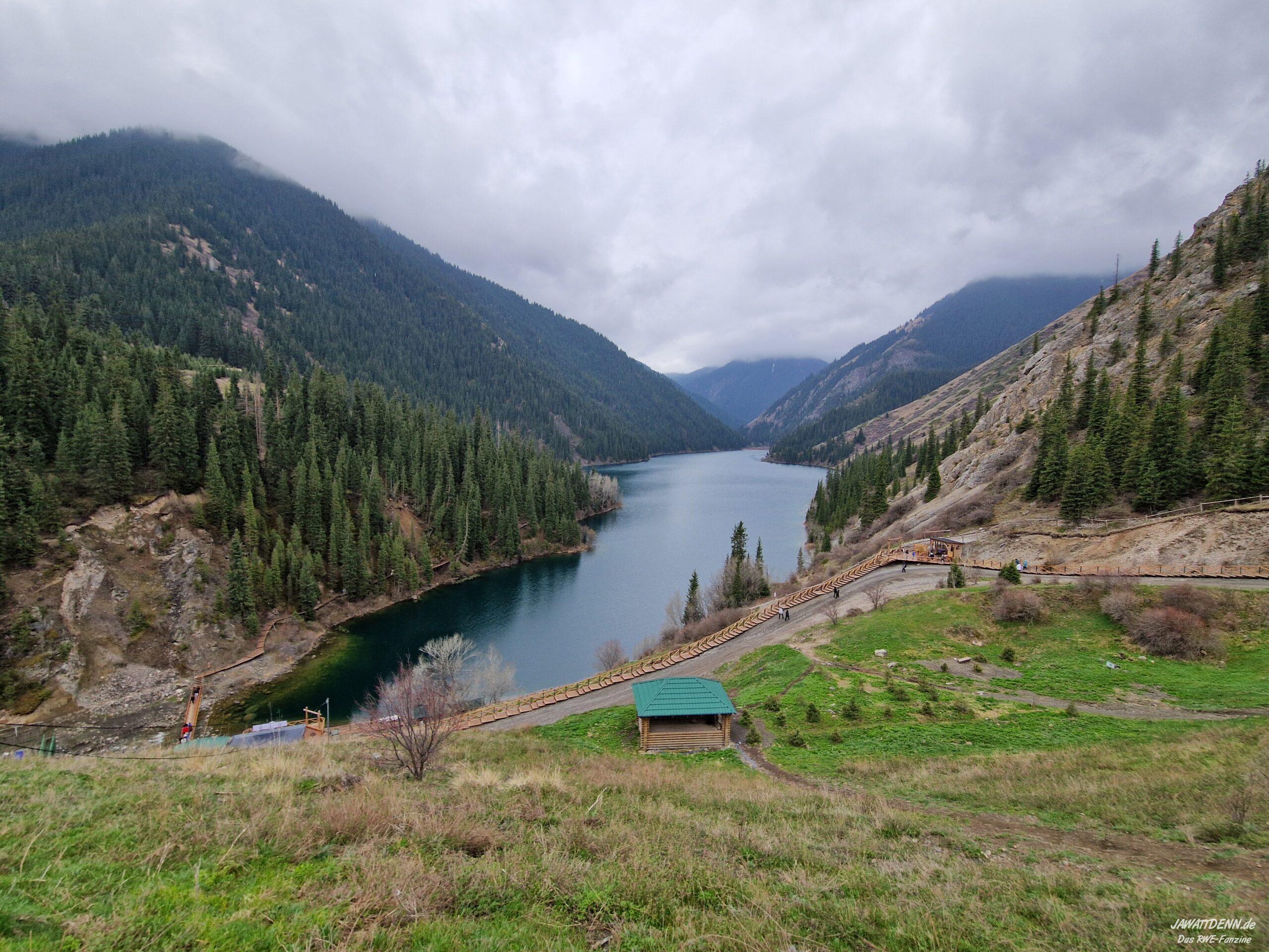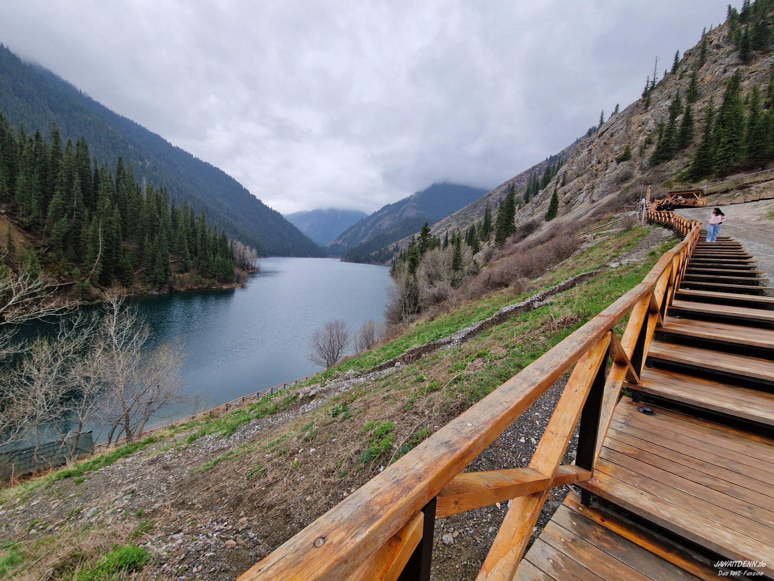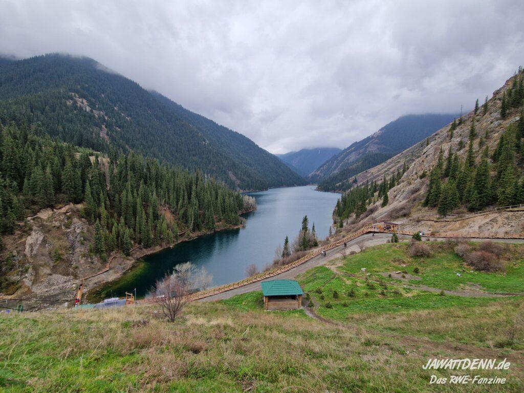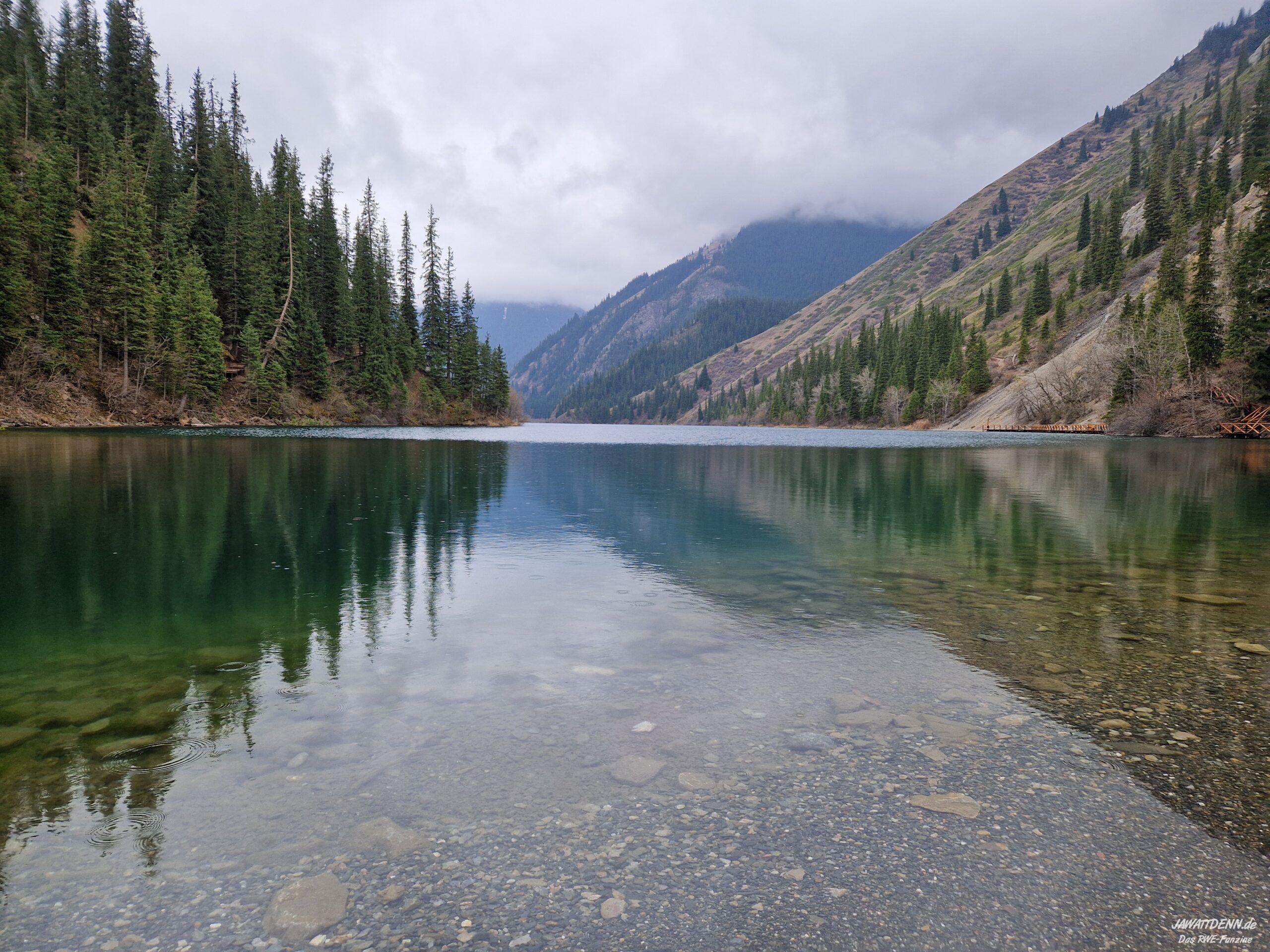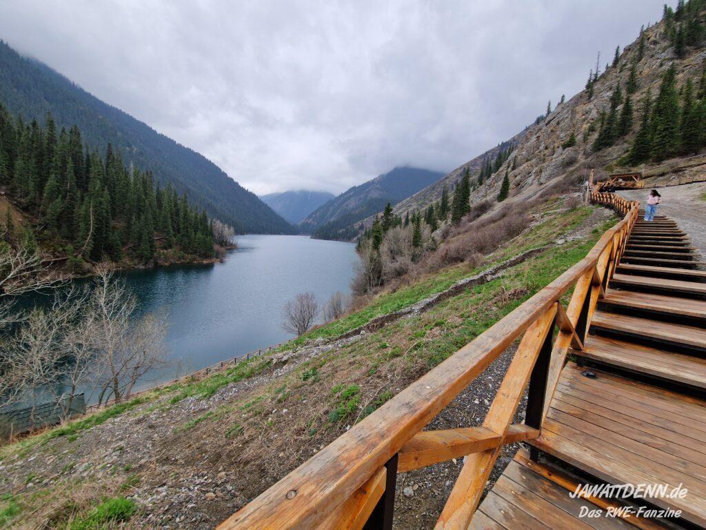 Nach überstandener Fahrt waren nur noch 30 Minuten zu Fuß durchs Gebirge zu wandern, um den mystischen Kaindy-See zu erreichen. Eine unberührte Farbenpracht mit der Besonderheit, dass abgestorbene Baumstämme aus dem klaren Wasser emporragen. Das Schauspiel ist ein Resultat der Entstehung des Sees, der sich 1911 durch ein Erdbeben aufgestaut hat.
