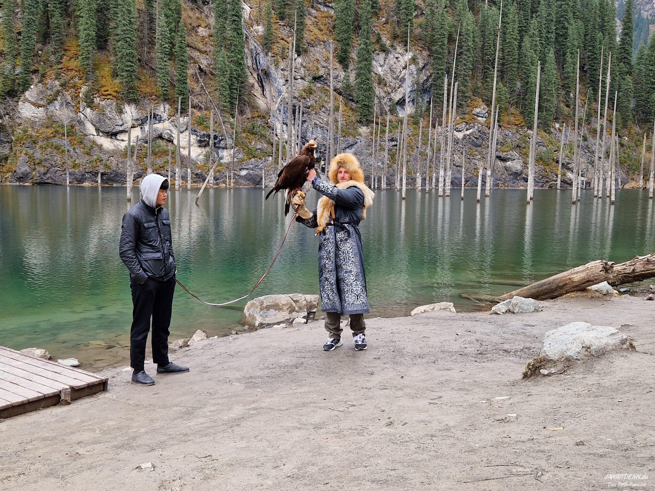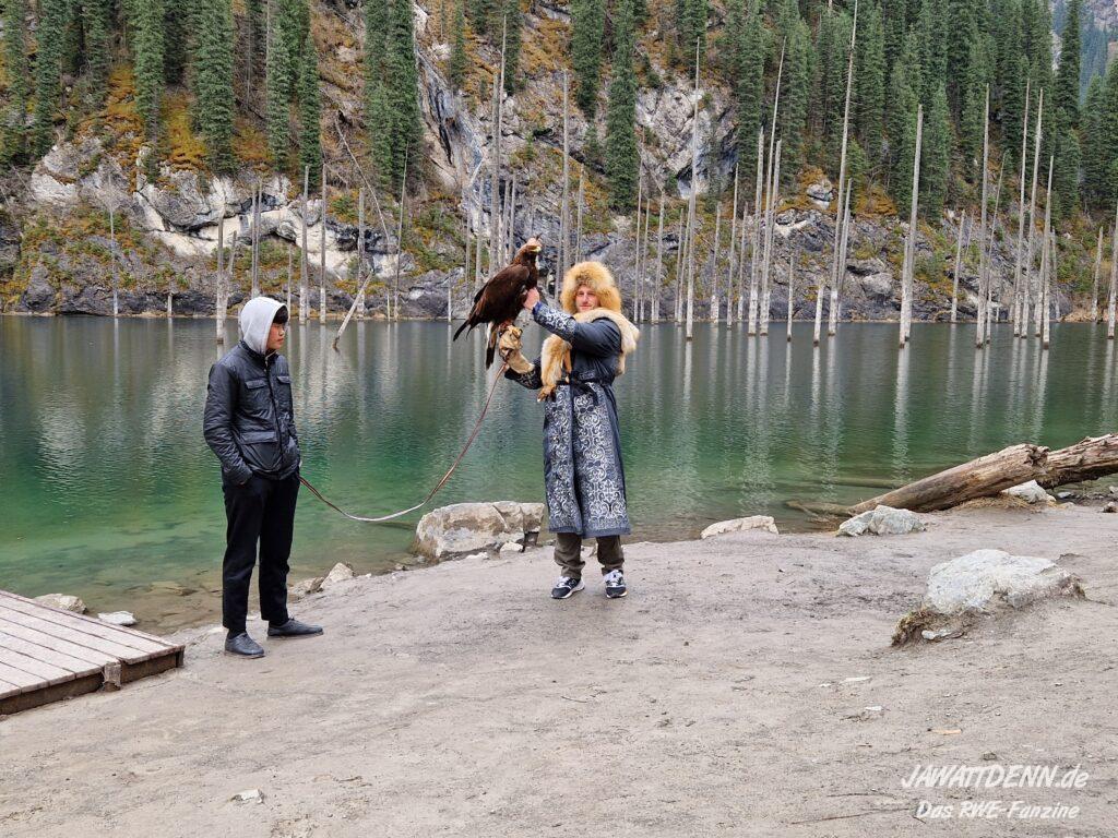Nachdem sich Wumme noch ganz dezent mit einem traditionellen Mantel, dem Tschapan, einer Fuchsfellmütze und einem Adler auf Faust hat ablichten lassen, ging es über die Buckelpiste weiter zum Kolsai-See. Dieser Teil des Nationalparks, der für seine Bärenpopulation im Hinterland bekannt ist, wird in erhöhter Position angefahren. Das eröffnete uns eine wunderbare Aussicht von oben. Nach einem kurzen, aber steilen Abstieg, lässt sich der See auch aus nächster Nähe betrachten. Uns verschlägt es schnell wieder nach oben, um die begrenzte Aufenthaltszeit noch für einen Besuch im örtlichen Tante-Emma-Laden zu nutzen. Unsere Wahl dort fällt auf zwei wuchtige 0,65l-Bierflaschen mit einem Walfisch auf dem Etikett. Der dicke „кит“ -Schriftzug ließ sich tatsächlich schnell mit „Wal“ übersetzen. In den kleineren Texten steht irgendwas von Käse, behauptet der Google Übersetzer. Muss falsch sein, dachten wir, bis die Verkäuferin uns ein bröseliges Stück Käse in die Hand drückte und aufforderte, es zusammen mit dem Bier zu probieren. Die Walbrause brachte den Käse auf der Zunge ordentlich zum Schäumen und verschaffte so ein vollmundiges Geschmackserlebnis. Sehr herzhaft, hatte was!