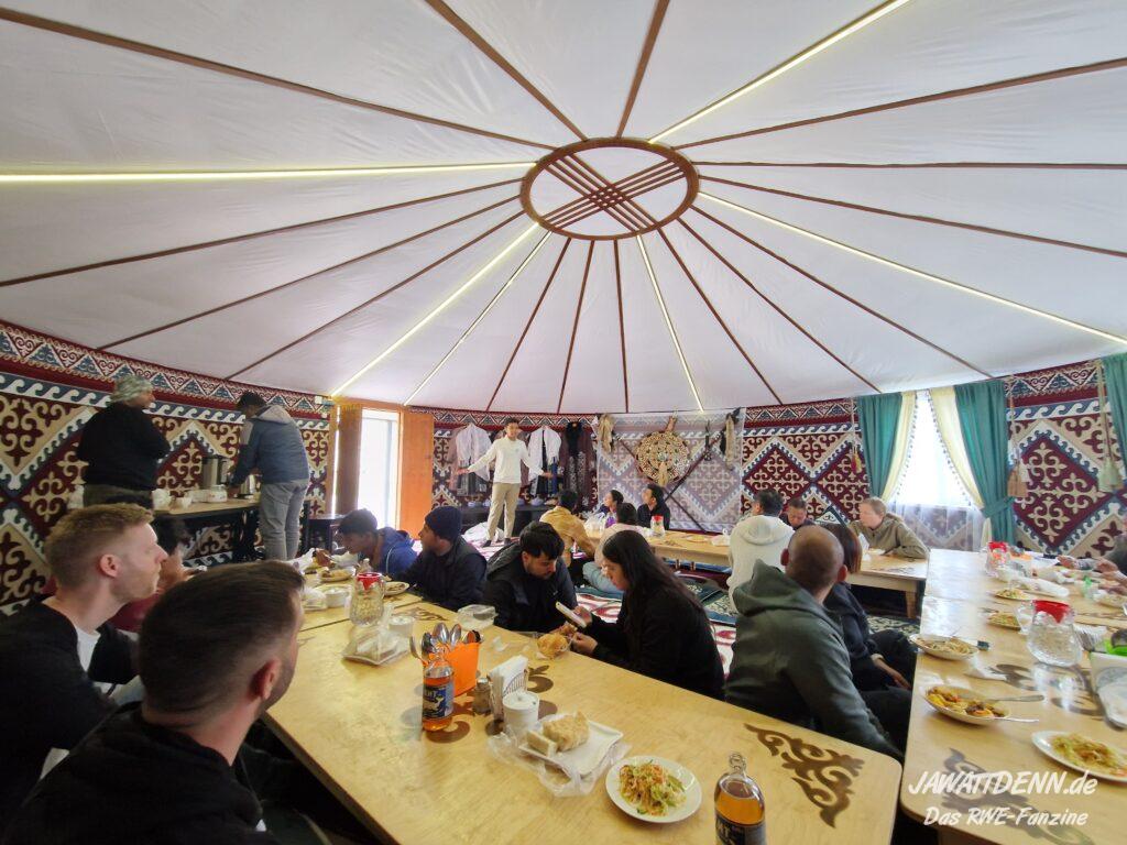 Das nächste Ziel unserer Reisegruppe war eine Jurte in einem kleinen Dorf, das auf der Strecke lag. Nachdem sich alle ihrer Schuhe entledigt und auf dem Teppichboden Platz genommen hatten, wurde gemeinschaftlich gefuttert. Der einzige Deutsche mit uns, ein Reisender aus Hannover, nutzte die Gelegenheit, sein Leid über AJet zu klagen. Auch er hatte mit kuriosen Umbuchungen zu kämpfen und allem voran das Problem, dass sein Rückflug nicht mehr im Flight Management der Airline auftauchte. Ein weiterer Dauergast in der Hotline dieser ominösen Fluglinie, dessen Geschichte noch nicht zu Ende erzählt ist.
