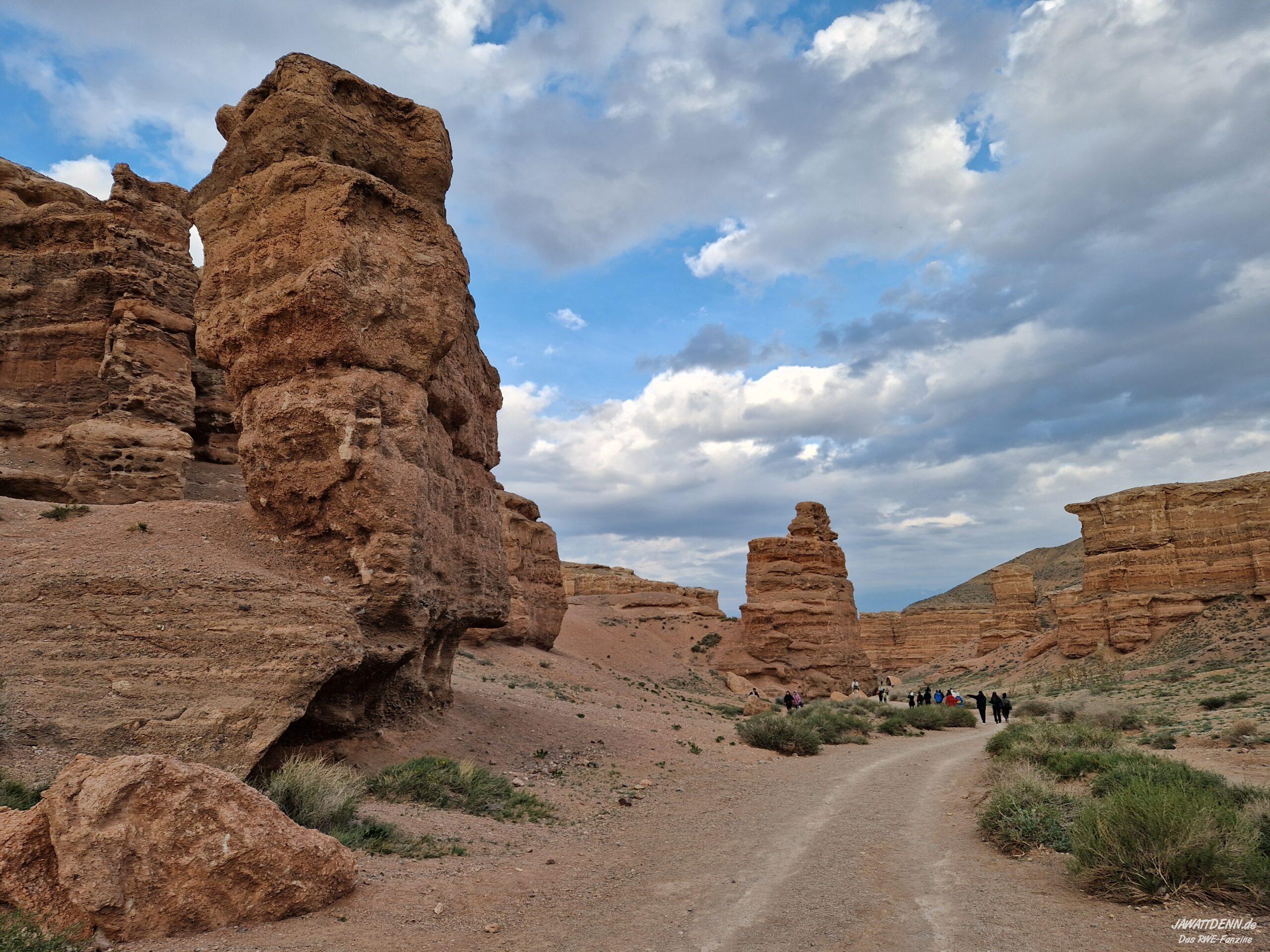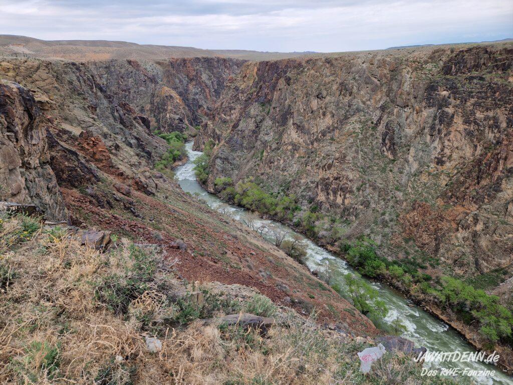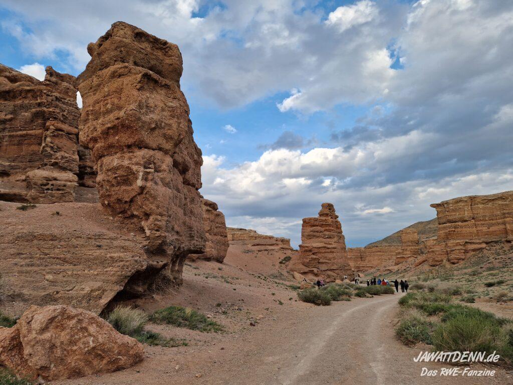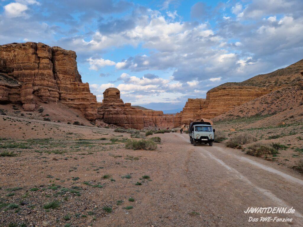 Das nächste Highlight der Tour war der Charyn Canyon, der kleine Bruder des amerikanisches Grand Canyons. Zunächst wurde an der tiefsten Stelle der imposanten Schlucht, dem Black Canyon, ein kurzer Zwischenstopp gemacht. 300 Meter Höhe haben die Klippen an der Stelle. Unten fließt ein reißender Fluss, der aus der Entfernung nur wie ein Rinnsal aussieht. Die Felswände sind schwarz durchsetzt, während das Wasser in der Schlucht grün schimmert. Genauso wie die paar Sträucher, die in der Ödnis zu Leben gefunden haben und das Ufer begrünen.