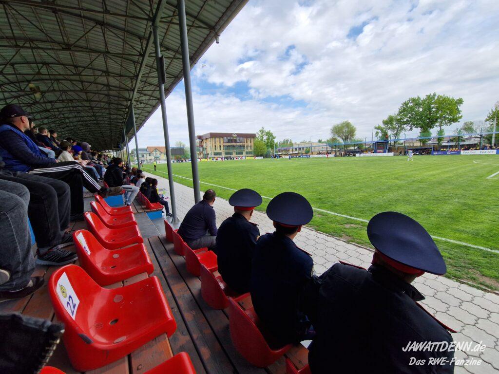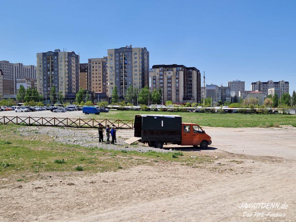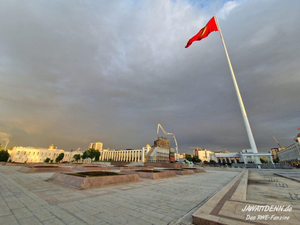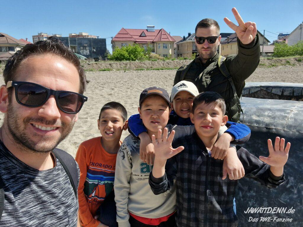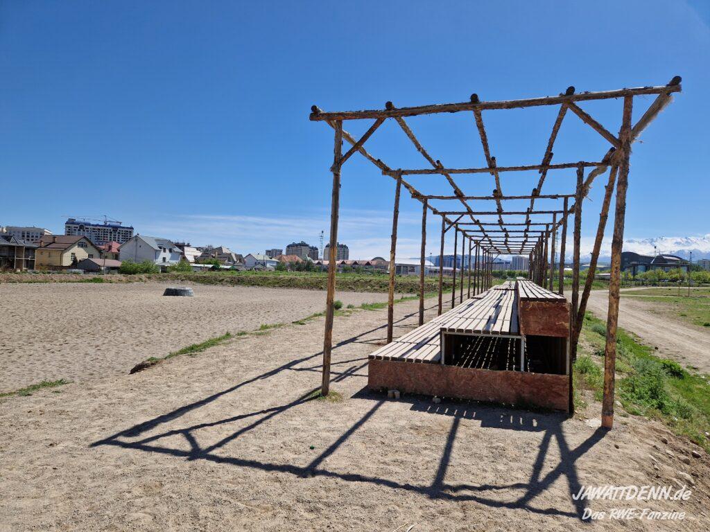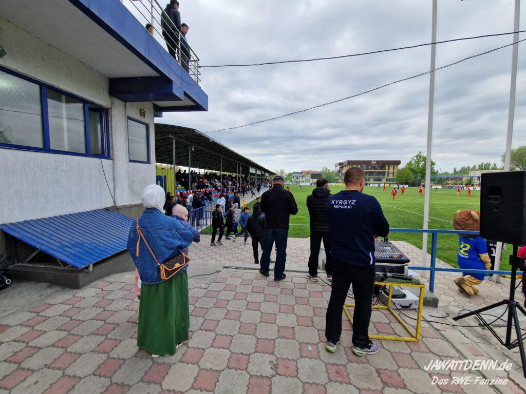 Alles in allem eine sehr entspannte Veranstaltung, bei der die Gastgeber den FC Bishkek-City mit 3:0 auf die kurze Heimreise schickten. Die Tore fielen allesamt in der 1. Halbzeit. Nach Abpfiff trafen wir nochmal mit Ruslan und ein paar Dortmunder Kollegen zusammen. Komplett war die deutsche Runde allerdings erst, als die Nummer 10 von Dordoi Bishkek mit den Worten „Rot-Weiss Essen? Ich fass es nicht!“ dazu stieß. Das prachtvolle Emblem auf meiner Jacke hatte uns verraten.