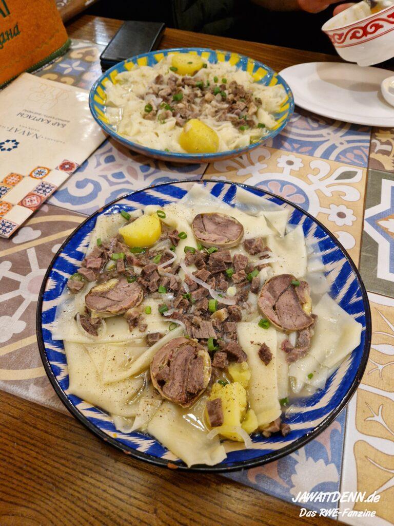Auf Empfehlung von Ruslan kehrten wir im Restaurant Navat ein, um endlich landestypisch zu essen. 15 € pro Nase wurden fällig für 3 Gänge und zwei große Bier. Vorab wurden uns verschieden angerichtete Mantis, gefüllte Teigtaschen, gereicht, die geschmacklich wirklich sehr überzeugen konnten. Zum Hauptgang musste es natürlich das kirgisische Nationalgericht sein: Beshbarmak. Ganz simpel erklärt, handelt es sich dabei um Pferdefleisch auf flachen Nudeln, die in einer Brühe schwimmen. Ganz lecker, aber kulinarisch auch nicht der ganz große Wurf. Zum Dessert gab es Tschak-Tschak, frittierte Teigstreifen mit Honig. Genießbar, aber etwas monoton in Geschmack.