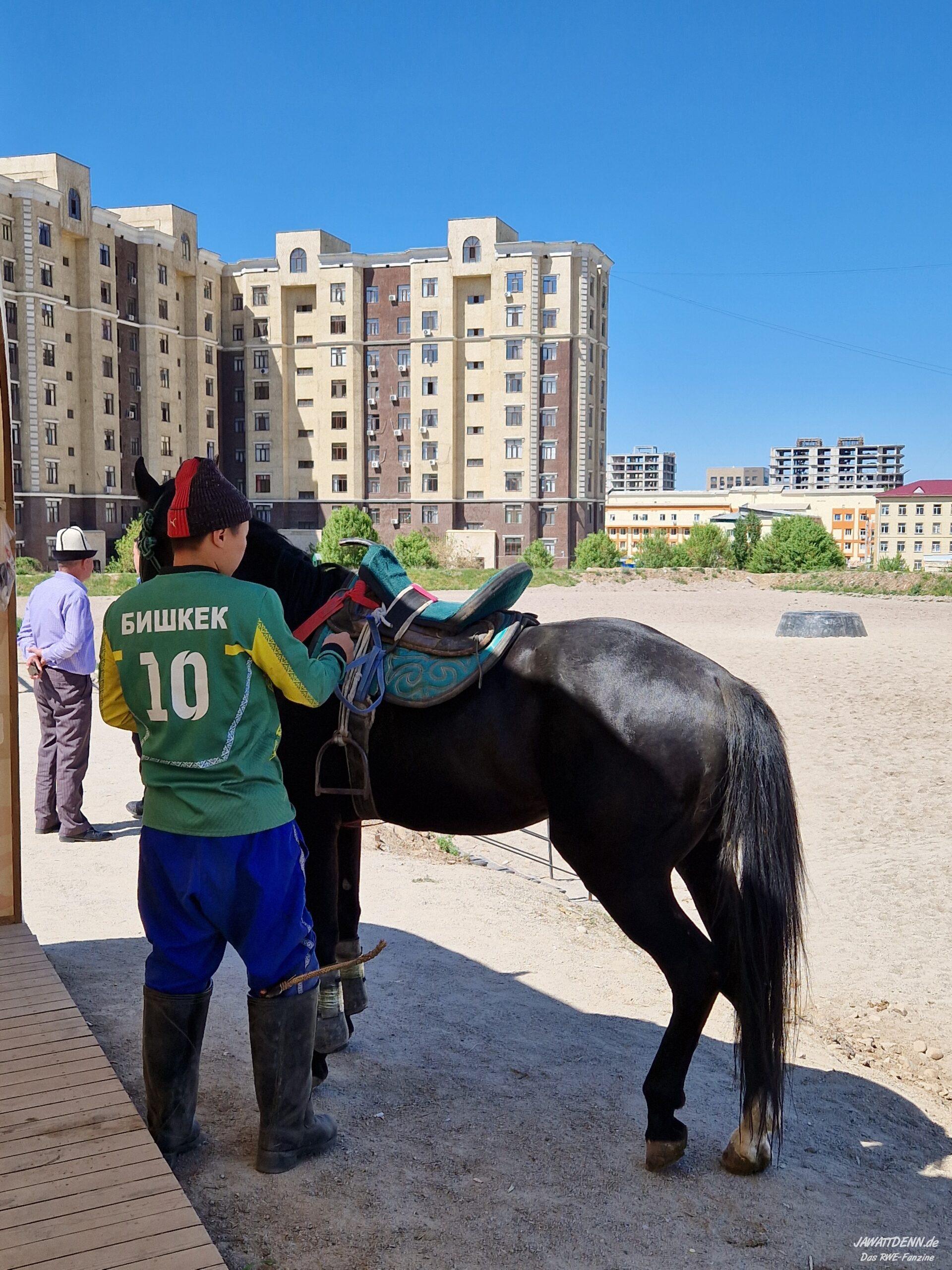 Am nächsten Morgen stand noch ein großes Highlight vor uns. Der Besuch einer Partie Kok Boru war geplant. Kok Boru, in anderen Ländern auch Buzkashi genannt, ist kirgisischer Nationalsport und quasi das Gegenteil von Fußball: Das Tor ist rund und liegt auf dem Boden, gespielt wird mit der Hand, bewegt wird sich auf Pferden und der Spielball ist eine tote Ziege, der Kopf und Hufe abgetrennt wurden. Ein kurzes Popularitätshoch dürfte diese extravagante Sportart erlangt haben, als sich Sylvester Stallone 1988 in Rambo III ein Duell mit den afghanischen Mujahideen lieferte. Die Geschichte der Sportart selbst geht auf eine jahrhundertealte Tradition der Nomadenvölker zurück. Die von der Jagd heimkehrenden Reiter entrissen sich gegenseitig den erlegten, grauen Wolf, den Kok Boru, um ihn vor die Jurte des Dorfältesten zu legen und entsprechende Anerkennung zu bekommen.