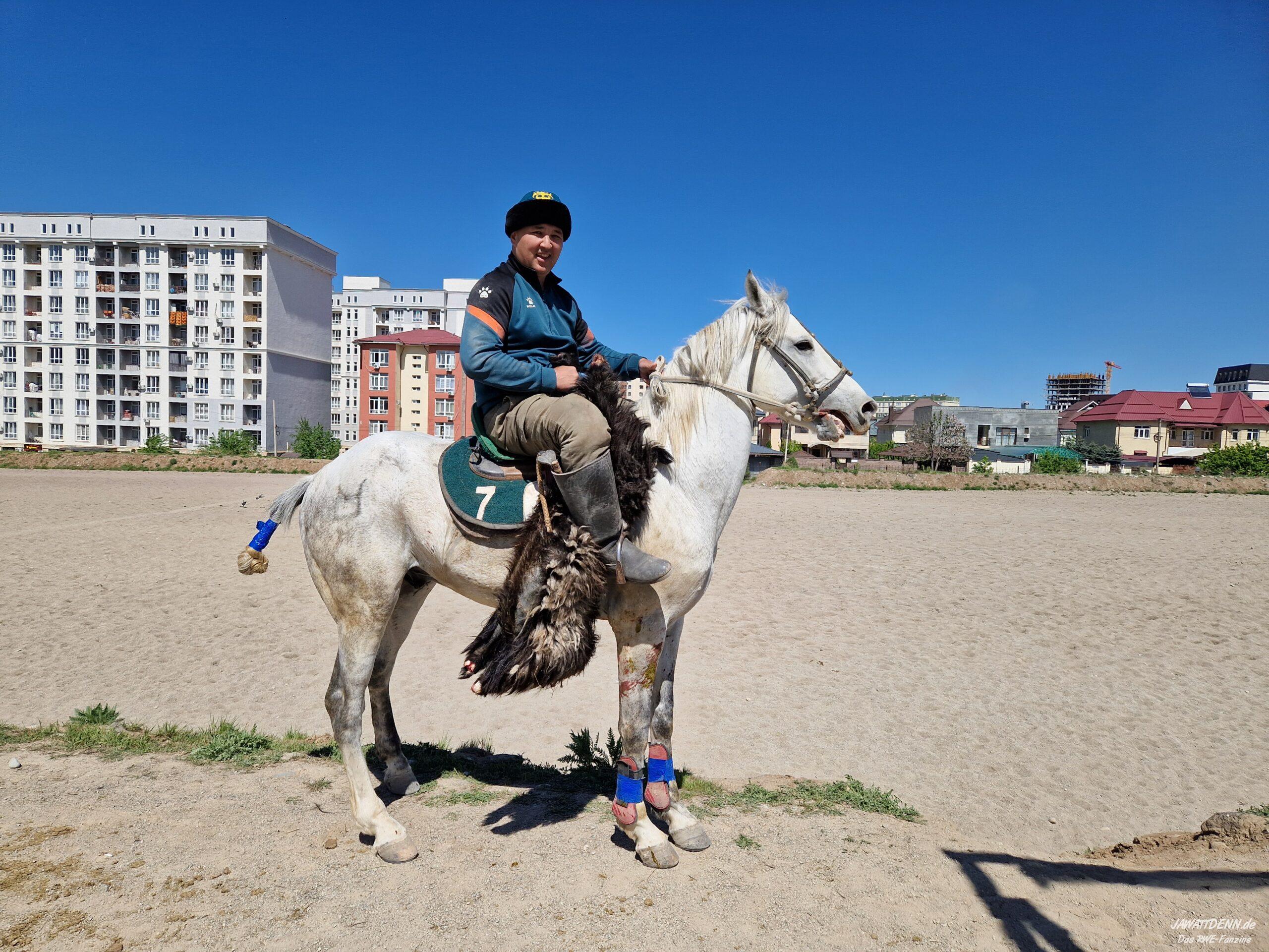 Um die Chance auf das Spektakel nicht leichtfertig zu verspielen, steuerten wir die Koordinaten an jenem Tag bereits um 10 Uhr an. Vor Ort trafen wir allerdings nur auf ein paar Kids, denen wir durch ein Loch im Zaun auf das Gelände folgten. Tatsächlich standen wir nun inmitten eines riesigen Sandplatzes, an dessen Enden jeweils ein Tay Kazan, das Tor im Kok-Boru, stand. Mit Händen und Füßen gaben uns die Kinder zu verstehen, dass hier um 13 Uhr die Pferde aufkreuzen werden. Drei Stunden also noch.