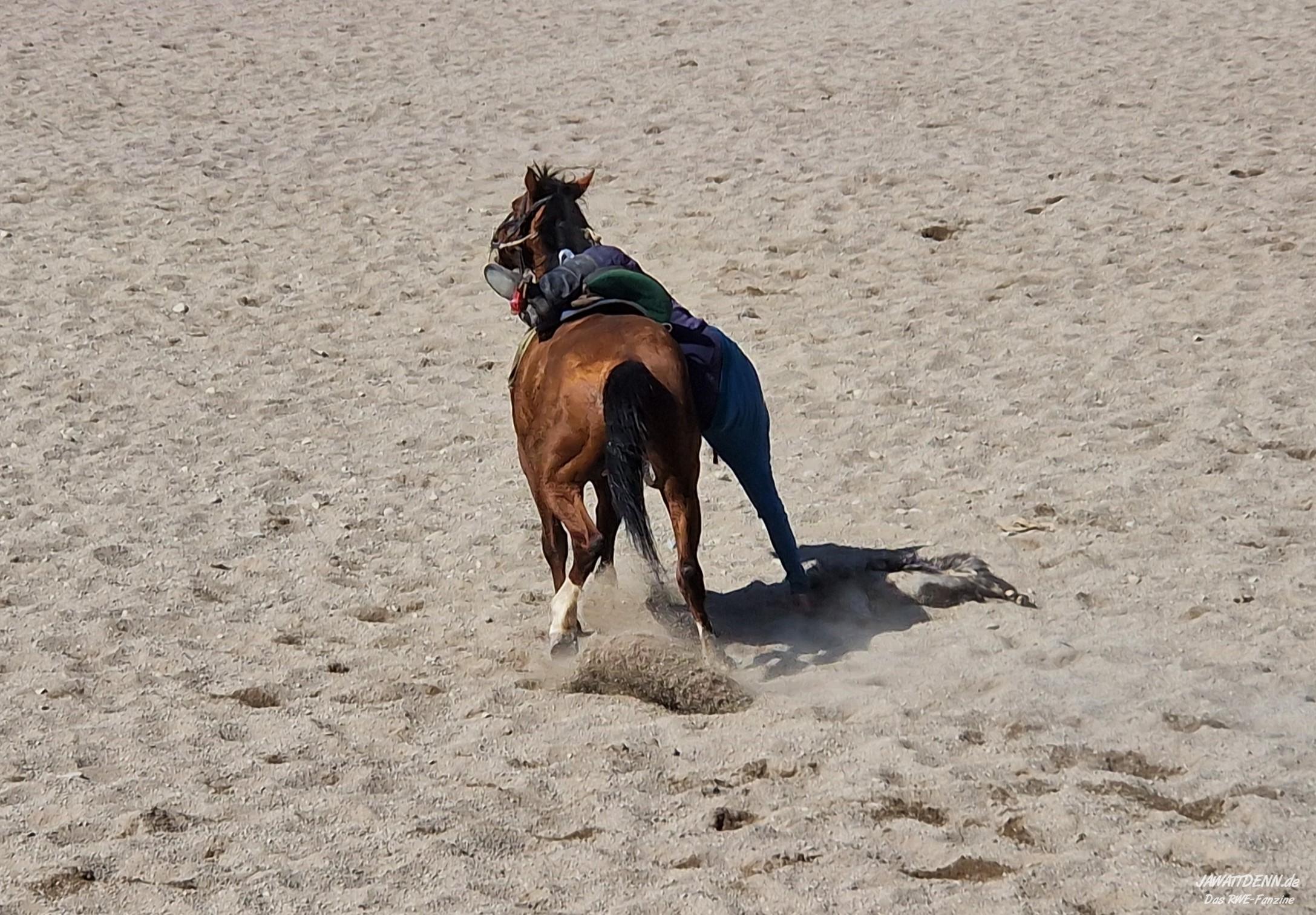 16 Pferde standen letztlich auf dem Feld. Bevor es richtig losging, durften auch die Kinder immer wieder über das Spielfeld reiten und ihr Können unter Beweis stellen. Stets unter Einsatz der selbstgebauten Peitschen. Einer der Besucher war des Englischen mächtig und klärte uns über das nun stattfindende Spiel auf.