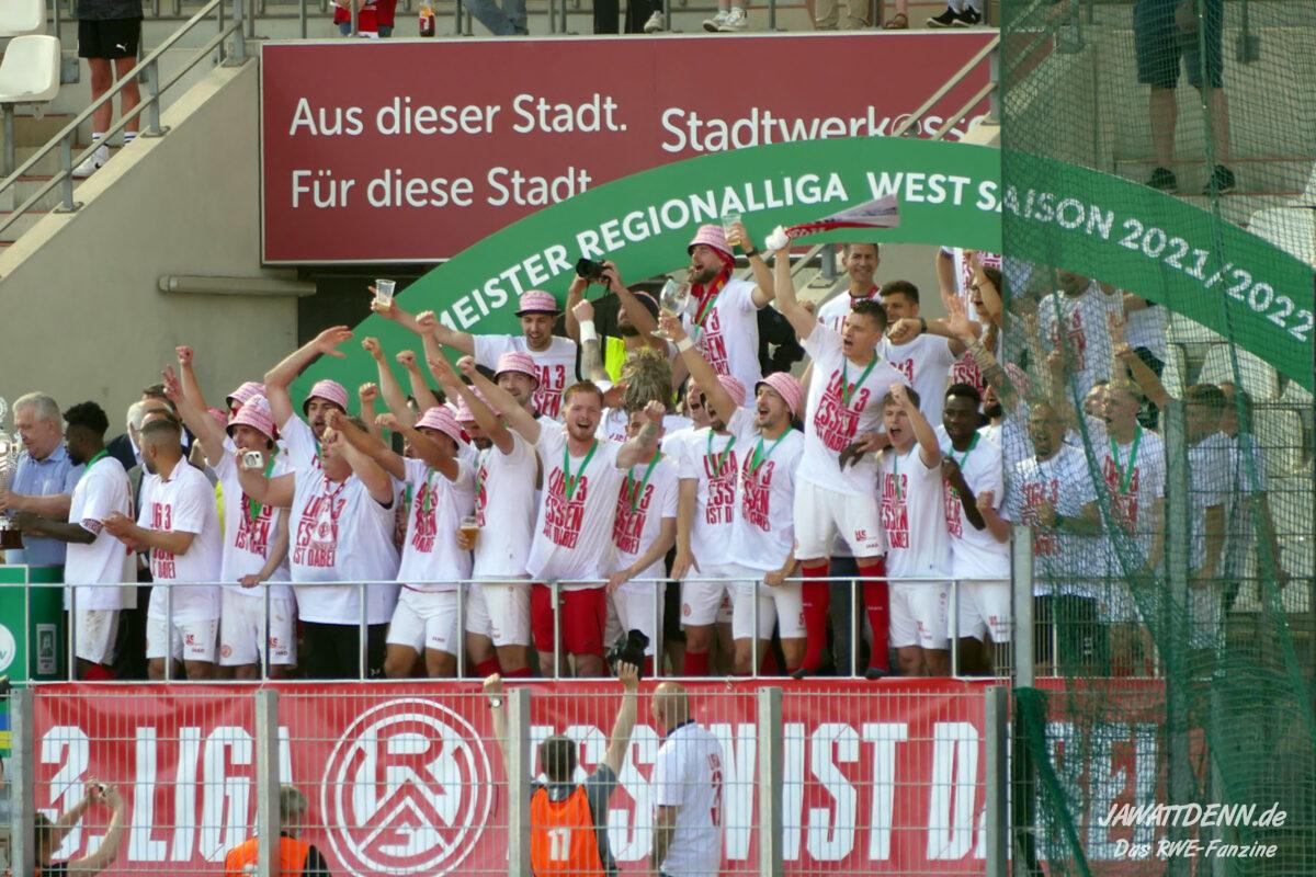 Bei Regen und Wind, bei Sturm und Schnee, RWE, RWE! Die RWE-Fans sorgten einmal mehr für den höchstens bundesweiten Zuschauerschnitt unterhalb der Profiligen und für den höchsten Pro-Kopf-Bierkonsum in deutschen Fußballstadien überhaupt. In gut 3420 Saisonminuten haben wir hinter unserer Mannschaft gestanden, mitgelitten, mitgefiebert, mitgeschimpft und mitgejubelt. Am 14.05 brachen dann auch bei uns alle Dämme, Freudentränen flossen und der Stadt Essen wurde beim Feiern gezeigt, welch großen Verein sie beherbergt. Ohne vermessen klingen zu wollen, nach 14 Jahren Leidenszeit haben wir uns das so redlich verdient wie niemand sonst. Kein Vertrag musste verlängert werden. Wir haben alle bereits auf Lebenszeit unterschrieben.