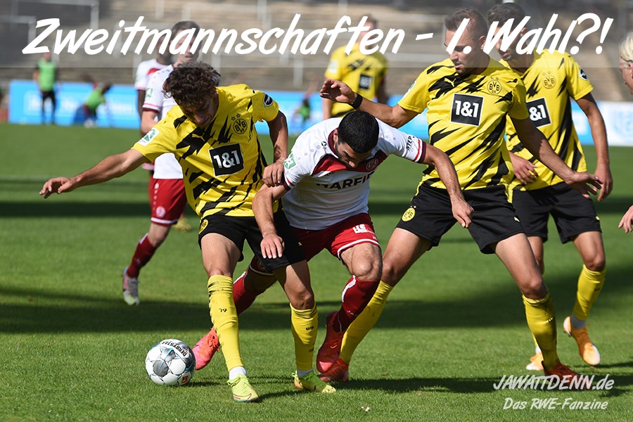 Das hat vor allem Borussia Dortmund, ein Verein, mit dem sich RWE und seine Fans lange Jahre verbunden fühlten. In dieser Saison sind die Dortmunder einziger noch verbliebene ernsthafter Konkurrent von Rot-Weiss Essen um den Aufstieg in die Dritte Liga. Obwohl die Schwarz-Gelben bislang noch nicht ins Profiregal gegriffen haben, stehen sie sehr gut da, weil diese Mannschaft von vorneherein so aufgestellt worden ist, dass sie Regionalligaspitze darstellt. Das ist legitim. Weil die Regeln der Verbände es zulassen und interne Ligen für solche Mannschaften nicht ins Auge fassen. Das ist für einige Beobachter schon Grund genug, jegliche Kritik im Keime ersticken zu wollen.
