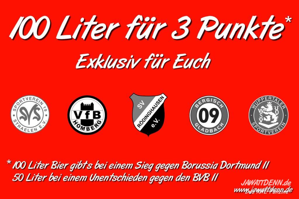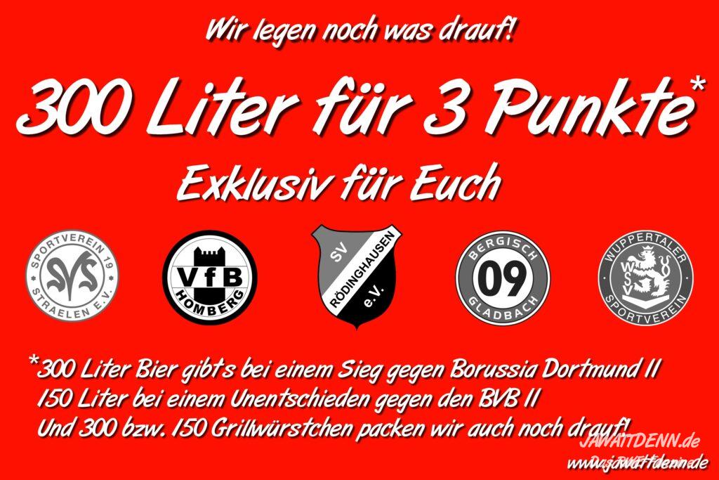 Liebe Sportsfreunde aus Straelen, Bergisch Gladbach, Homberg, Rödinghausen und Wuppertal: Gute Leistungen sollen auch gut entlohnt werden, daher legen wir noch einmal einen drauf und verdreifachen unseren bisherigen Einsatz. Also: jeder von Euch fünf Vereinen, der an den letzten Spieltagen Unentschieden gegen Dortmund II spielt, bekommt 150 Liter Bier für den Saisonabschluss und für jeden…