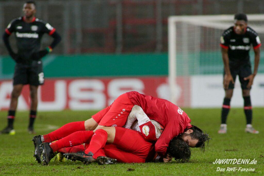 Die nächste Pokalsensation ist perfekt. RWE schlägt den Bundesligisten Bayer 04 Leverkusen in einer wahren Abwehrschlacht mit 2:1. Oguzhan Kefkir und Simon Engelmann trafen nach Rückstand kurz vor Ende der Nachspielzeit und machten das Tor zum Viertelfinale auf. Wahnsinn!