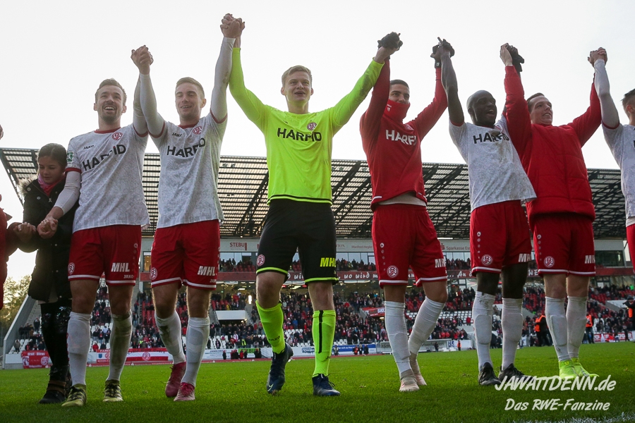 Doch die ab der 66. Minute ins Spiel gekommenen Hamdi Dahmani, Jan Neuwirt, Hedon Selishta und Florian Bichler fügten sich nahtlos ein in ein funktionierendes Mannschaftsgefüge. Denkt man daran, dass ein Dennis Grote gar nicht ins Spiel kam, dann sieht man, welch Potenzial auch noch in der Hinterhand schlummert. Nach dem Spielschluss feierten Mannschaft mitsamt Kindern und Fans wie gewohnt frenetisch den Erfolg. Die Fans wollten zusätzlich nicht nur den Trainer, sondern ALLE sehen. Die sonst im Mittelkreis verharrende RWE-Crew um Co-Trainer, Physios und Co wurden mit zur Feier beordert. Die Begeisterung ist zurück, der Enthusiasmus wieder da. Im Vorjahr beendeten die Roten mit 24 Punkten aus 17 Partien die Vorrunde. Nach 15 gewerteten Spielen steht RWE nun bei 34 Punkten und einem Schnitt von 2,26 Zählern. Überragend. Weil man insbesondere in Ostwestfalen und namentlich in Rödinghausen und Verl ebenso überragend spielt, reicht das dennoch nur zu Platz 3. Am kommenden Wochenende kann RWE mit einem Sieg im Nachholspiel gegen die Zweitvertretung eines Gelsenkirchener Stadtteilvereins punktetechnisch mit dem derzeitigen Liga-Primus aus dem Wiehengebirge gleich ziehen. Mehr zu diesem Spiel wie gewohnt für euch diese Woche bei Jawattdenn.de.