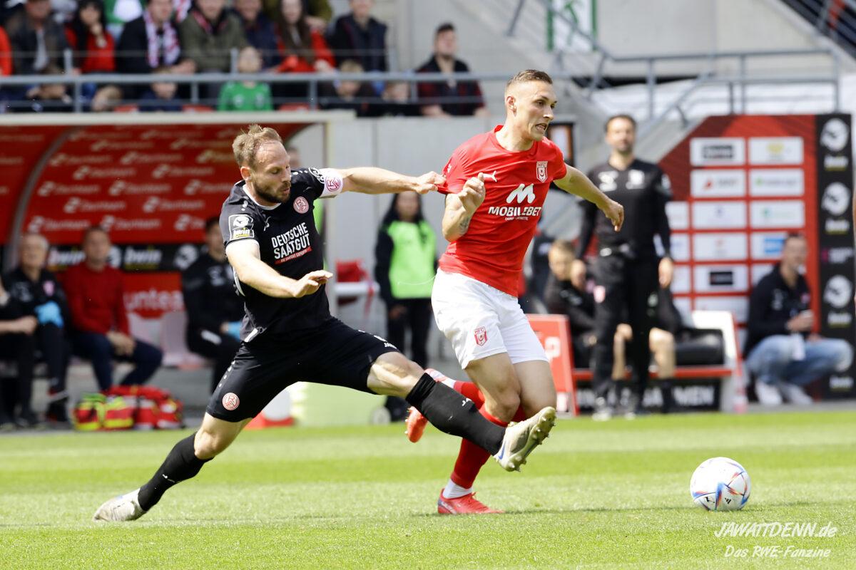 Eigentlich Grund genug, dem Matchball am Samstag entgegenzufiebern, doch nachdem der Vorsprung zwischenzeitlich schon mal komfortabler aussah, schleppt sich RWE derzeit mit letzter Kraft der Ziellinie entgegen: Klammert man den für RWE gewerteten Spielabbruch in Zwickau aus, gab es aus den letzten 10 Ligaspielen nur einen Sieg, drei Remis und sechs Niederlagen. Die Form spricht nicht für RWE, vor allem da nach 25 Spieltagen insgesamt erst 7 Niederlagen auf dem Konto standen und diese Zahl sich im Schlussdrittel der Saison nun fast verdoppelt hat.