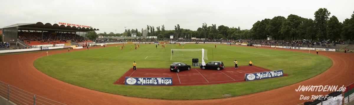 - Klar, Stadien mit Laufbahn sind der Fußballatmosphäre nicht unbedingt zuträglich, doch die überdachte Haupttribüne inmitten von 18.000 offenen Stehplätzen, die sich größtenteils über die beiden Kurven erstrecken, erinnern mit etwas Fantasie an die Wattenscheider Lohrheide. Auch namentlich hebt sich das Hans-Walter-Wild-Stadion angenehm von den zahlreichen nach Automarken oder Billigreisen benannten Plastik-Arenen ab und dürfte zudem für viele RWE-Fans einen neuen „Ground“ in der Sammlung darstellen – schließlich war ein nicht unerheblicher Teil der Gästefans beim letzten Aufeinandertreffen beider Vereine noch nicht einmal auf der Welt!