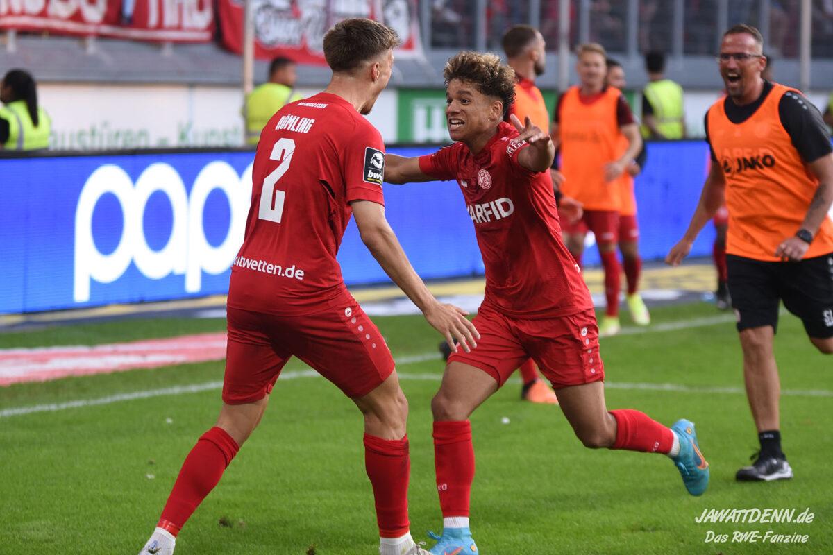 Eine Slapstick-Kombination von Tarnat und Plechaty führte zum Eckball, den Marvin Bakalorz bereits nach fünf Minuten ins lange Eck köpfen konnte. Einfachste Finten reichten aus, um RWE insbesondere in Halbzeit 1 auf den Flügeln immer wieder im 1-gegen-1 zu überwinden und in Bedrängnis zu bringen, auch wenn die ganz großen Chancen zunächst Mangelware blieben. Jakob Golz hatte kurz vor der Pause dann jedoch Glück, dass sein fallengelassener Ball nicht den Weg ins Tor, sondern knapp daneben fand. Nur fünf Minuten nach Wiederanpfiff konnte Duisburg einen Eisfeld-Freistoß klären und Isaiah Young, der gegen Konter absichern sollte, verschätzte sich zunächst beim Rausrücken, musste dann Stoppelkamp hinterherlaufen und ließ sich von diesem vor dem schönen Schlenzer zum 2:0 an der Strafraumkante verladen.
