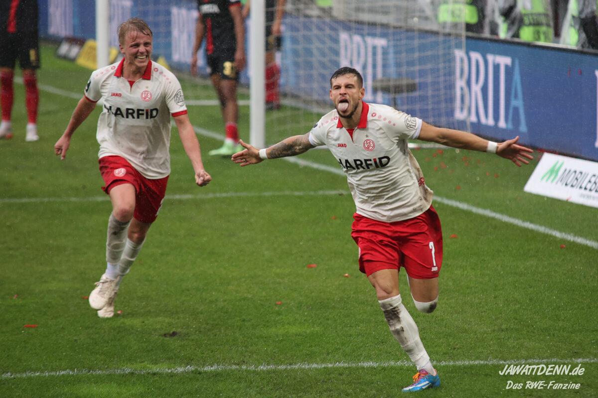 Insbesondere im ersten Spielabschnitt hatte RWE seine liebe Mühe und Not mit der Wucht der Gäste. Schon nach 20 Sekunden hatte Wiesbaden eine Riesenchance, nachdem Felix Bastians sich – wohl auch bedingt durch die orkanartigen Windböen – bei einem langen Schlag verschätzte und Jakob Golz klasse gegen Hollerbach retten musste.