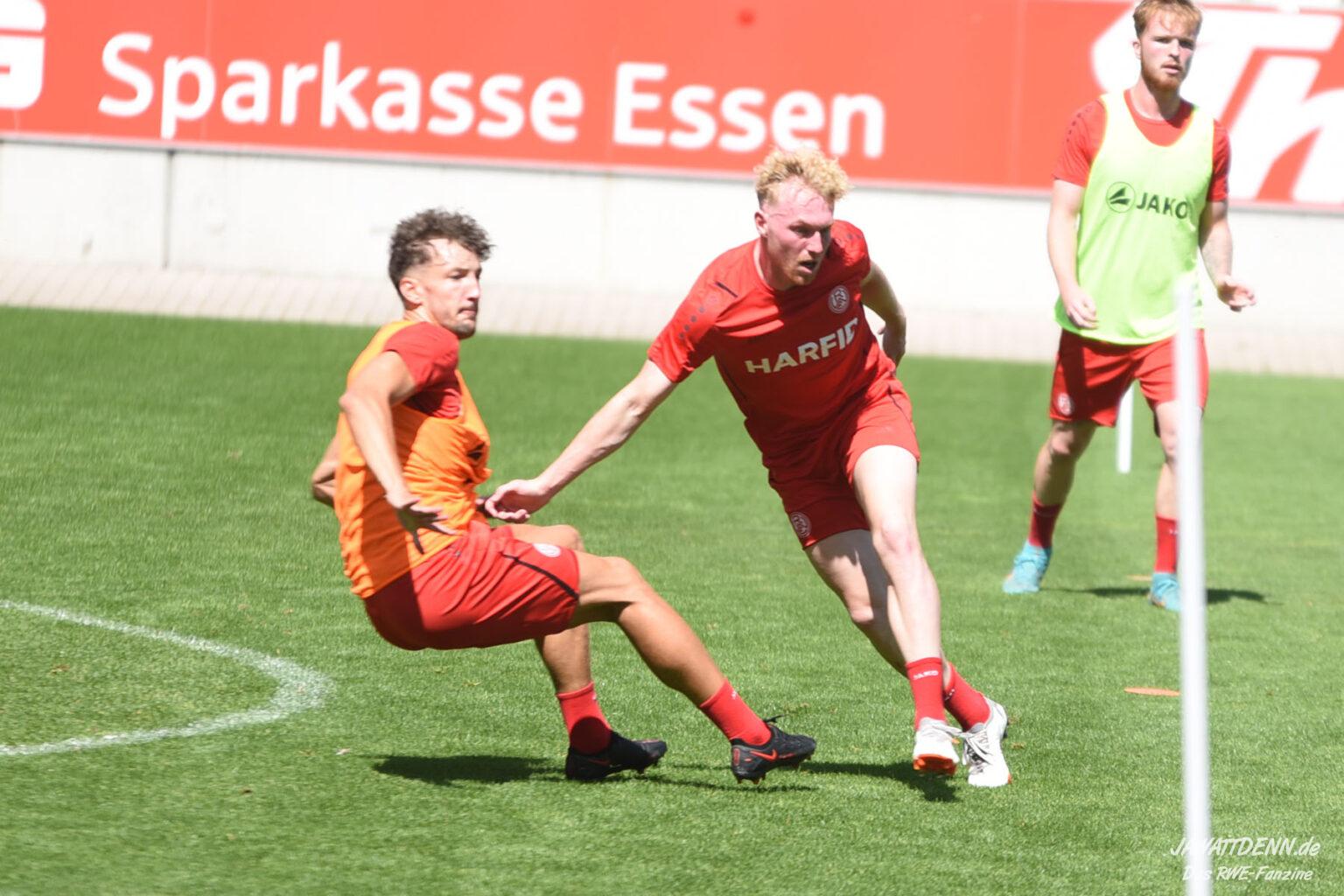 Der lachende Dritte im Bunde könnte somit Cedric Harenbrock sein. Harenbrock hat den Status des Talents längst hinter sich gelassen und ist als Spielerpersönlichkeit gereift, aber sicherlich noch nicht am Ende der Fahnenstange angelangt. Jörn Nowak nahm Cedi jedenfalls schon einmal namentlich in die Verantwortung und erwartet von Essens nun dienstältestem Spieler, der in seine sechste RWE-Saison geht, eine weitere Entwicklung. Von allen diesen Akteuren wird nach Ballverlust schnelles Umschalten und die Transformation in die Kompaktheit verlangt. Das fängt bereits beim Sturm an, ist in der Zentrale aber besonders wichtig, da der Gegner sonst mit zu viel Raum auf Essens Deckung zupreschen können wird.