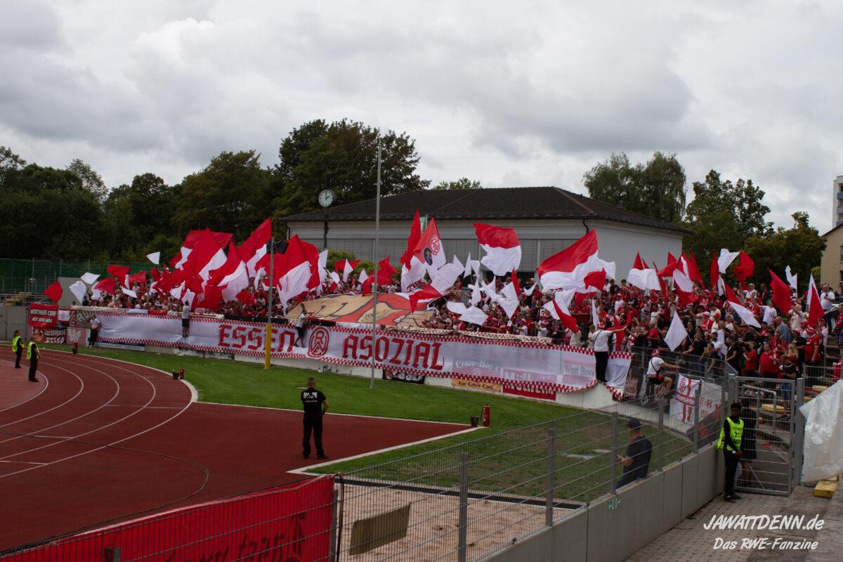 Zunächst wurde durch gutes Pressing ein Einwurf in der gefährlichen Zone erzwungen. Nach Kefkirs weitem Einwurf behauptete RWE den Ball gleich dreimal im Kopfballduell und die finale Ablage von Simon Engelmann auf Isi Young war genauso gewollt, Isi hämmerte die Kugel dann humorlos in den Kasten. Auch in Unterzahl nach Römlings Platzverweis zeigte sich Essen nicht rein im Rückwärtsgang, die letzte Aktion des Spiels hätte Ron Berlinski gut und gerne zum Siegtreffer verwerten können. Die Moral und die Einstellung stimmten. Zudem war RWE auch fußballerisch erkennbar besser unterwegs als die Gastgeber. Aber die einmal mehr vorhandenen Knackpunkte sorgten für eine aus rot-weisser Sicht unnötige Punkteteilung.