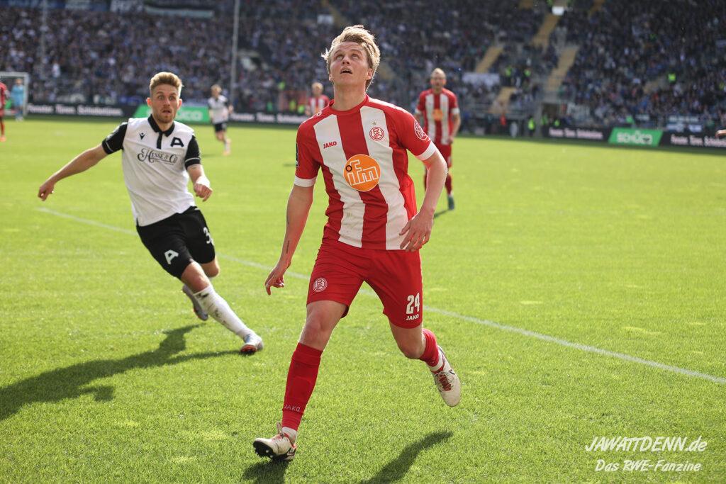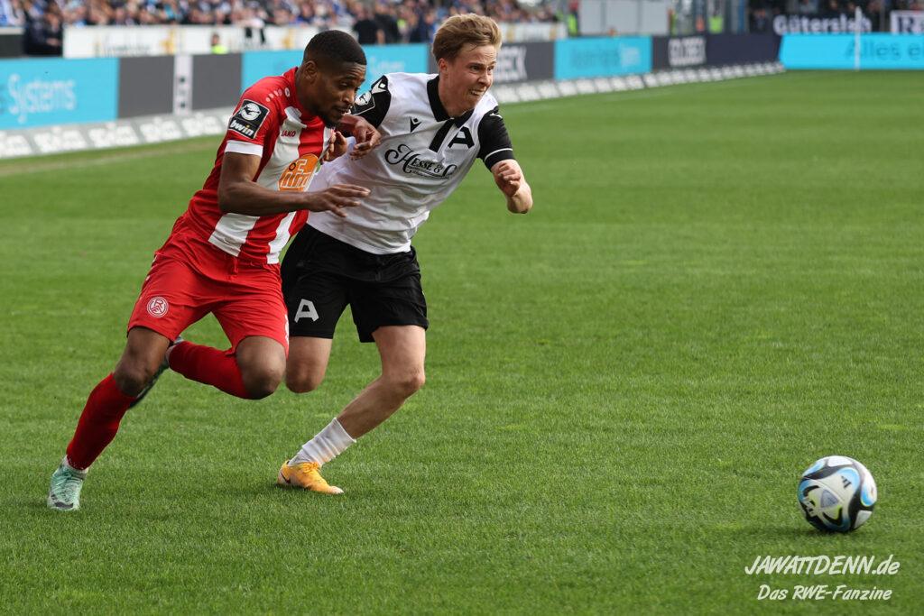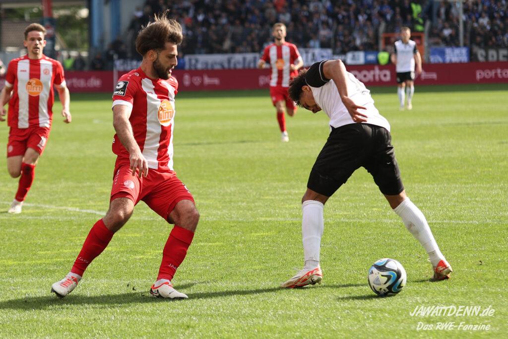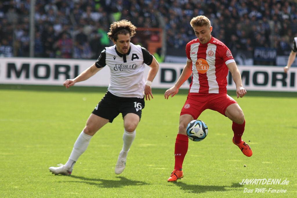 Am Ende wirkten alle zufrieden. Zwar gelang weder den gastgebenden Arminen der endgültige Befreiungsschlag im Abstiegskampf noch den Gästen aus Essen die großen Big Points im Aufstiegsrennen. Aber nach einem intensiven Spiel, das keinen Verlierer verdient gehabt hatte, verbuchten beide Trainer auf der anschließenden Pressekonferenz jeweils einen Punktgewinn. RWE kam nur schleppend in die Partie und geriet durch einen Treffer von Leandro Putaro in Rückstand (32.). Das war zugleich der einzige nennenswerte Torabschluss in Hälfte eins für beide Teams. Rasanter wurde es in Abschnitt zwei, Cedric Harenbrock versetzte mit seinem Ausgleichstreffer zum 1:1 den prall gefüllten Gästeblock in Ekstase. Danach hätte Essen mehr holen können, aber es fehlte der letzte Punch.