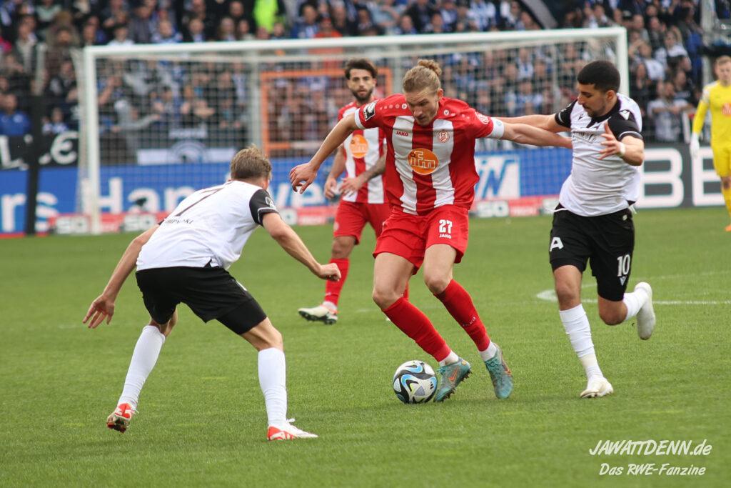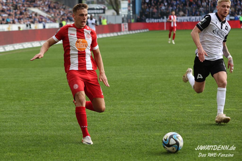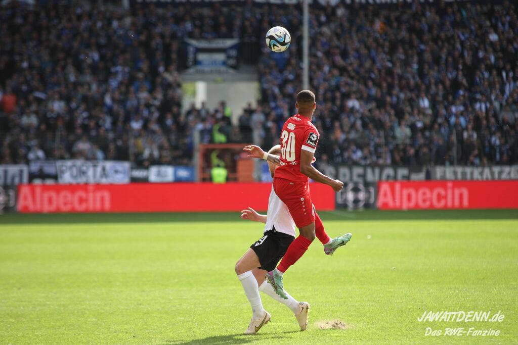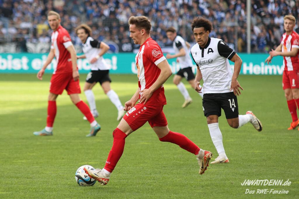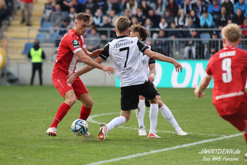 Von nun an spürte man, wie Bielefelds Beine schwerer wurden, RWE ging auf das 2:1, fortwährend nach vorne gepeitscht durch einen siegeshungrigen und immer lauter werdenden Gästeblock, auf den Essen nun spielte.