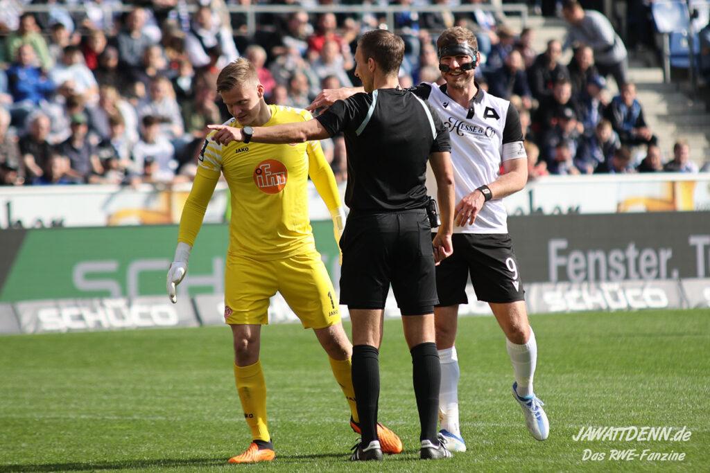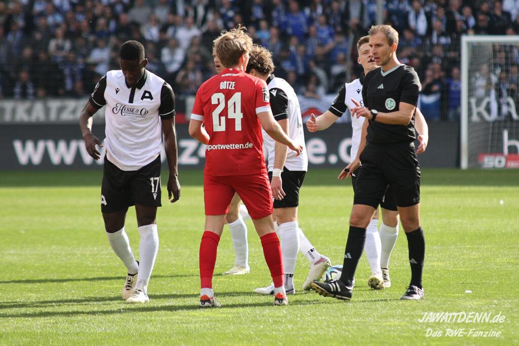 Eigentlich hätte Schiedsrichter Florian Hefner mit der intensiven aber fairen Partie keine Mühe haben dürfen. Das kleinliche Gepfeife Hefners, bei dem vor allem die Bielefelder nur auf Tauchstation auf den Rasen gehen mussten, um einen Freistoß zu erhaschen, nervte jedoch ganz gewaltig und nahm der Partie unnötig Spielfluss. Besonders ärgerlich für RWE eine Situation kurz nach Wiederanpfiff, als Isi Young sich am linken Flügel durchgesetzt hatte, aber Gegenspieler Lannert per plumper Schwalbe Verständnis bei Hefner erschlich, der den Essener zurückpfiff.