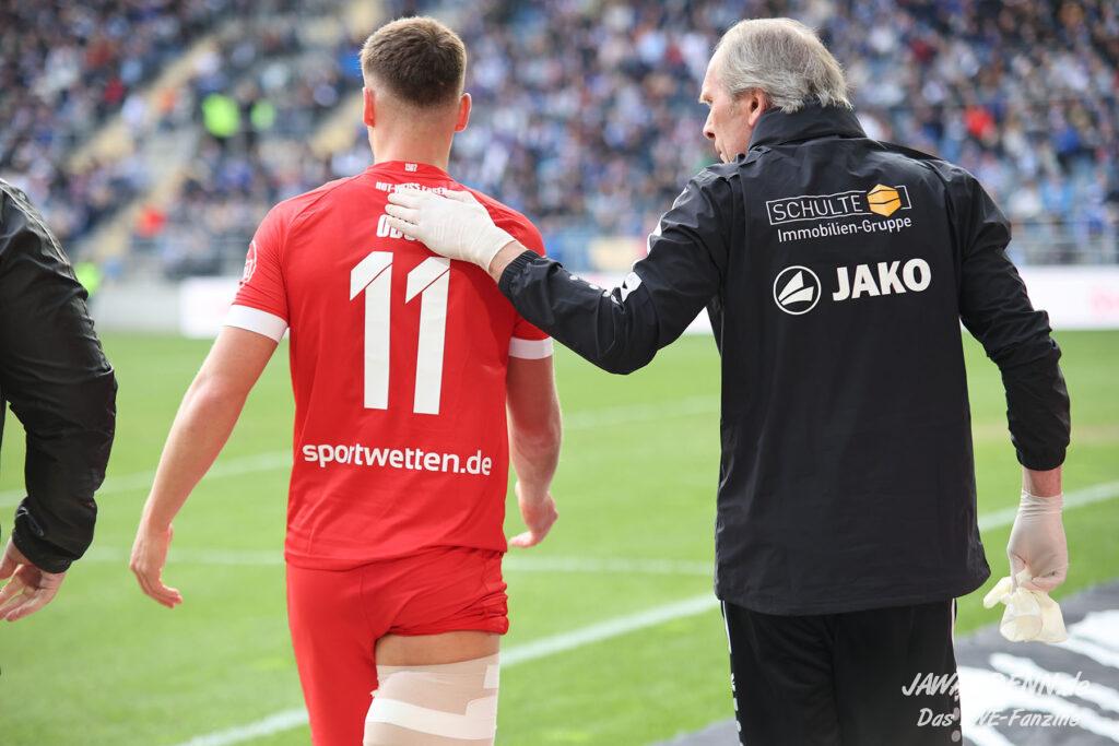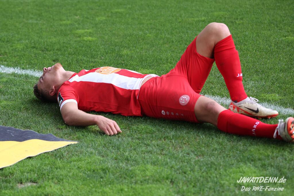 Wirbelte Marvin Obuz auf der anderen Seite zum letzten Mal im RWE-Trikot? Gut 5 Minuten vor dem regulären Ende kam das Schockmomentum. Nach einem Sprint ging Obuz mit schmerzverzerrtem Gesicht vor der RWE-Kurve zu Boden. Nach einem Griff an den rechten hinteren Oberschenkel signalisierte Essens Top-Scorer sofort eine Auswechslung. Das sah nicht gut aus. Ob Obuz, der bekanntlich zum 1. FC Köln zurückgehen wird, noch einmal für RWE auflaufen kann, wird ein MRT am heutigen Montag zeigen müssen. Die RWE-Fangemeinde drückt ganz fest die Daumen.