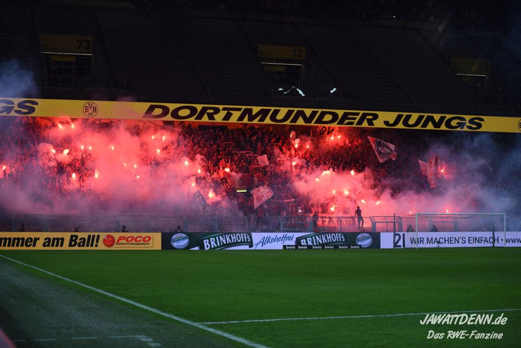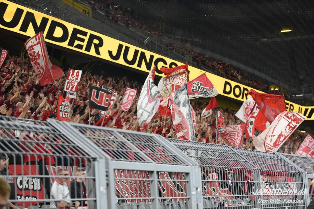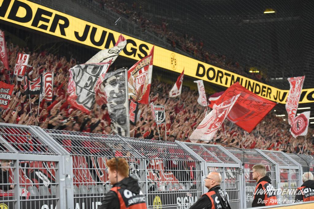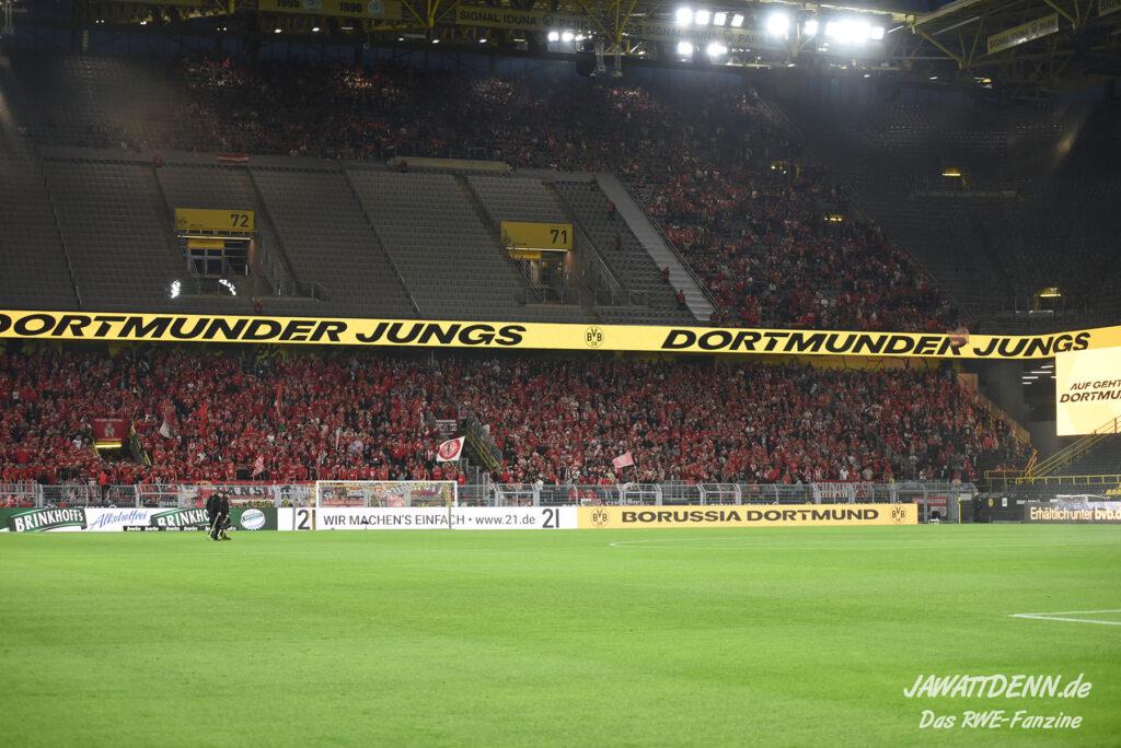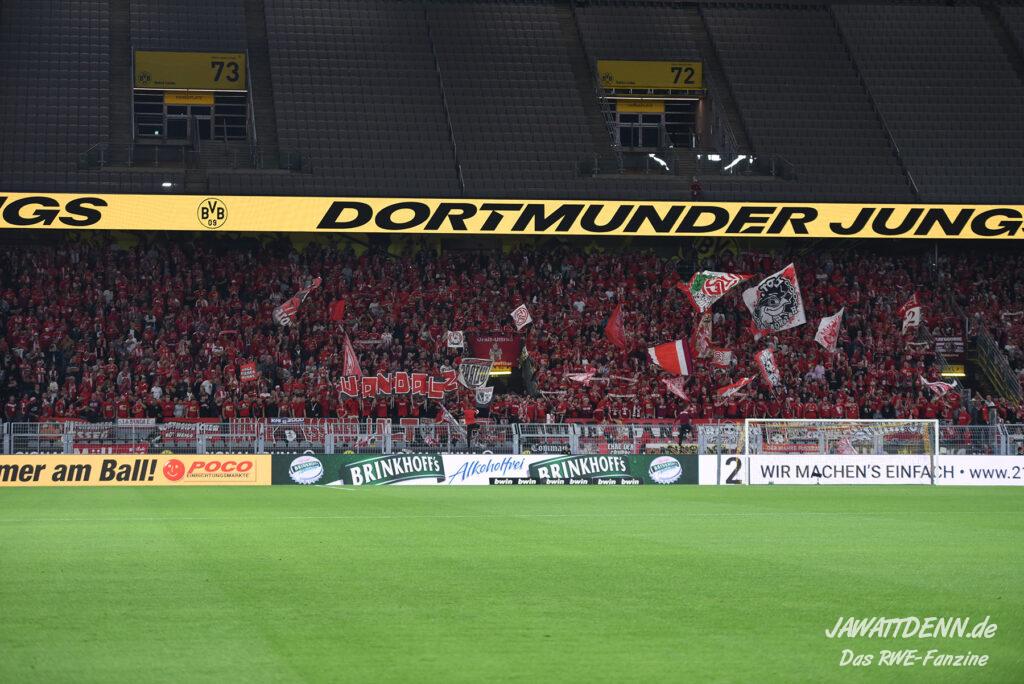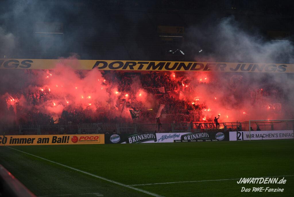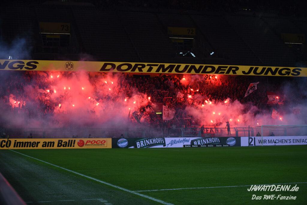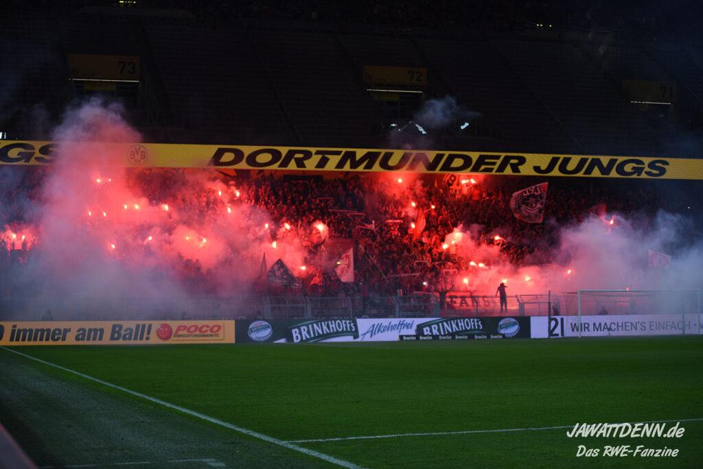 Wie gut dieser Sieg tat, war allen Essener Akteuren nach Schlusspfiff anzumerken, die Jubelszenen auf dem Rasen waren ausgelassen und auch RWE-Boss Marcus Uhlig herzte gefühlt jeden. Ganze Gesteinsbrocken purzelten von der zuletzt arg gebeutelten Essener Seele. Und das Ganze vor sagenhaft zu nennenden 17.000 Zuschauern im Westfalenstadion. Diese sahen eine starke und temporeiche Drittligapartie. Auch viele BVB-Fans gönnten sich am spielfreien Wochenende der „Ersten“ den Auftritt der „Zweiten“. Das Gros der Kulisse stellten jedoch die Essener Gäste. Offiziell hatte RWE etwa 8.000 Karten an seine Anhänger verkauft, es waren jedoch bestimmt über 10.000 Rot-Weisse, die auch Blöcke außerhalb des reinen Gästebereichs geflutet hatten. Das ging aufgrund des immer noch soliden Verhältnisses zur BVB-Fanszene problemlos.
