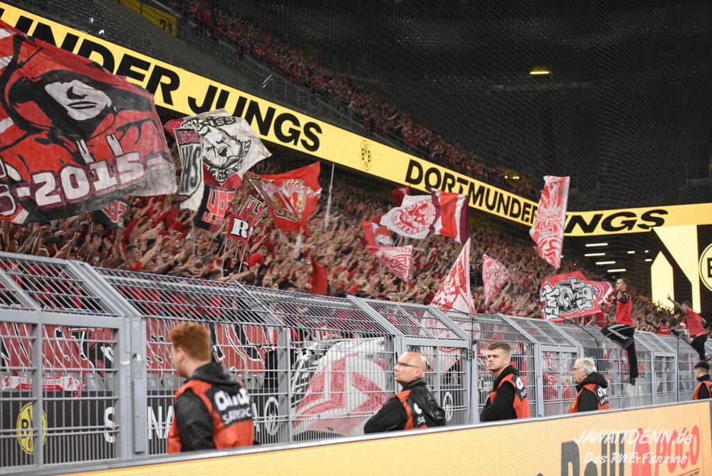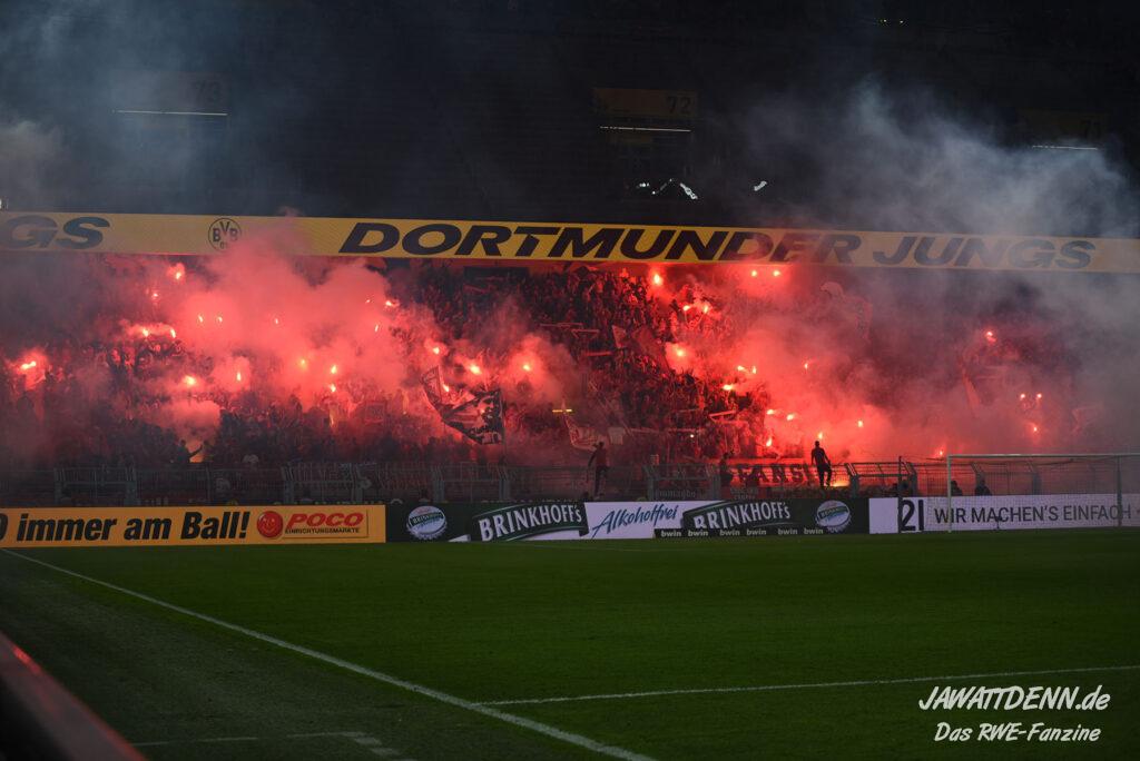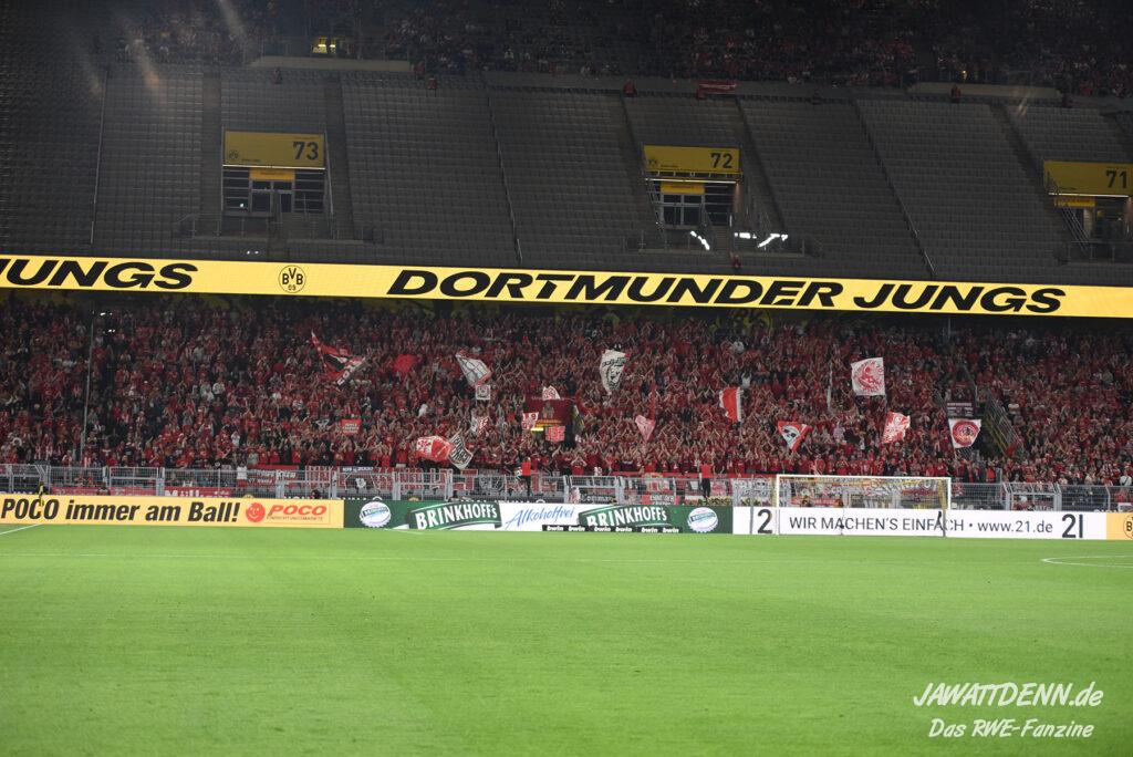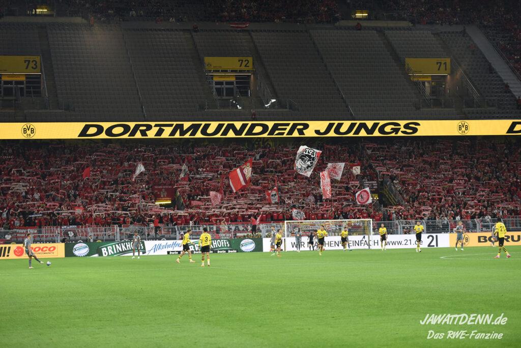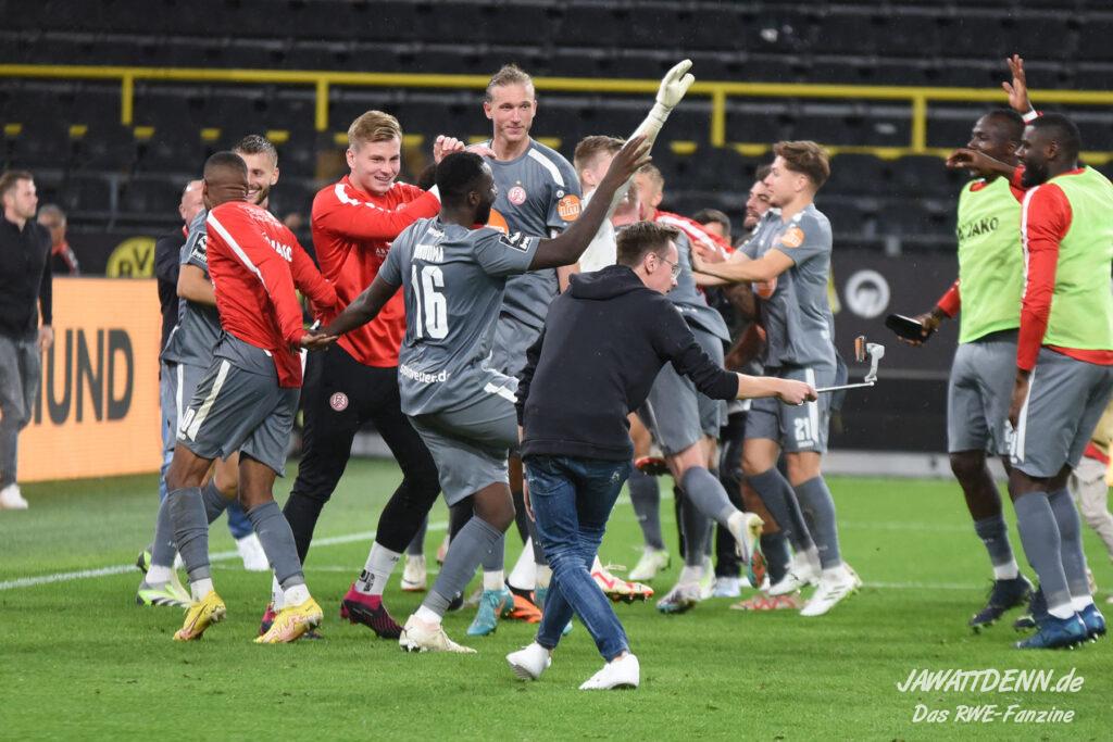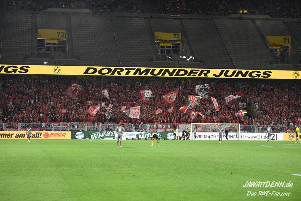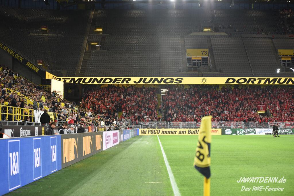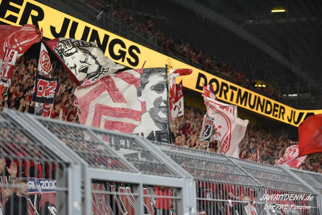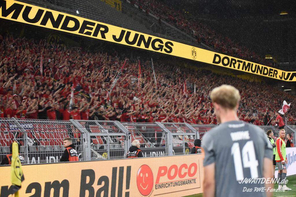 Wie gut dieser Sieg tat, war allen Essener Akteuren nach Schlusspfiff anzumerken, die Jubelszenen auf dem Rasen waren ausgelassen und auch RWE-Boss Marcus Uhlig herzte gefühlt jeden. Ganze Gesteinsbrocken purzelten von der zuletzt arg gebeutelten Essener Seele. Und das Ganze vor sagenhaft zu nennenden 17.000 Zuschauern im Westfalenstadion. Diese sahen eine starke und temporeiche Drittligapartie. Auch viele BVB-Fans gönnten sich am spielfreien Wochenende der „Ersten“ den Auftritt der „Zweiten“. Das Gros der Kulisse stellten jedoch die Essener Gäste. Offiziell hatte RWE etwa 8.000 Karten an seine Anhänger verkauft, es waren jedoch bestimmt über 10.000 Rot-Weisse, die auch Blöcke außerhalb des reinen Gästebereichs geflutet hatten. Das ging aufgrund des immer noch soliden Verhältnisses zur BVB-Fanszene problemlos.