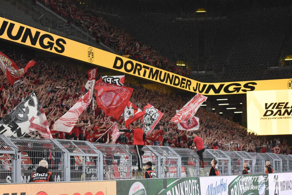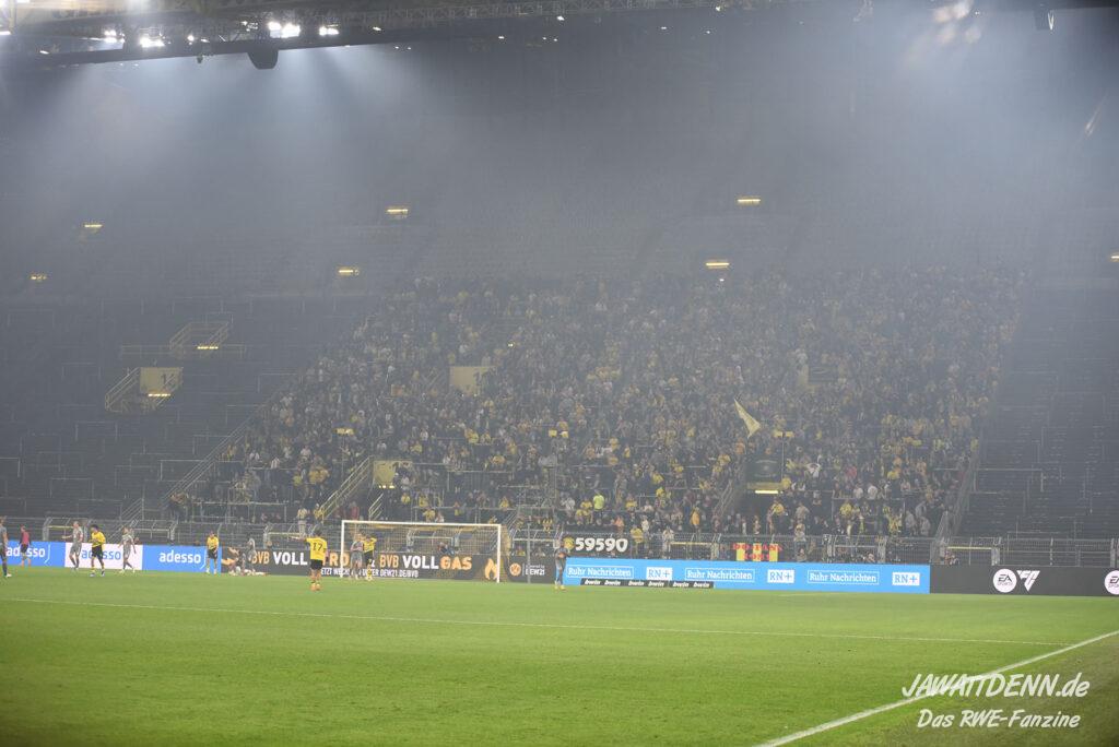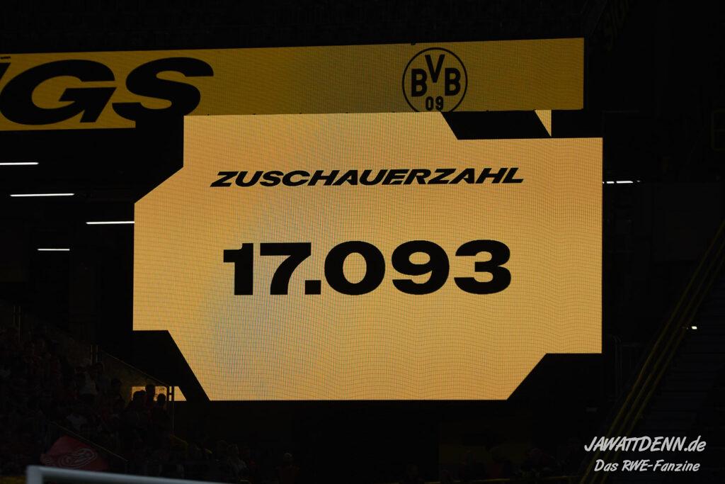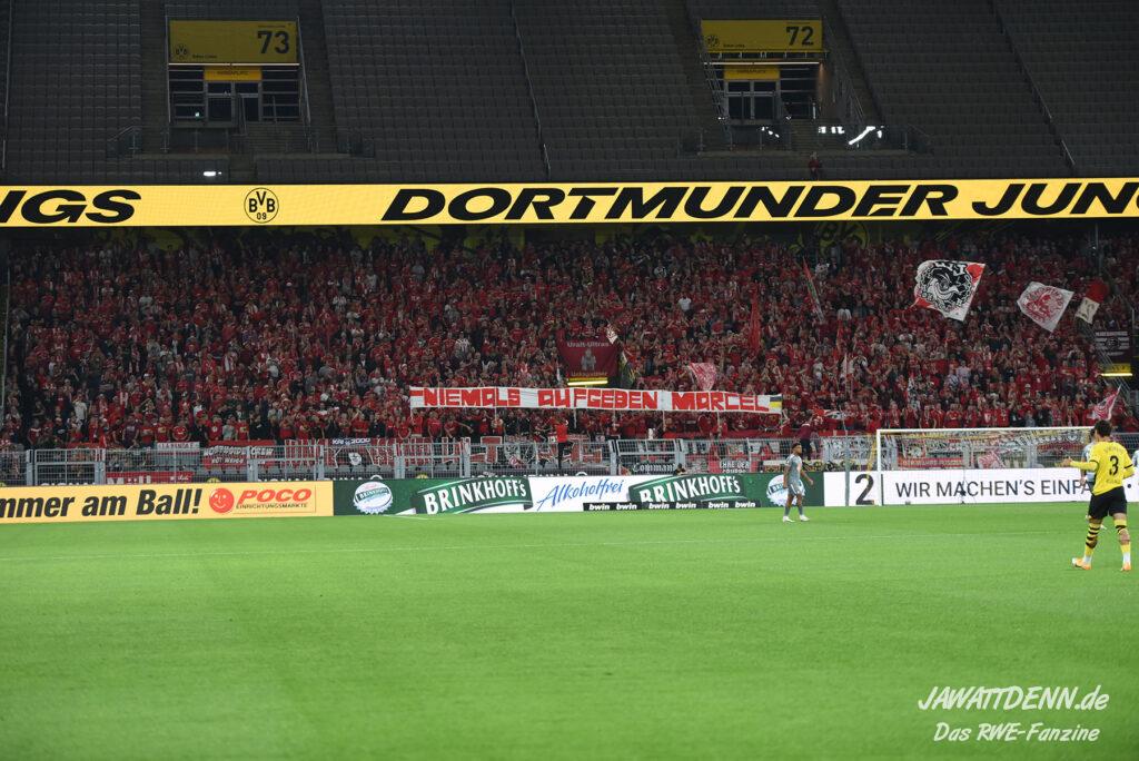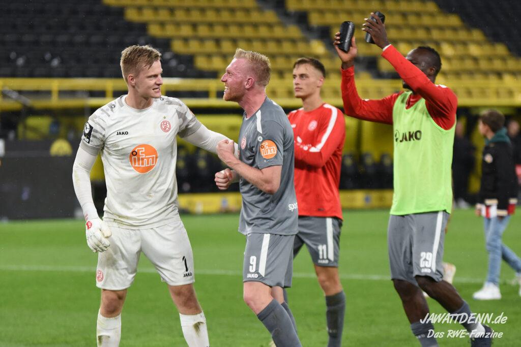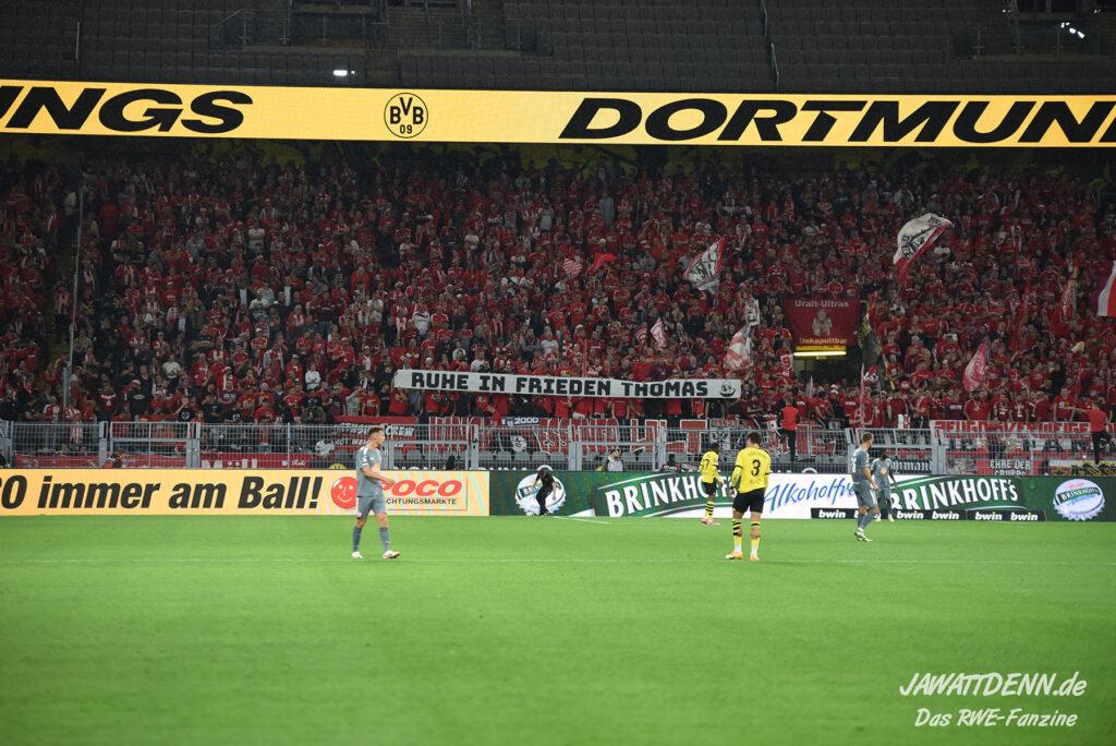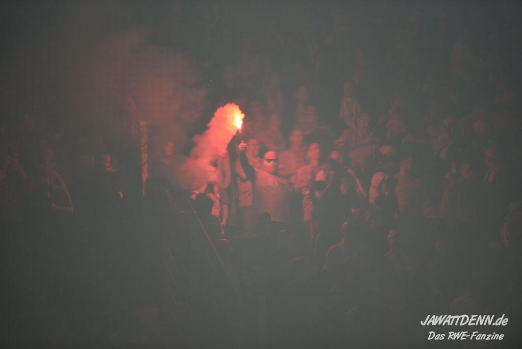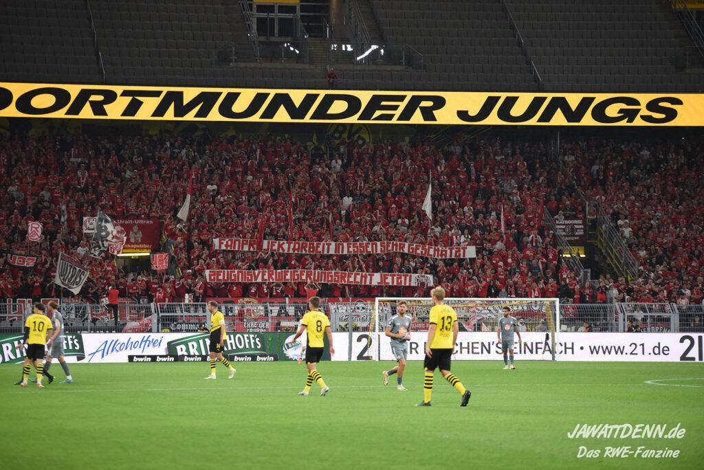 Wie gut dieser Sieg tat, war allen Essener Akteuren nach Schlusspfiff anzumerken, die Jubelszenen auf dem Rasen waren ausgelassen und auch RWE-Boss Marcus Uhlig herzte gefühlt jeden. Ganze Gesteinsbrocken purzelten von der zuletzt arg gebeutelten Essener Seele. Und das Ganze vor sagenhaft zu nennenden 17.000 Zuschauern im Westfalenstadion. Diese sahen eine starke und temporeiche Drittligapartie. Auch viele BVB-Fans gönnten sich am spielfreien Wochenende der „Ersten“ den Auftritt der „Zweiten“. Das Gros der Kulisse stellten jedoch die Essener Gäste. Offiziell hatte RWE etwa 8.000 Karten an seine Anhänger verkauft, es waren jedoch bestimmt über 10.000 Rot-Weisse, die auch Blöcke außerhalb des reinen Gästebereichs geflutet hatten. Das ging aufgrund des immer noch soliden Verhältnisses zur BVB-Fanszene problemlos.