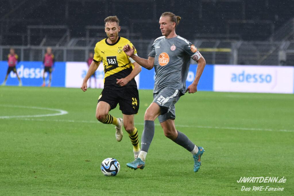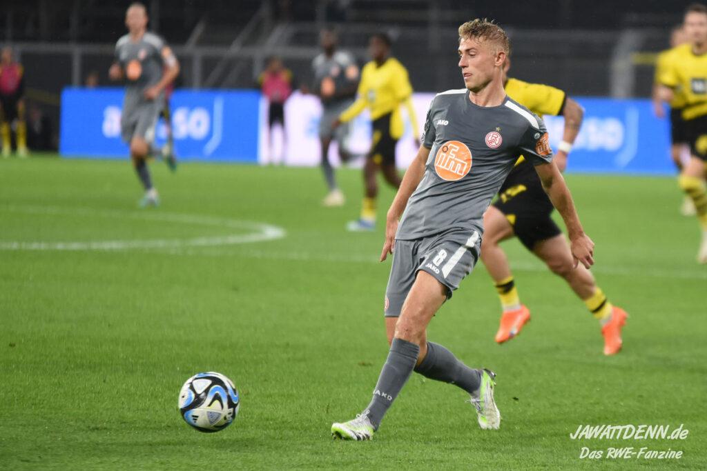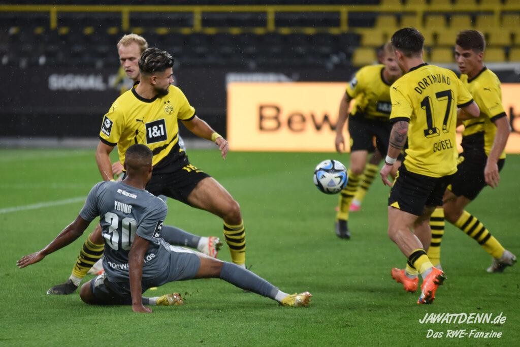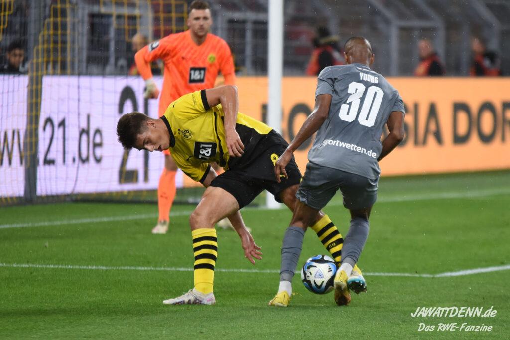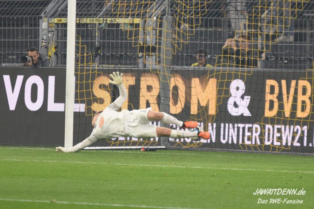Eric Voufack vertrat Andreas Wiegel formidabel und sicherte sich auch einen Scorerpunkt durch den Eckstoß zum 1:0. Dennoch hätte sich der Youngster wohl sehr geärgert, hätte sein Einsteigen gegen Bueno einen weiteren BVB-Strafstoß zur Folge gehabt, hier muss Voufack noch etwas abgezockter werden, zeigt aber insgesamt eine positive Entwicklung. Wenn es ansonsten Knackpunkte gab, so darf man höchstens ansprechen, dass RWE in den Schlussminuten, als der BVB alles nach vorne warf, kaum zweite Bälle gewinnen und für Entlastung sorgen konnte, in der Box aber dann alles kompakt verteidigte.