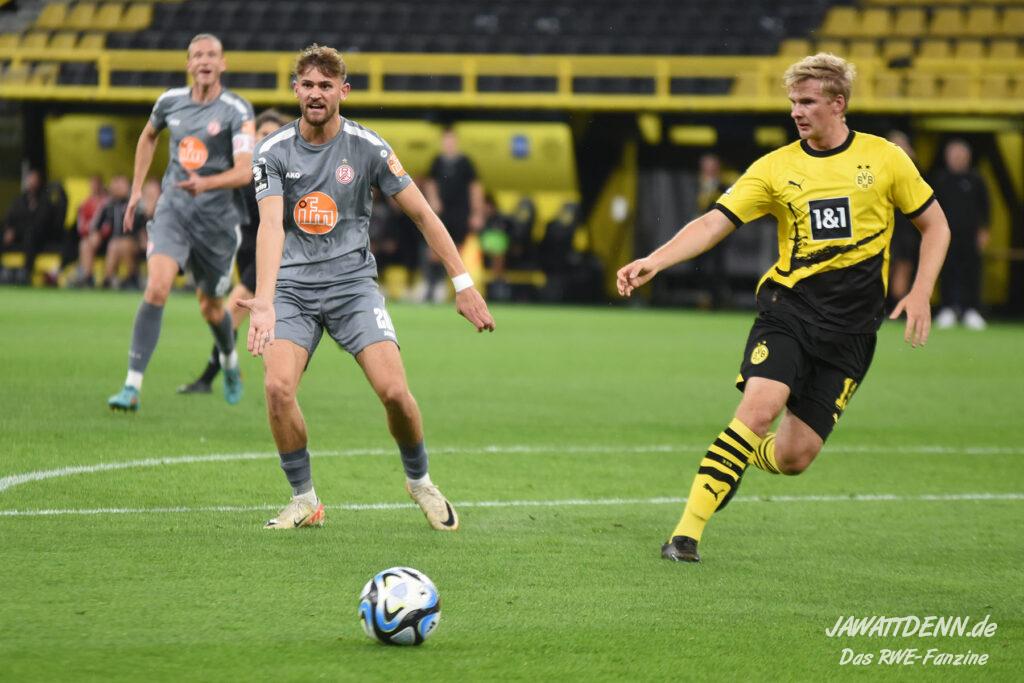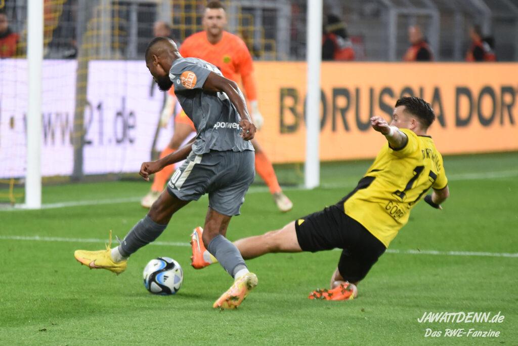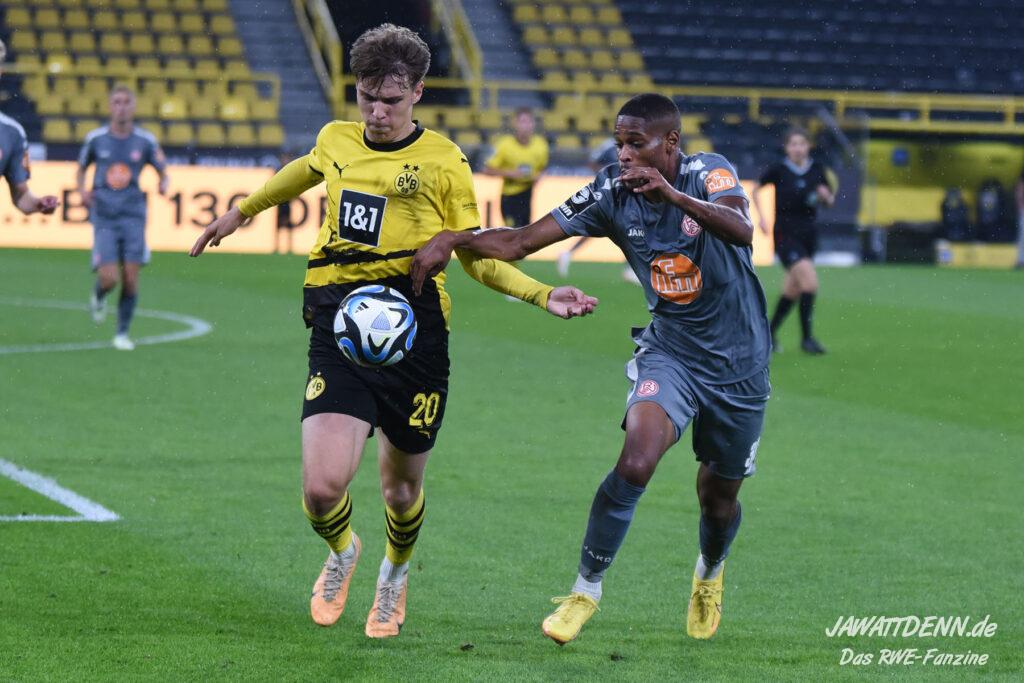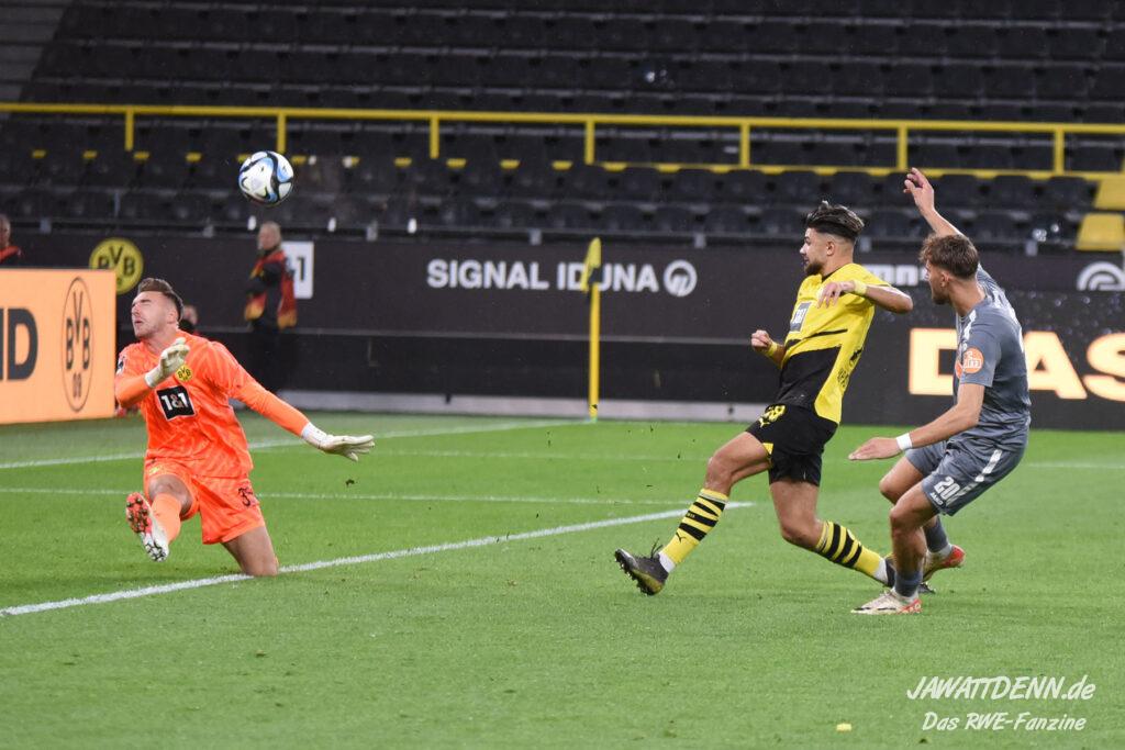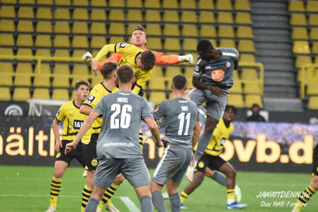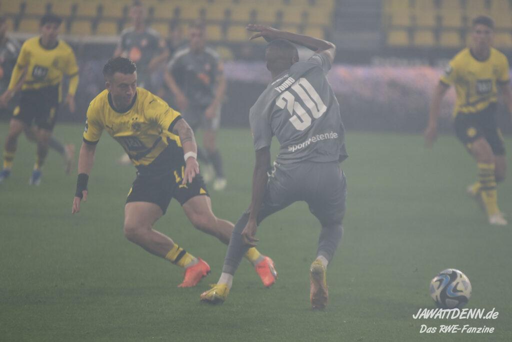 Christoph Dabrowski betonte in seiner Spielanalyse wie wichtig diese energischen und entschlossenen Läufe in die Box seien, die endlich einmal gut besetzt war. Entschlossenheit ist auch das Stichwort beim 1:0 für RWE. Einen guten Eckstoß Eric Voufacks rammte Musti Kourouma förmlich unter die Querlatte des BVB-Tores, von dort stand der Rücken von Keeper Lotka Pate, um das Leder abschließend ins Netz zu befördern. Von daher wird die Statistik eher ein Eigentor von Lotka nennen, jedoch waren die Vehemenz und Energie, mit der Musti diesen Ball und das Tor wollte, erste Sahne. Erste Sahne wie der gesamte RWE-Auftritt, bei dem kein Spieler abfiel, die Mannschaft eine Mega-Reaktion auf das Gegentor zeigte und am Ende entschlossen und mit Leidenschaft die knappe Führung verteidigt wurde.