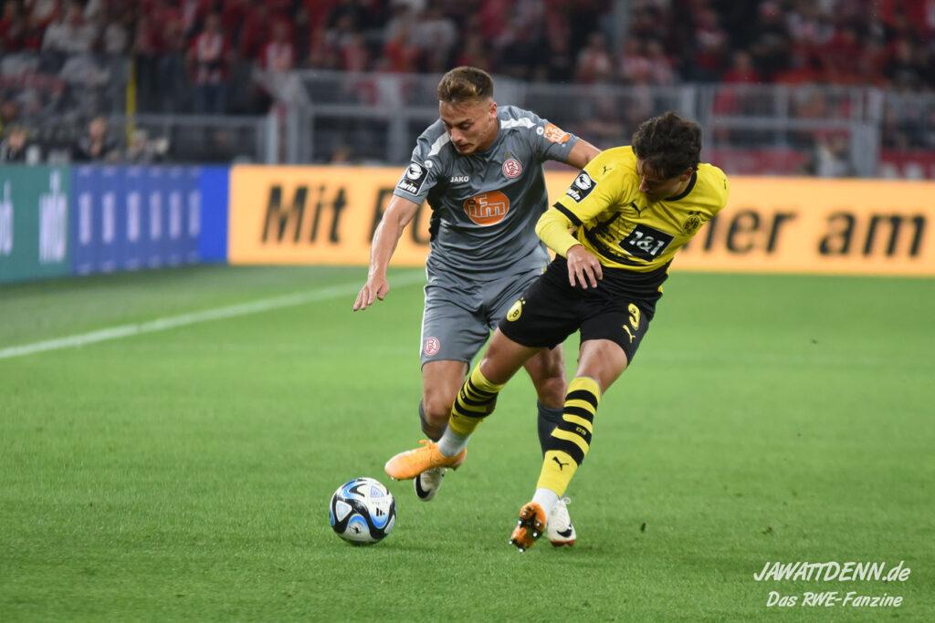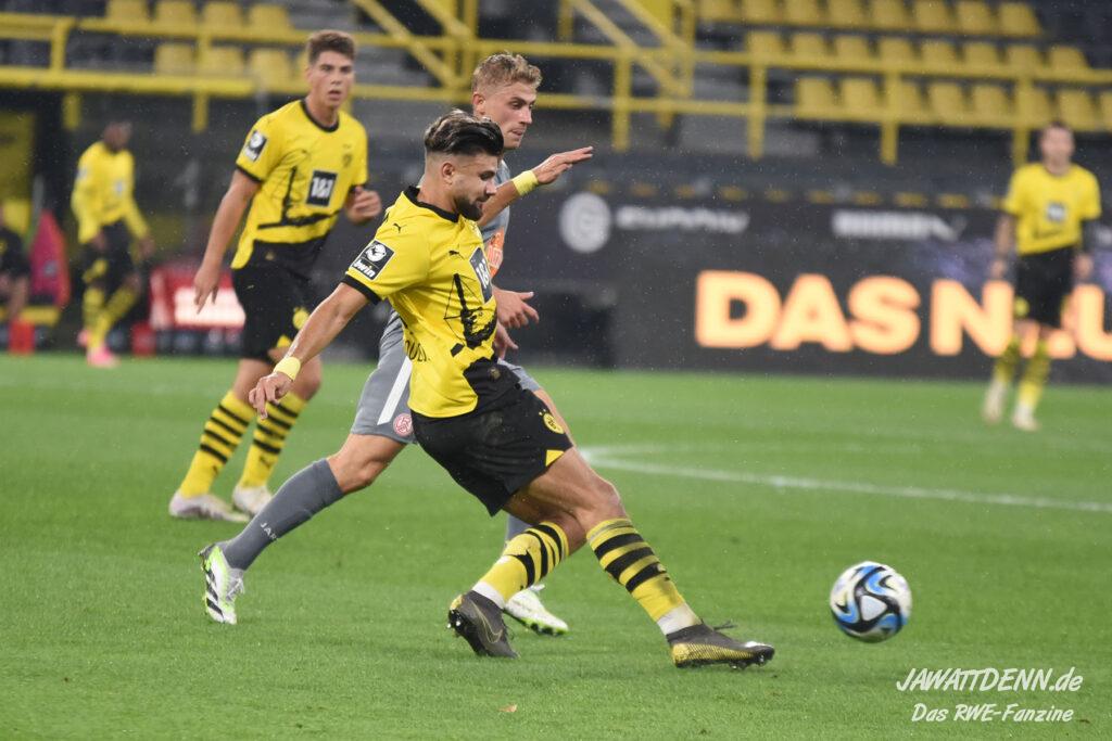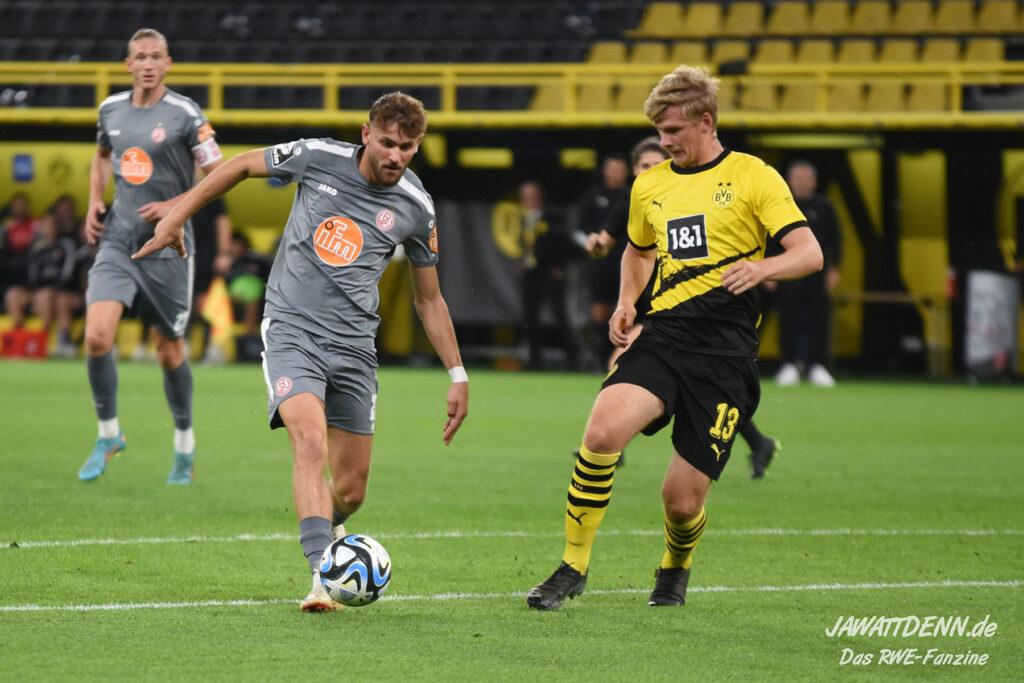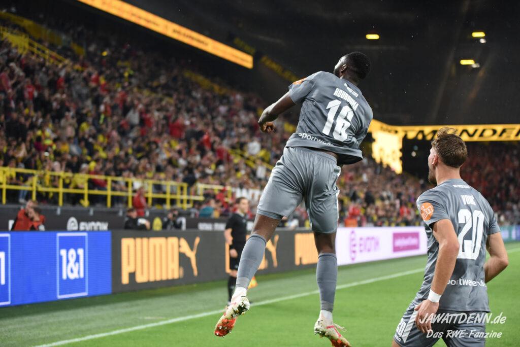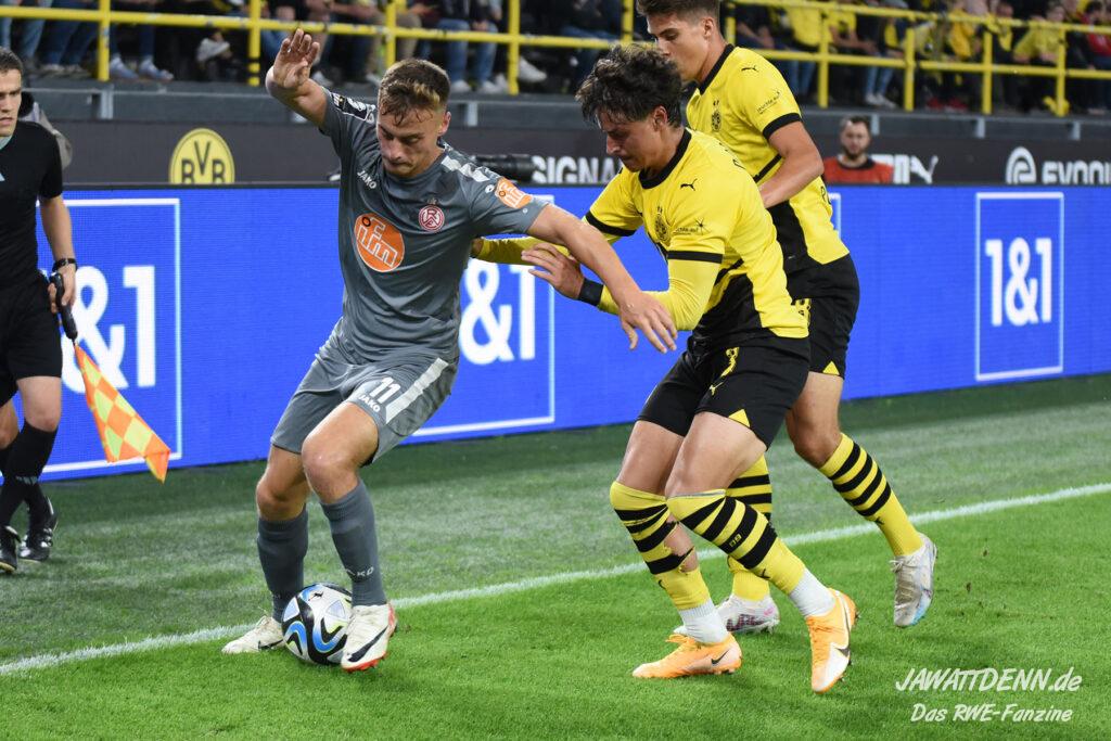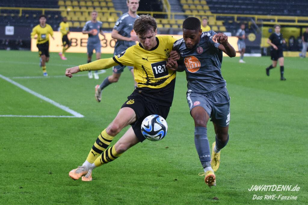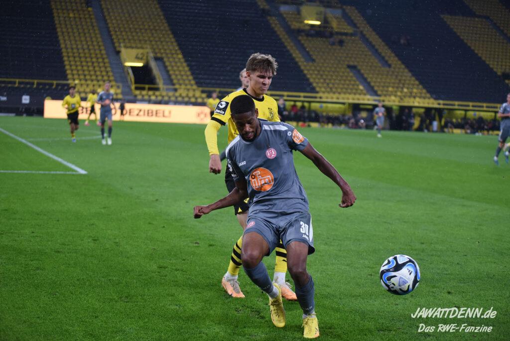 Christoph Dabrowski betonte in seiner Spielanalyse wie wichtig diese energischen und entschlossenen Läufe in die Box seien, die endlich einmal gut besetzt war. Entschlossenheit ist auch das Stichwort beim 1:0 für RWE. Einen guten Eckstoß Eric Voufacks rammte Musti Kourouma förmlich unter die Querlatte des BVB-Tores, von dort stand der Rücken von Keeper Lotka Pate, um das Leder abschließend ins Netz zu befördern. Von daher wird die Statistik eher ein Eigentor von Lotka nennen, jedoch waren die Vehemenz und Energie, mit der Musti diesen Ball und das Tor wollte, erste Sahne. Erste Sahne wie der gesamte RWE-Auftritt, bei dem kein Spieler abfiel, die Mannschaft eine Mega-Reaktion auf das Gegentor zeigte und am Ende entschlossen und mit Leidenschaft die knappe Führung verteidigt wurde.