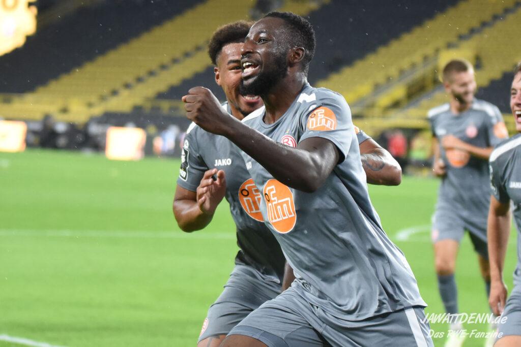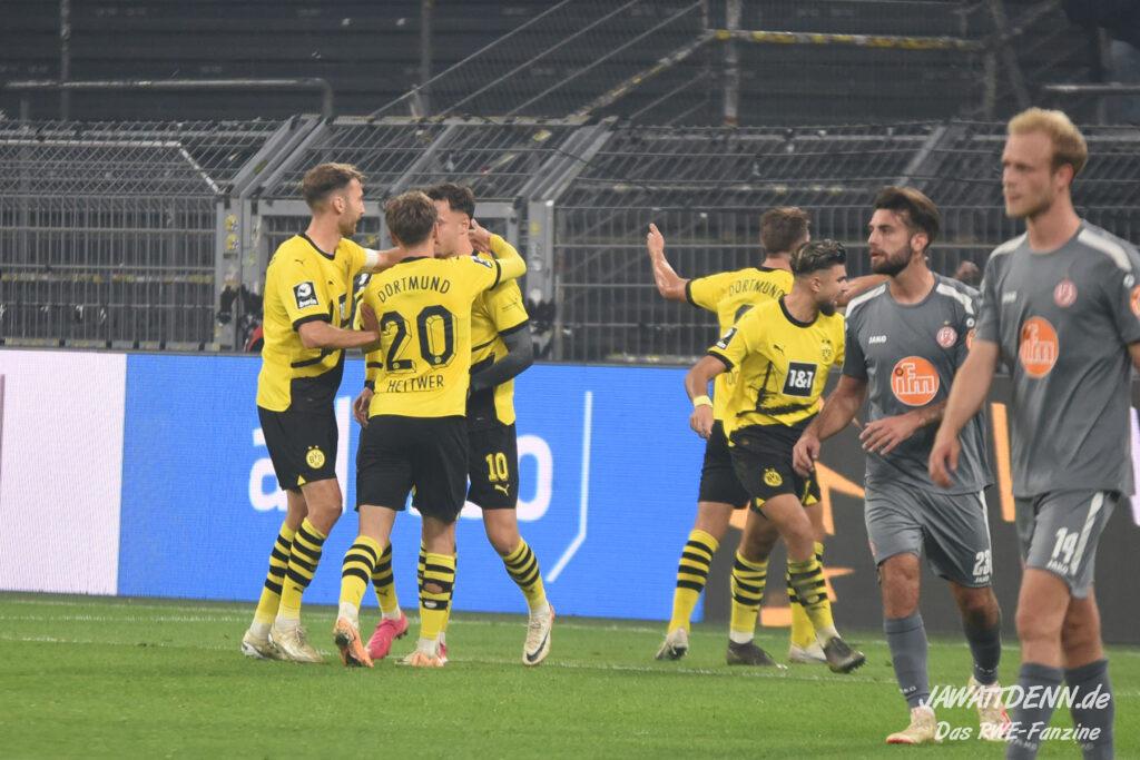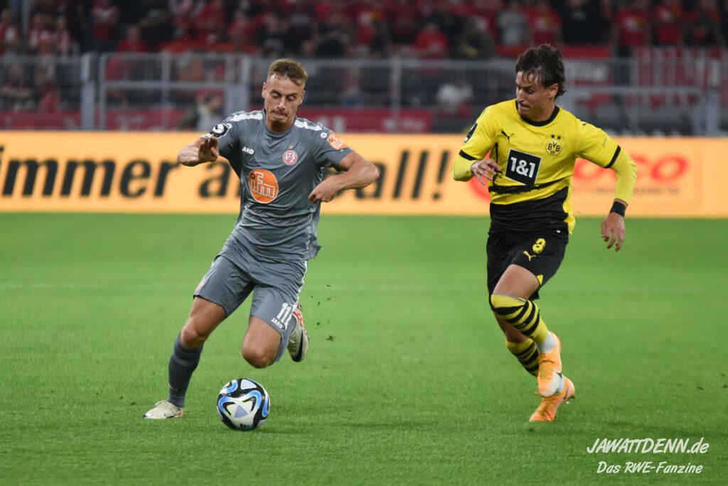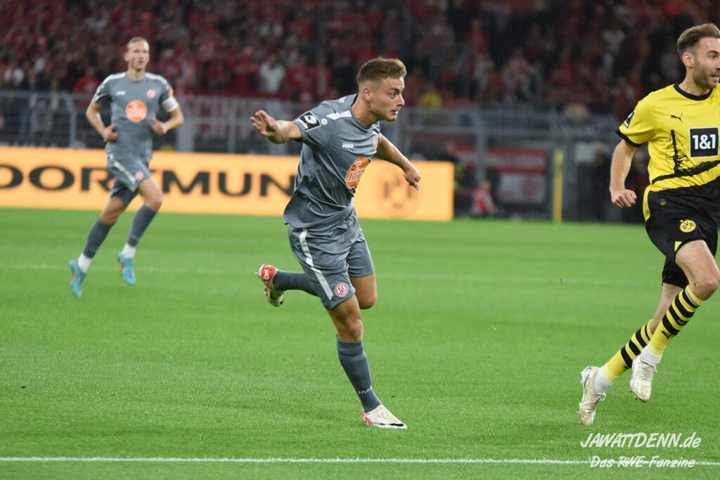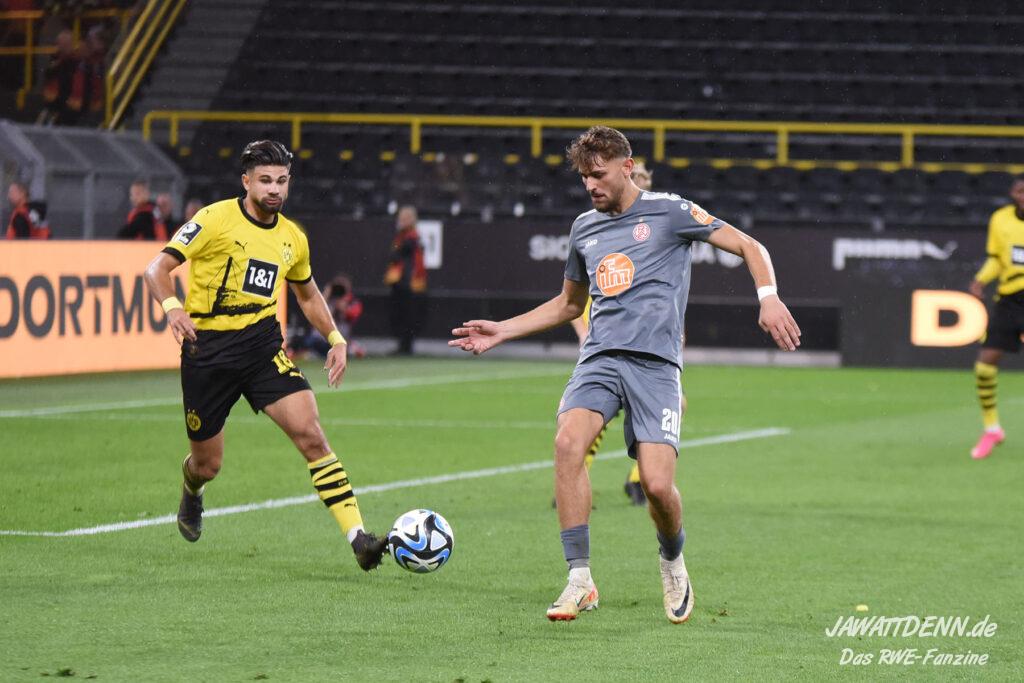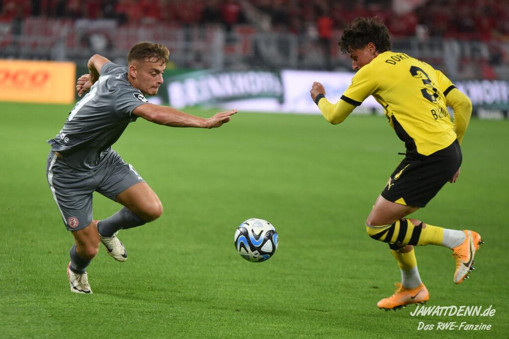 Christoph Dabrowski betonte in seiner Spielanalyse wie wichtig diese energischen und entschlossenen Läufe in die Box seien, die endlich einmal gut besetzt war. Entschlossenheit ist auch das Stichwort beim 1:0 für RWE. Einen guten Eckstoß Eric Voufacks rammte Musti Kourouma förmlich unter die Querlatte des BVB-Tores, von dort stand der Rücken von Keeper Lotka Pate, um das Leder abschließend ins Netz zu befördern. Von daher wird die Statistik eher ein Eigentor von Lotka nennen, jedoch waren die Vehemenz und Energie, mit der Musti diesen Ball und das Tor wollte, erste Sahne. Erste Sahne wie der gesamte RWE-Auftritt, bei dem kein Spieler abfiel, die Mannschaft eine Mega-Reaktion auf das Gegentor zeigte und am Ende entschlossen und mit Leidenschaft die knappe Führung verteidigt wurde.