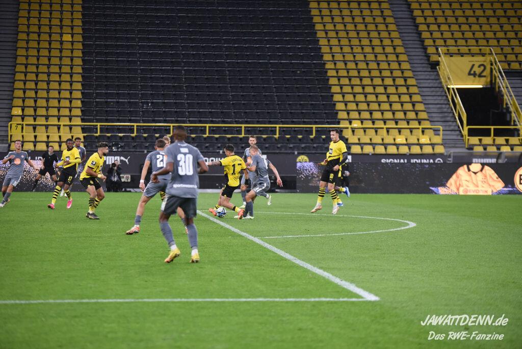 Die jungen Dortmunder haben vor allem in der Offensive beeindruckend früh ein gutes Zusammenspiel ihrer Stürmer entwickelt, die durch ein schnelles Umschaltspiel in Szene gesetzt werden. Sowohl in Bielefeld als auch im Spiel gegen Duisburg werden die Abwehrreihen nahezu überrannt, doch gerade gegen den MSV wurde auch Chancenwucher betrieben. Viele Spielern sind topausgebildet und wissen genau, wo sie den Schnittstellenpass hinsetzen müssen und wirken bei Fehlern des Gegners sehr abgezockt. Hier kommt es auf die Essener Zentrale an, keine einfachen Ballverluste im Spielaufbau zu generieren, ansonsten wird es schwer werden, der jungen Offensive hinterherzukommen. Auch wenn die Abwehr des BVB eine gute Rolle spielt, fällt schon auf, dass die Zuordnungen ähnlich wie bei den jungen Freiburgern nicht immer hundertprozentig stimmen. In Bielefeld fallen beide Tore nach einem Standard, die Dortmunder Spieler stehen dabei aufgereiht mit neun Mann am Fünfmeterraum. Das erste Tor fällt etwas glücklich nach einem Distanzschuss, beim zweiten Treffer kann der Torschütze sich aber gegen gleich fünf benachbarten Abwehrspieler durchsetzen. Gerade diese Anfälligkeit muss RWE nutzen, da aus dem Spiel heraus zurzeit wenig passiert. Wenn RWE aber gefährliche Situationen durch den ruhenden Ball erzeugt, kann dies ein Mittel zum Erfolg werden.