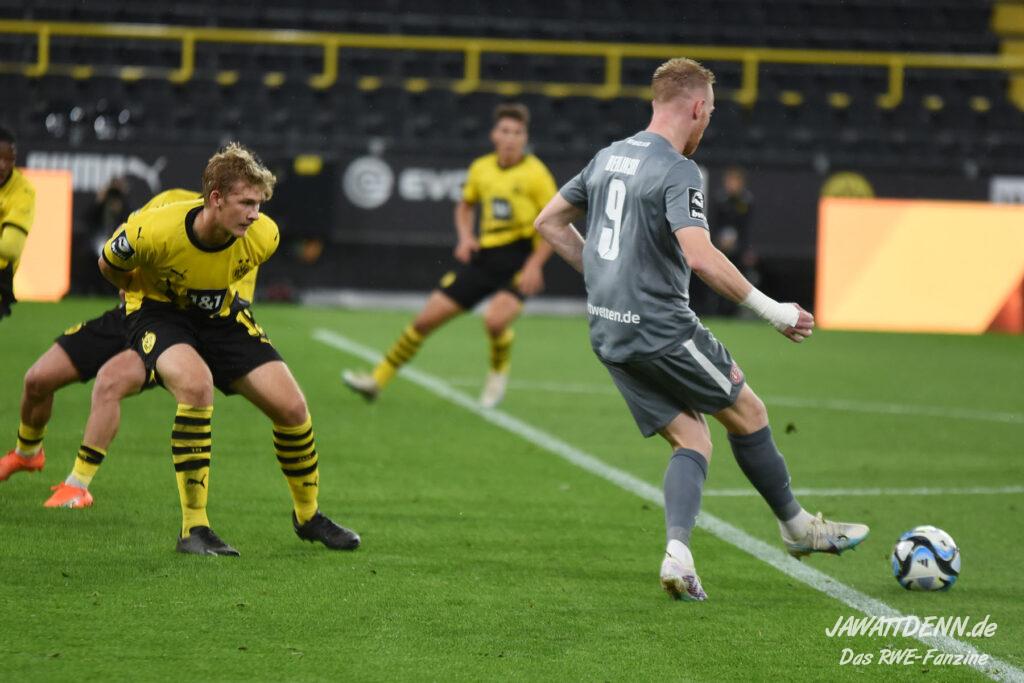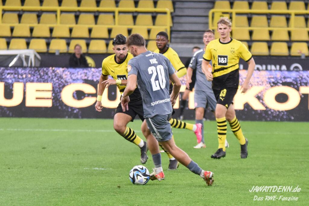 Auch über die Flügel überzeugte RWE. Dabei war die linke Seite mit Lucas Brumme und einem wiedererstarkten Isi Young überragend. Während Isi endlich wieder seinen Gegenspieler mehrfach vernaschte, machte Brumme hinten dicht und marschierte nach vorne wie eine kaum zu bremsende Dampframme. So fiel auch Essens Siegtreffer zum 2:1. RWE ließ sich durch den Dortmunder Ausgleichstreffer nicht verunsichern. Zunächst wurde wieder ruhig hinten rausgespielt, dann übernahm Brumme die Kugel, spielte kurz auf Young und bekam das Leder sofort zurück, eine Finte, die den Raum für den nun folgenden unwiderstehlichen Antritt Brummes öffnete. Wie ein heißes Messer durch die Butter zog die rot-weisse 14 die linke Bahn entlang und umkurvte die unentschlossen wirkenden Schwarz-Gelben wie Slalomstangen. Bis fast an die Box und genau auf die Grundlinie zog Brumme, dann flankte er in den Rücken der Abwehr und fand den energisch einrückenden Torben Müsel, der das Leder sträflich frei genüsslich einköpfte und sich mit seinem zweiten Saisontreffer an die Spitze der Essener Torschützen setzte.