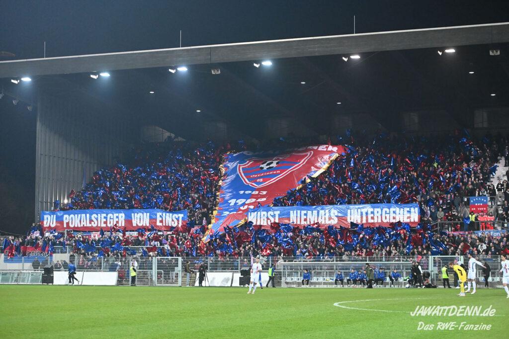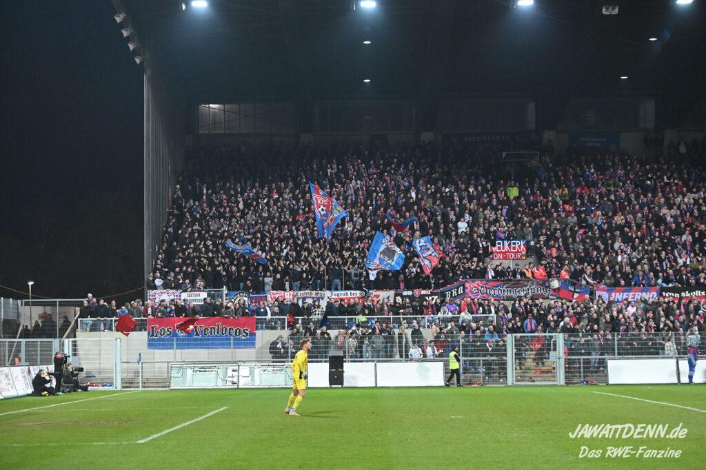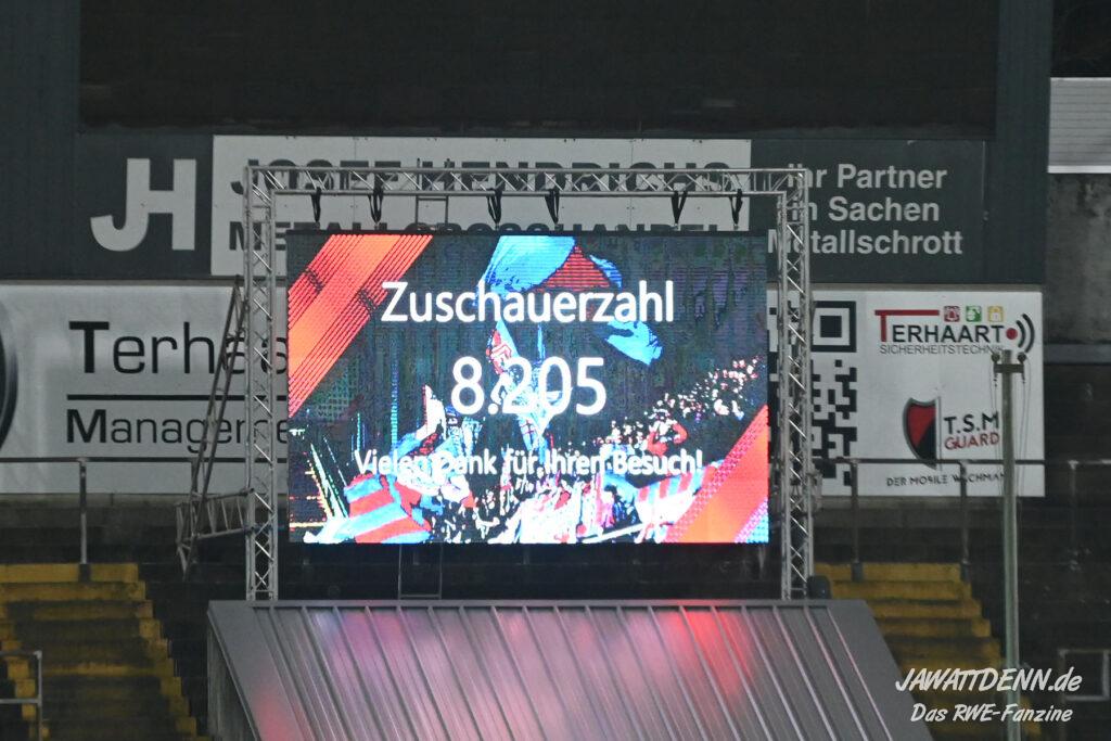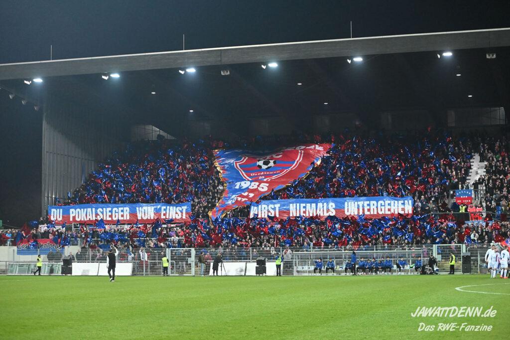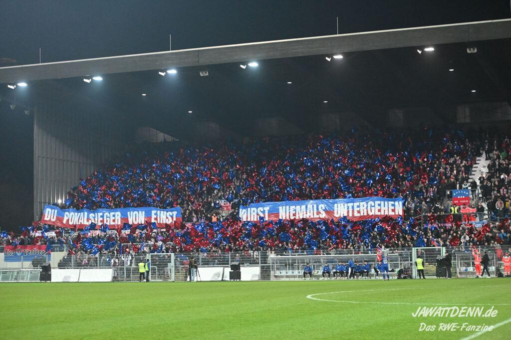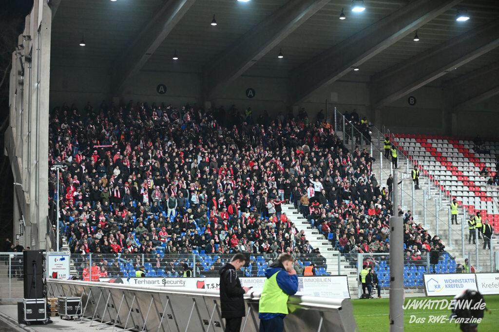 Trotz dieser Spitze gegen den KFC war der Besuch an der Grotenburg ein schönes Erlebnis, mit denen sich nostalgische Gefühle verbinden. Allein die steilen Aufgänge zu den Tribünen und die markanten Flutlichter, deren Lichter noch von Weiten für ein wärmendes Gefühl im Rücken beim Verlassen des Stadions sorgten, lässt jedes Fußballfanherz höherschlagen. Dazu war die Kulisse mit knapp 8.200 Zuschauern ein toller Rahmen für das Viertelfinale eines Verbandspokals, dies sucht deutschlandweit seinesgleichen. Die Fans des KFC verliehen mit ihrer Choreo ein Hauch von den guten alten Zeiten, in denen sich der Verein mal befand, bevor er seine Seele an einen Investor verkaufte. Trotz all der Nostalgie bleibt zu hoffen, dass sich unsere Ausflüge auf den Niederrheinpokal beschränken.