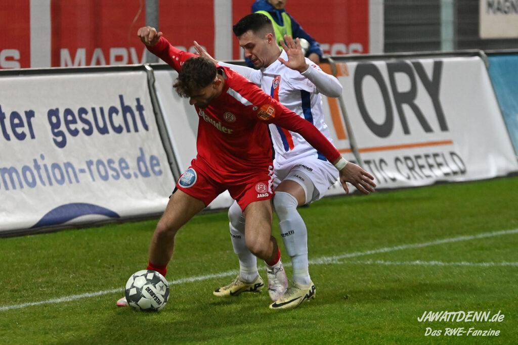 Besorgniserregender waren allerdings einmal mehr die Defizite in unserer Viererkette erkennbar. Jeder der vier Spieler hatte Böcke im Spiel, so dass das Umschaltspiel des KFC für höchste Brandgefahr vor dem Kasten von Wienand sorgte. Neben dem andauernden Wegrutschen auf einem Rasen, den die Verantwortlichen gerne als Prämie für den Sieg an die Hafenstraße mitgenommen hätten, gab es ordentlich viele Stellungsfehler, die vom KFC direkt in der 14. Minute eiskalt ausgenutzt wurden. Kourouma stand dabei viel zu weit weg von Gegenspieler Touratzidis, der keine Probleme hatte, Wienand aus kürzester Distanz zu überwinden. Auch danach fiel der Yougster in einer schwachen Verteidigungskette noch negativ auf. Immer stand er ein wenig zu weit rechts, als ob er auf der Außenbahn Routinier Wiegel unterstützen musste und so ordentlich Raum für die KFC-Doppelspitze gab. Sinnbildlich war auch eine Aktion vor der Pause, wo plötzlich Kourouma kurz vor dem gegnerischen Strafraum auf der rechten Seite eine Flanke schlug, die postwendend zurückkam und der Angriff des KFC glücklicherweise im Mittelfeld verhungerte. Es bleibt die große Frage, warum ein Innenverteidiger die Aufgaben seines rechten Flügelmanns übernehmen und dieser dann als letzte Absicherung fungieren sollte. Wahrscheinlich war auch der Trainer damit beschäftigt und nahm den schwachen Wiegel zur Halbzeit aus dem Spiel.