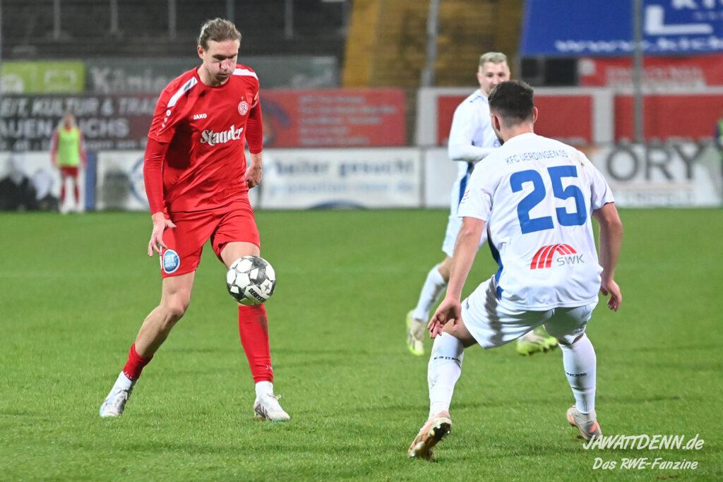 Cedric belebte die Partie durch seinen Passstärke und Dribblings, die endlich das Spiel etwas schneller machen sollte. Allerdings war es eine Kombination aus Einzelaktion und Towartfehler, die das Spiel zugunsten von RWE drehte. Nach Zuspiel von Sapina hatte Brumme plötzlich viel Platz und zog aus 25 Metern einfach mal ab, Towart Gomoluch half mit seinen Fäusten, den Ball über die Linie zu boxen. Danach war auch das Essener Publikum wach und sorgte für die nötige Unterstützung zum Aufbau einer richtigen Angriffswelle. Nach fünf dicken Chancen im Minutentakt (Vonic/Doumbouya 64., Obuz 65., Eisfeld 69., Müsel 71. und Vonic plus Latte 72.) erlöste Harenbrock den Drittligisten im Anschluss an einer perfekten Flanke von Voelcke mit dem Kopf. Danach suchte RWE weiter das Heil in der Offensive, gewann die Zweikämpfe schon im Mittelfeld und ließ den Uerdingern kaum Zeit zum Atmen. Wieder einmal ist diese unglaubliche Moral der Mannschaft zu loben, sich auch aus brenzligen Situationen selbst herauszuziehen. Dies war auch bitter nötig, denn der Auftritt in der ersten Hälfte war des Teams von der Hafenstraße nicht würdig.