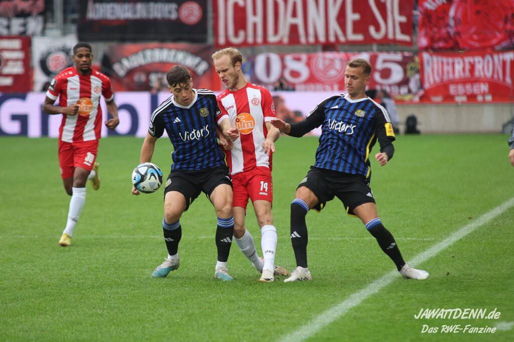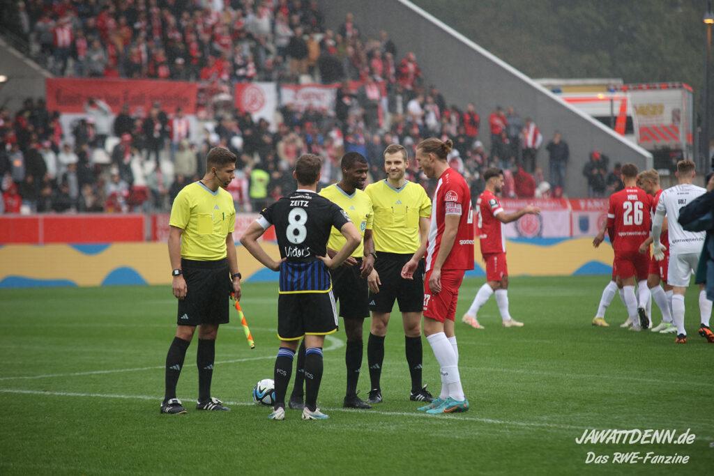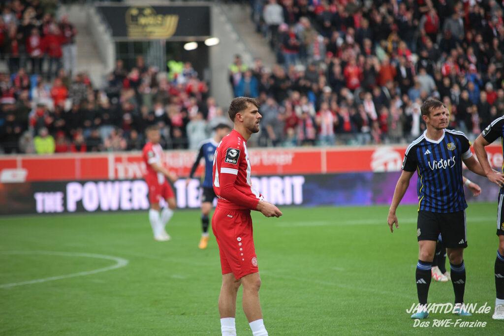 Umgekehrt hatte RWE in der Schlussphase Glück, denn Sandro Plechaty hatte sich bei Ahmet Arslan die Tätlichkeit aus der Vorsaison abgeschaut und trat Fabio Di Michele Sanchez absichtlich auf den Fuß. Das wäre ehrlicherweise eine rote Karte gewesen. Am Ende kann man dem Team gratulieren, dass es sich von der eigenwilligen Spielführung nicht hat aus dem Konzept bringen lassen.