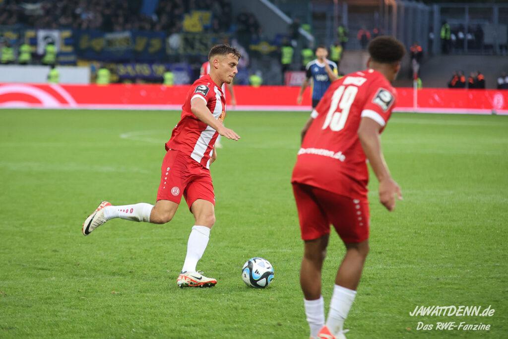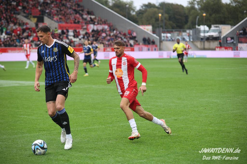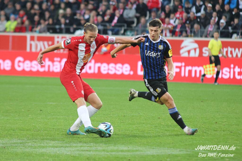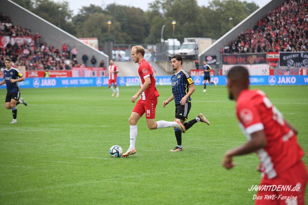 Einmal durchatmen mussten die RWE-Fans in der 27. Minute, denn da musste Lucas Brumme verletzungsbedingt ausgewechselt werden. Der Motor auf der linken Seite wurde bereits in diesem Spiel vermisst. Nichtsdestotrotz zeigte der junge Voelcke gerade defensiv ein blitzsauberes Spiel und vernaschte mehrfach seine Gegenspieler und leitete damit Gegenangriffe ein.