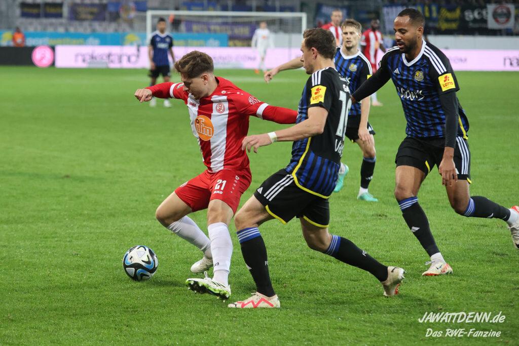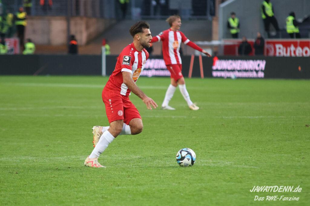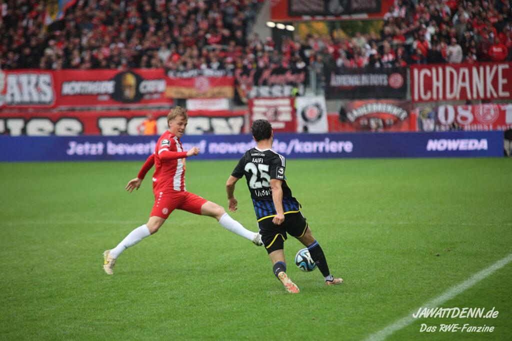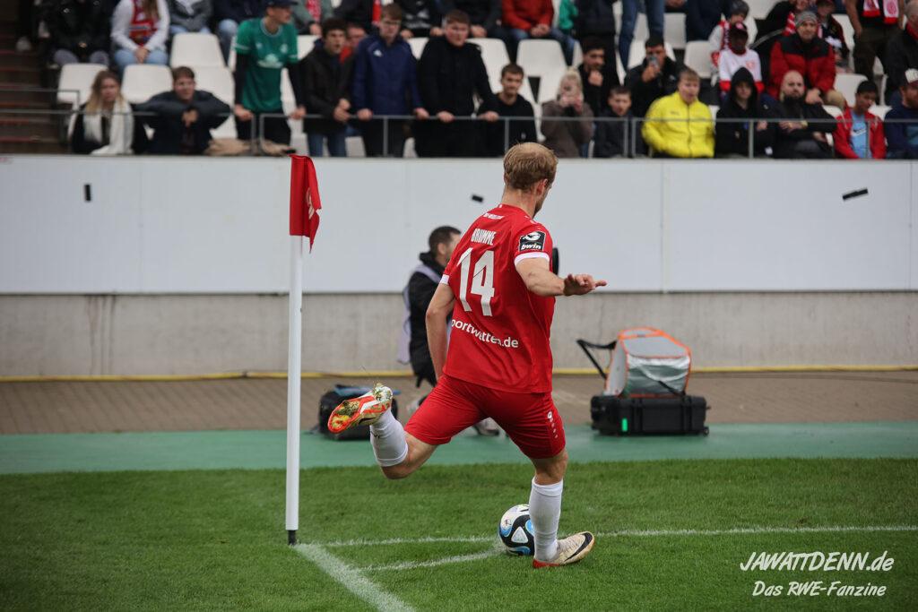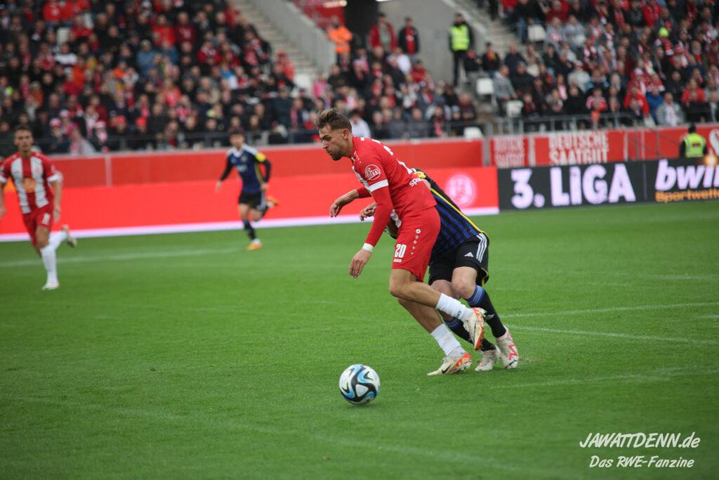 Einmal durchatmen mussten die RWE-Fans in der 27. Minute, denn da musste Lucas Brumme verletzungsbedingt ausgewechselt werden. Der Motor auf der linken Seite wurde bereits in diesem Spiel vermisst. Nichtsdestotrotz zeigte der junge Voelcke gerade defensiv ein blitzsauberes Spiel und vernaschte mehrfach seine Gegenspieler und leitete damit Gegenangriffe ein.