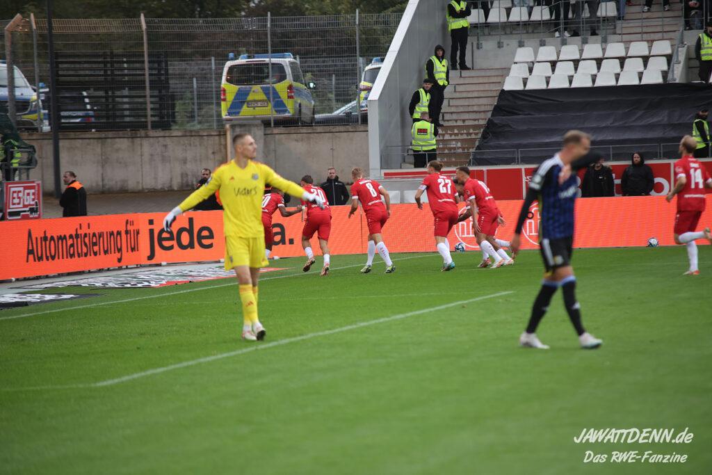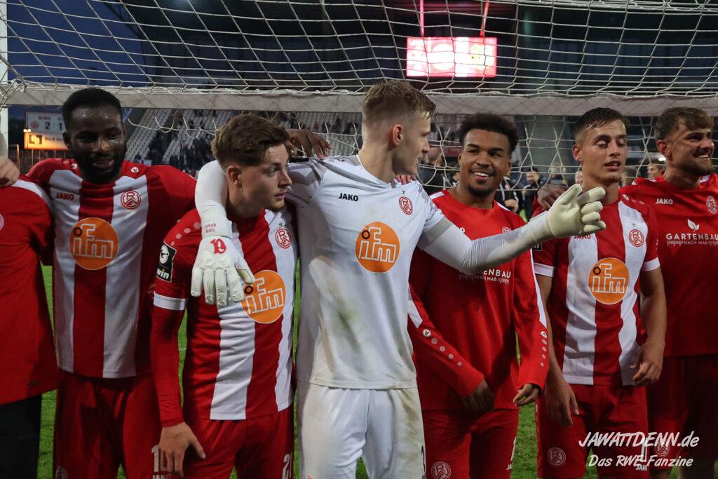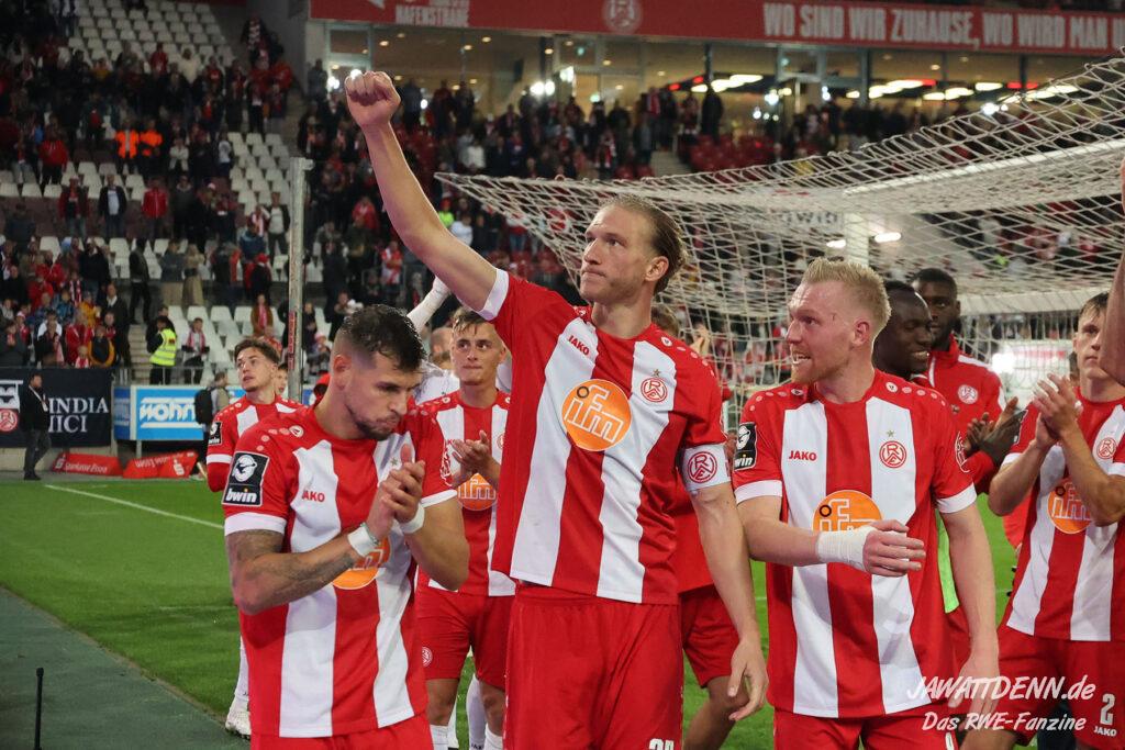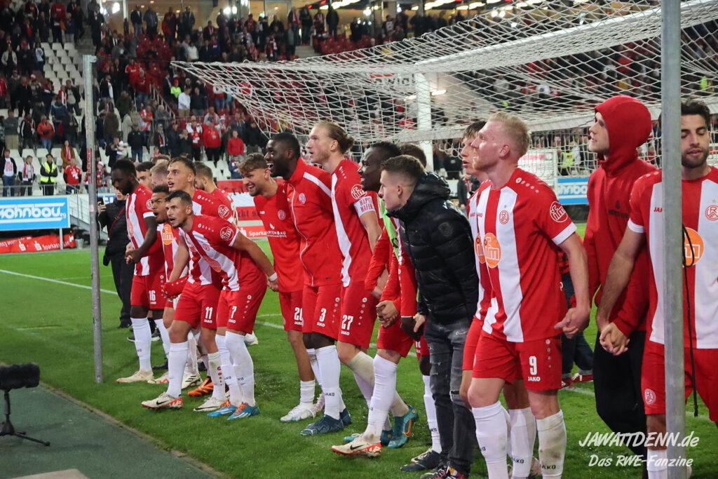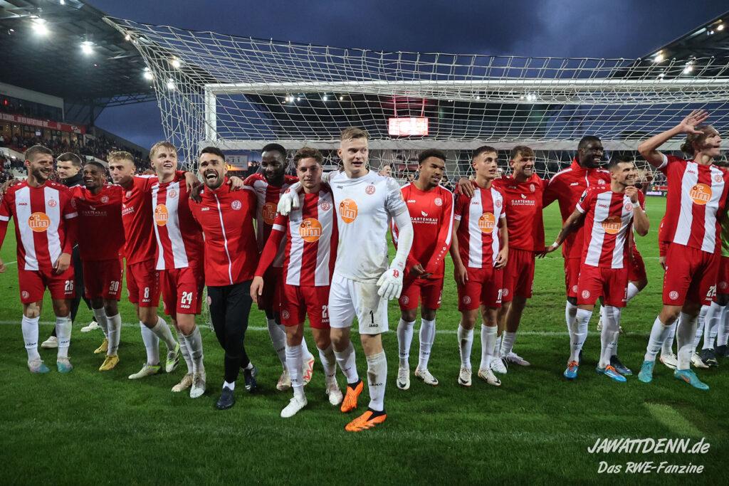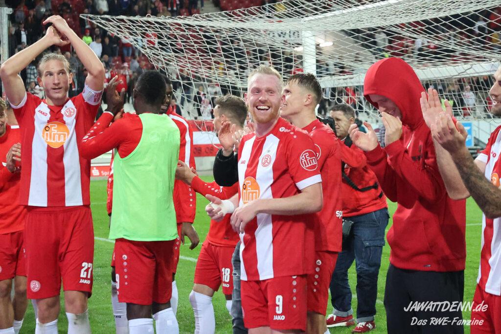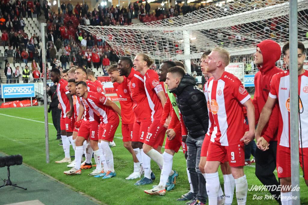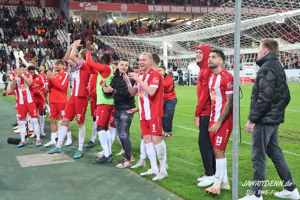Insgesamt zeigte RWE in der zweiten Hälfte eine kämpferische Leistung, die anerkennenswert ist. Symbolisch dafür kann die Arbeit an der Eckfahne genommen werden, bei der das Team beinahe zwei der fünf Minuten Nachspielzeit von der Uhr nahm. Dafür durften sich die Spieler zurecht nach Spielschluss feiern lassen.