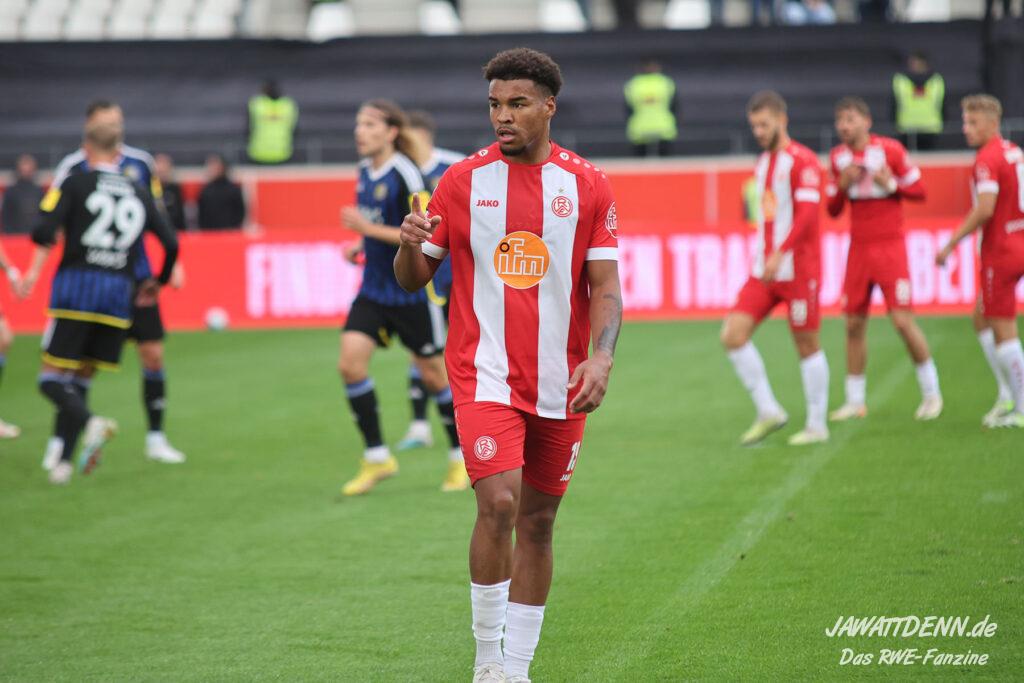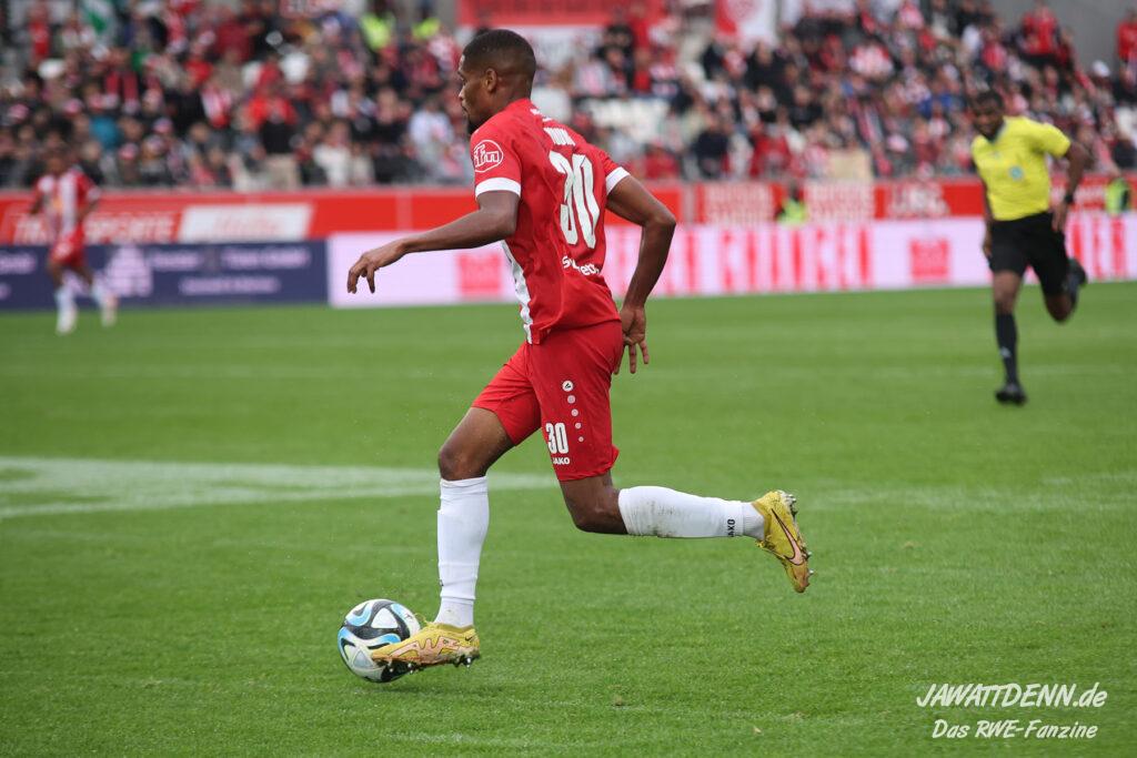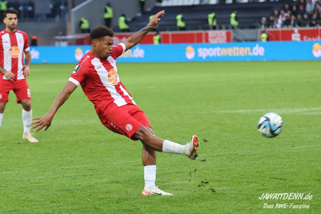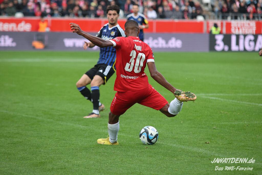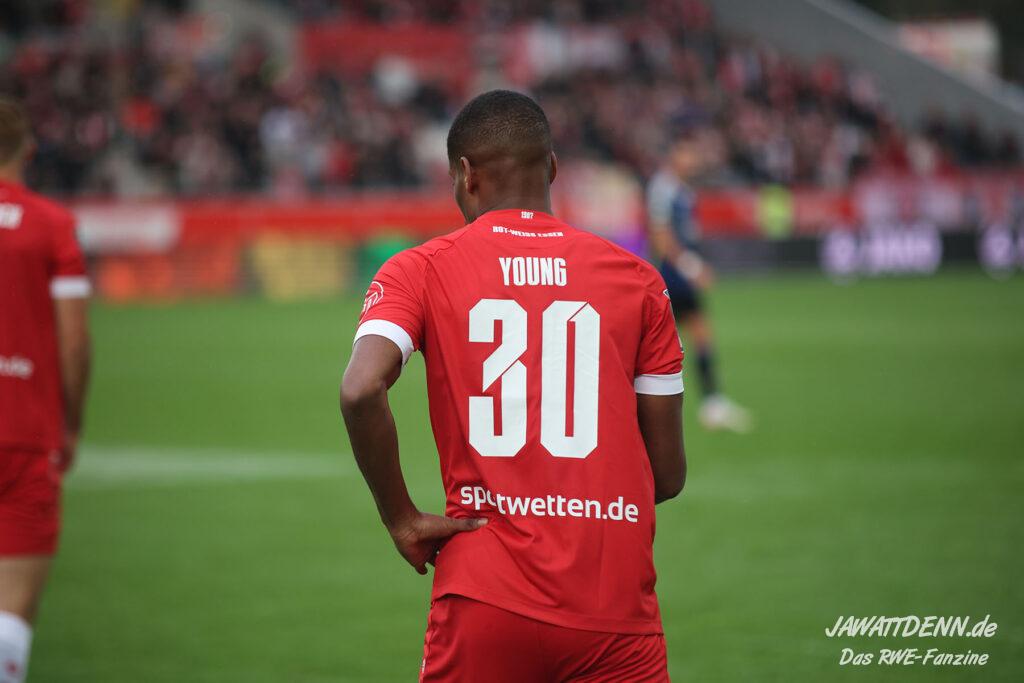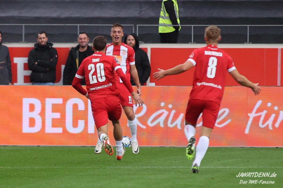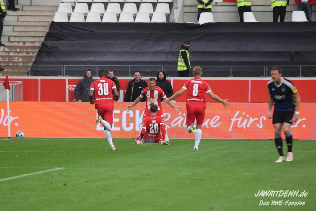 RWE legte furios los und zeigte eine wirklich starke halbe Stunde. Es erinnerte zeitweise an den dominanten Auftritt gegen Regensburg, nur mit dem Unterschied, dass RWE seine Leistung dieses Mal vergoldete. Nach nicht einmal sieben Minuten legte Eric Voufack nach langem Zuspiel von Torben Müsel auf Marvin Obuz ab, der den Ball perfekt in den Strafraum flankte. Von hinten setzte Isaiah Young zum Flugkopfball an und versenkte den Ball in den Maschen. Young zeigte sich wie gegen Dortmund sehr stark und belohnte sich selbst.