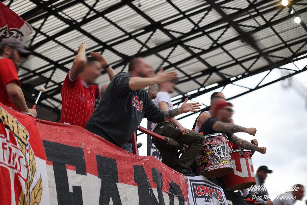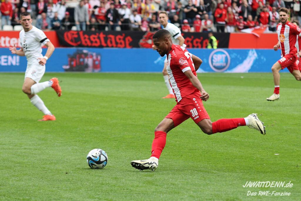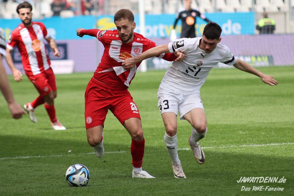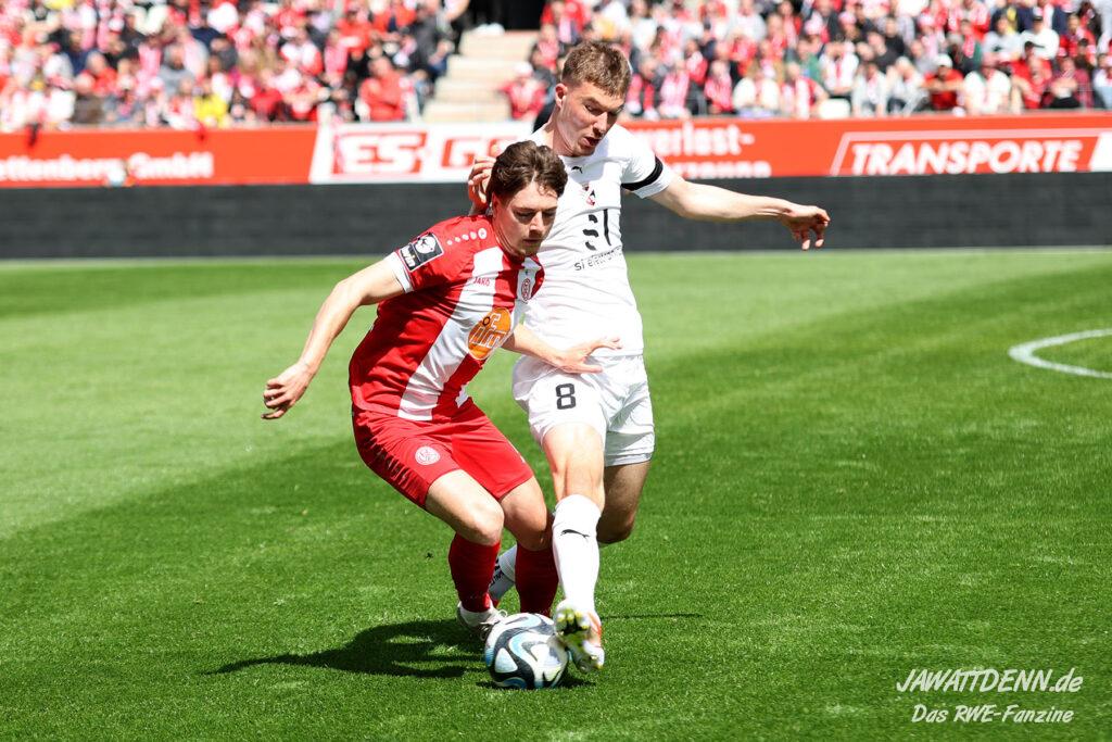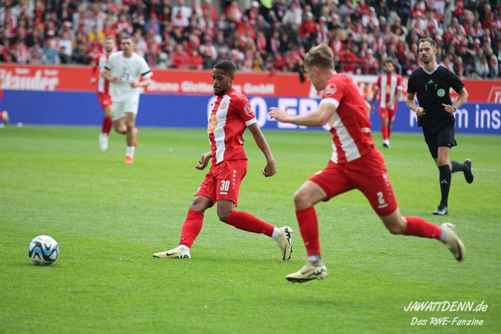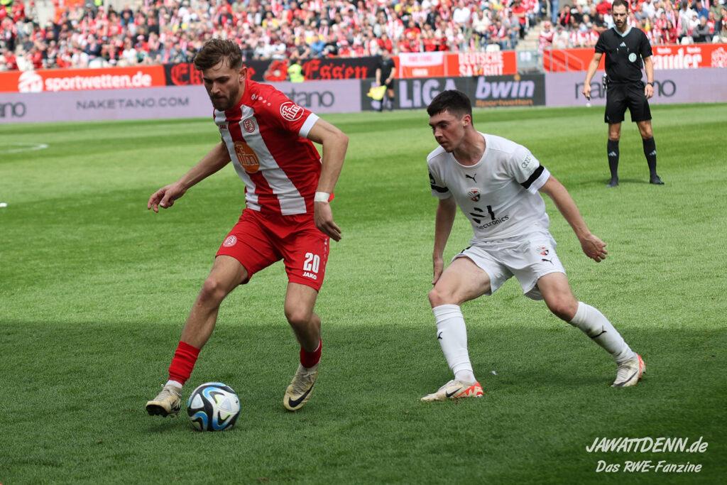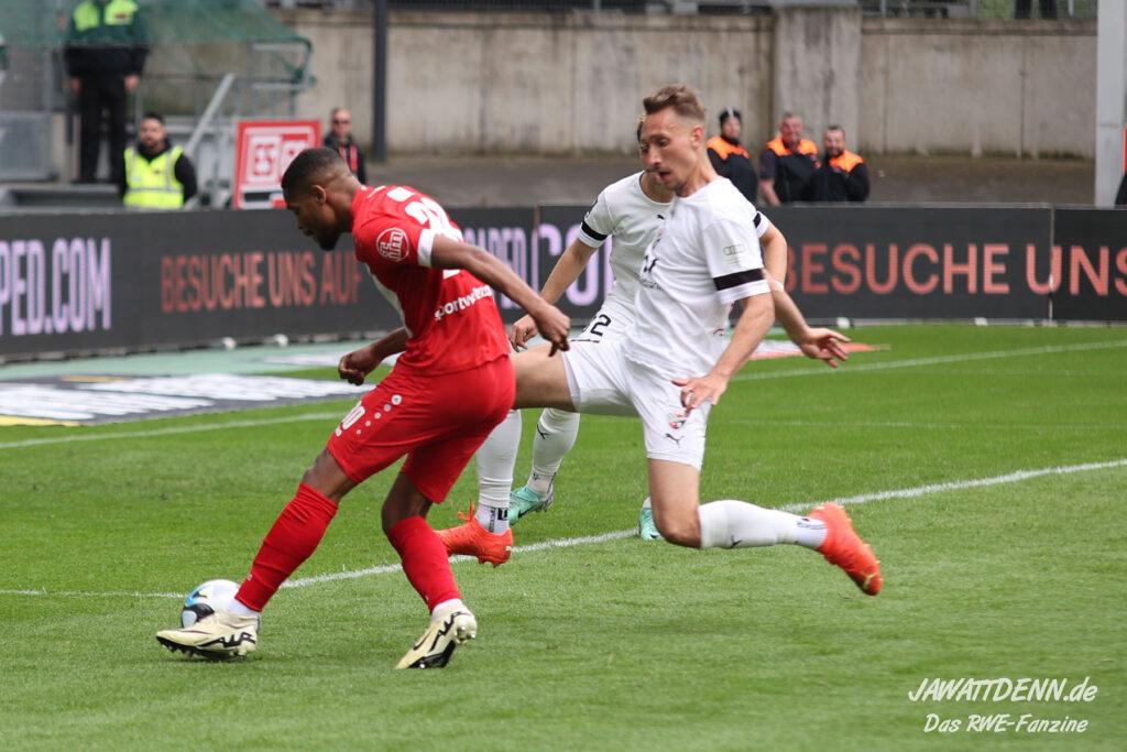 RWE hielt nicht nur den Ball flach, neues Parademittel dabei der von Außen scharf und präzise in die Box gespielte Ball, sondern machte diesen auch immer wieder schnell. Extreme Ballsicherheit verschafft RWE im ersten Drittel neben den ruhig aufbauenden Innenverteidigern Götze und Alonso der immer stärker aufspielende Torben Müsel, der nahezu nicht vom Ball zu trennen ist. Was das rot-weisse Herz hüpfen lässt ist auch die Art und Weise, wie eigentlich lange abgeschriebene Spieler wie Voelcke, Kaiser und Plechaty ihre Chance in beeindruckender Weise nutzen.
